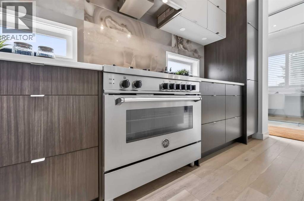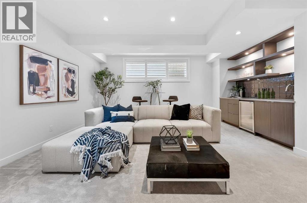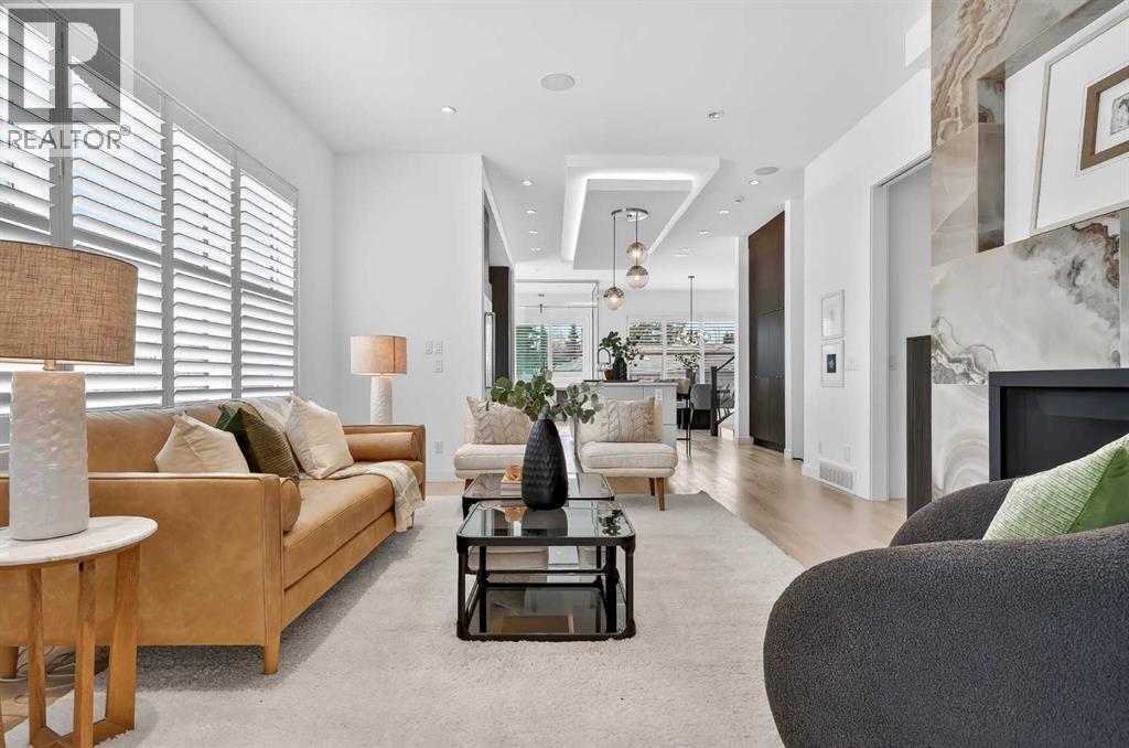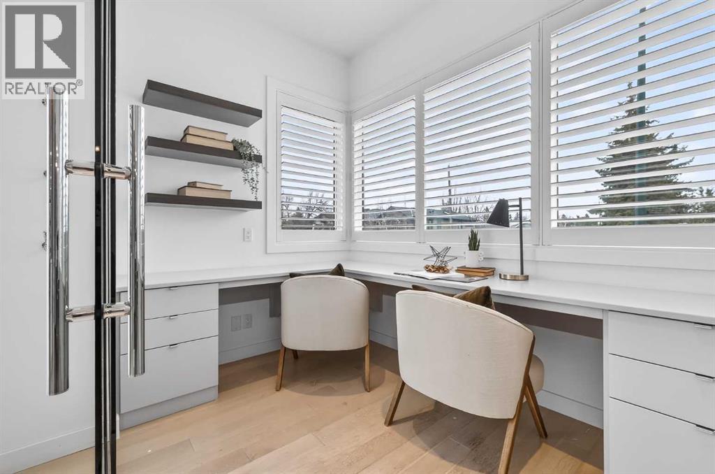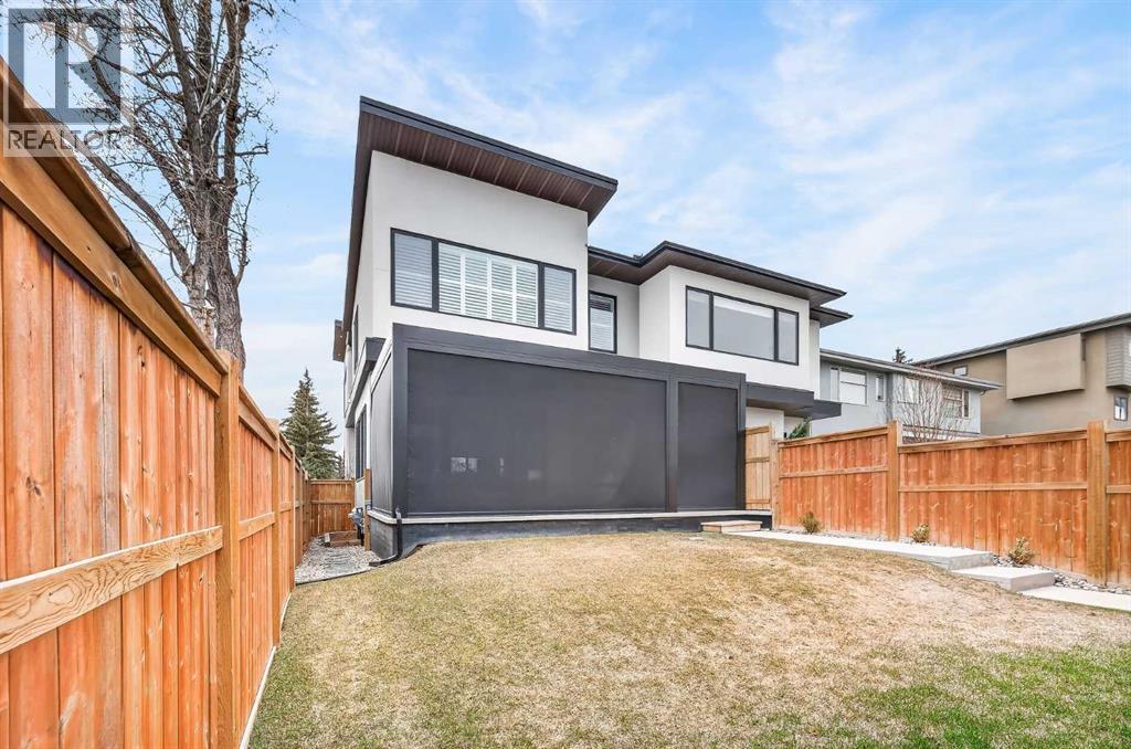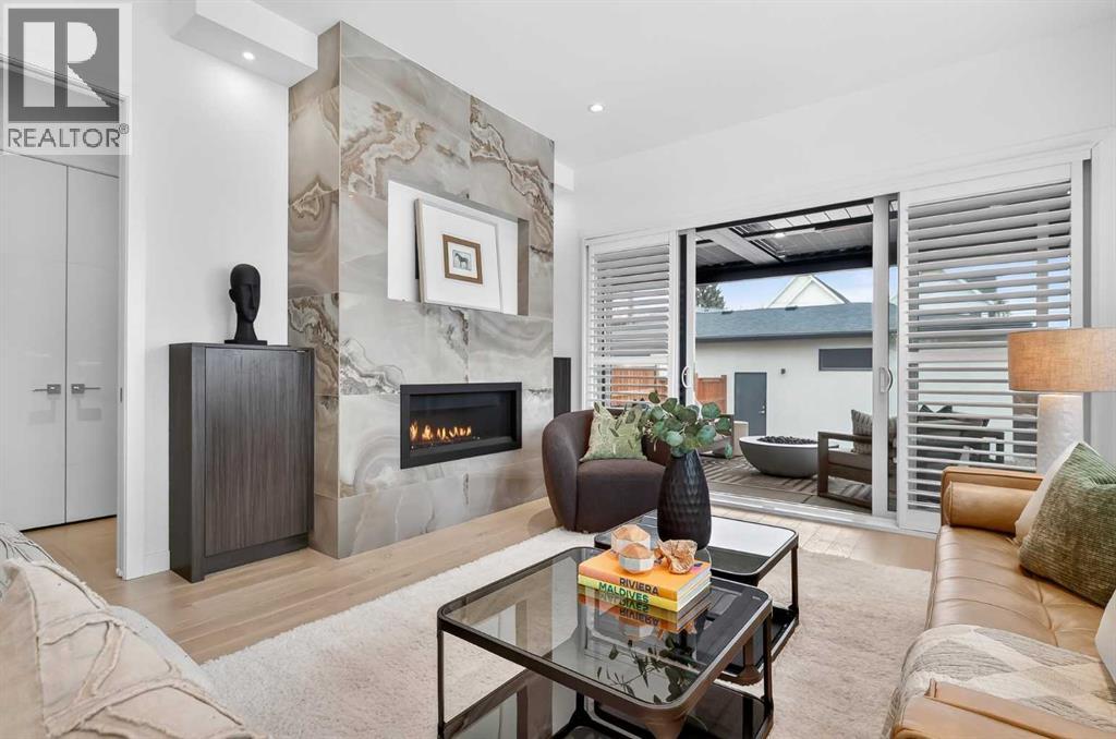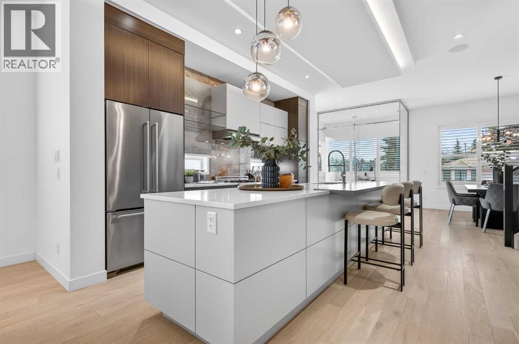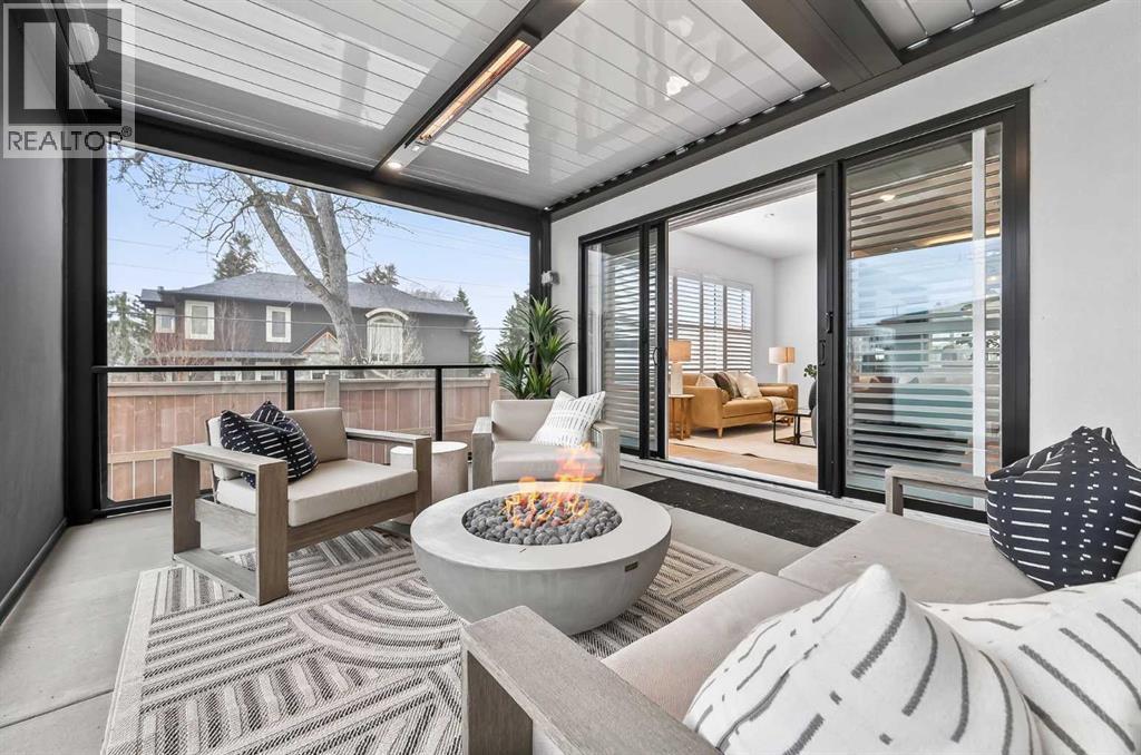An exceptional and unique residence by William Blake Custom Homes, this beautifully appointed corner home in the heart of Altadore offers over 3,090sq.ft. of refined living space, featuring 4 bedrooms and 3.5 bathrooms. Thoughtfully designed for modern living, the home combines clean architectural lines with high-end finishes and functional elegance throughout.A private corner entrance welcomes you into a bright, open main floor highlighted by soaring 10-foot ceilings and wide-plank white oak engineered hardwood. At the front, a striking glass-enclosed office framed by south-facing windows creates a light-filled workspace. The adjacent formal dining area is anchored by a statement glass globe chandelier, perfect for entertaining.The chef-inspired kitchen is the centrepiece of the home, showcasing a remarkable 16-foot two-toned quartz island with feature lighting above. Premium stainless steel Italian appliances include a 5-burner F.lli Bertazzoni gas range, complemented by a porcelain tile backsplash and unique lower window detailing beneath the cabinetry—an uncommon and thoughtful design element that enhances natural light. The kitchen flows seamlessly into the living room, where a gas fireplace with bookmatched marble porcelain tile creates a warm and sophisticated focal point. Double sliding doors open to a truly standout outdoor retreat. A professionally installed Suncoast enclosure—valued at over $53,000—creates a year-round oasis complete with built-in electric heaters, a gas-assisted fireplace, and generous seating space. Ideal for entertaining or relaxing, this space extends your living area in every season. A spacious mudroom with built-in cabinetry and a stylish powder room complete the main level. Upstairs, hardwood flooring continues throughout, leading to an open workspace enhanced by a large skylight. The upper laundry room is well-equipped with a sink, quartz countertops, and ample cabinetry. Two spacious bedrooms and a beautifully finished full bat hroom with quartz surfaces and a fully tiled tub/shower complete this level.The primary suite is a private retreat, featuring 10-foot ceilings, large windows, and a statement chandelier. A generous walk-in closet provides exceptional storage, while the spa-inspired 5-piece ensuite offers quartz countertops, Calacatta-style tile, a fully tiled glass rain shower, and a luxurious soaker tub. The fully developed basement is designed for comfort and entertaining, complete with in-floor heating and plush carpeting. A large recreation and theatre area is complemented by a built-in wet bar with quartz countertops, custom cabinetry, and a bar fridge. A custom wine feature with integrated seating adds a unique touch. This level also includes a spacious guest bedroom with a walk-in closet and a modern 3-piece bathroom with a floating quartz vanity and fully tiled glass shower. The double detached garage is fully finished with built-in storage and a durable polyaspartic decorative chip floor system. Priced to sell! (id:51989)