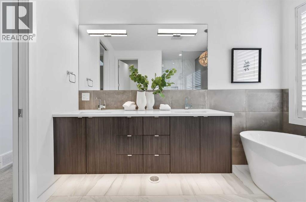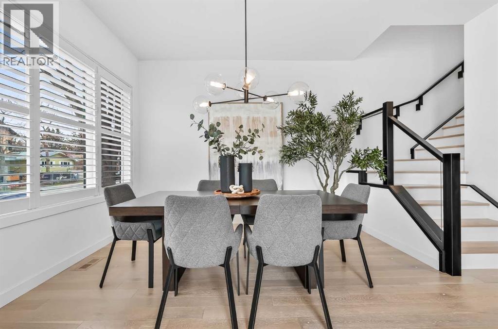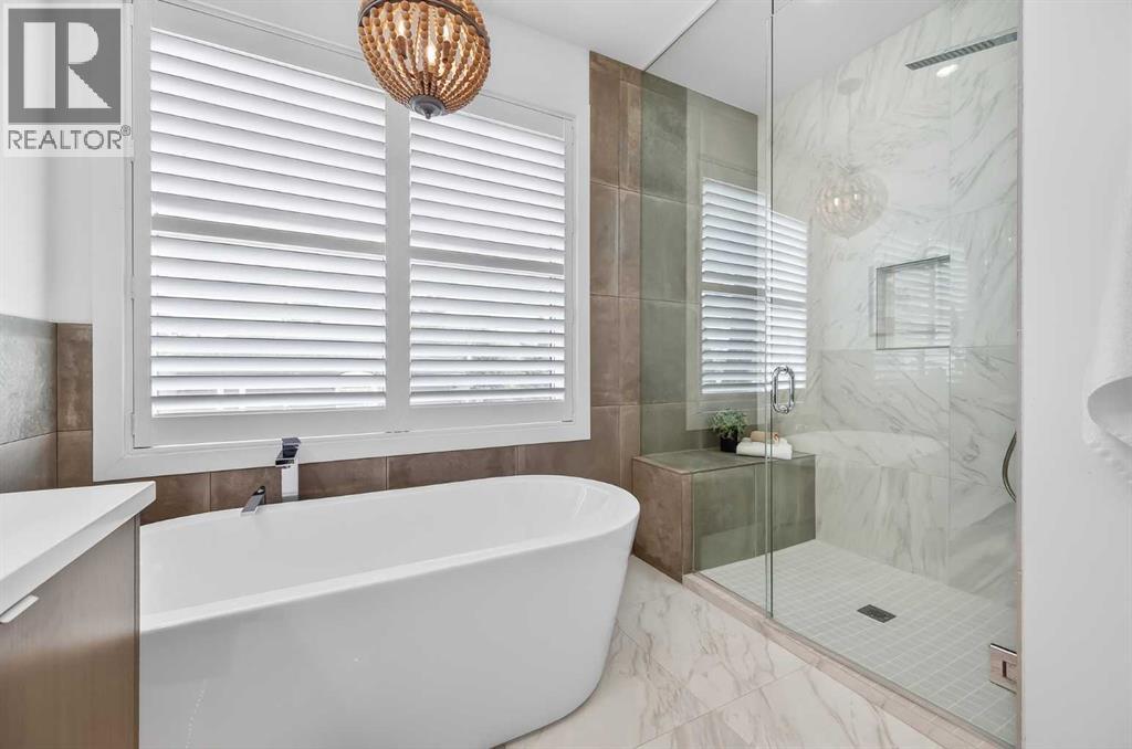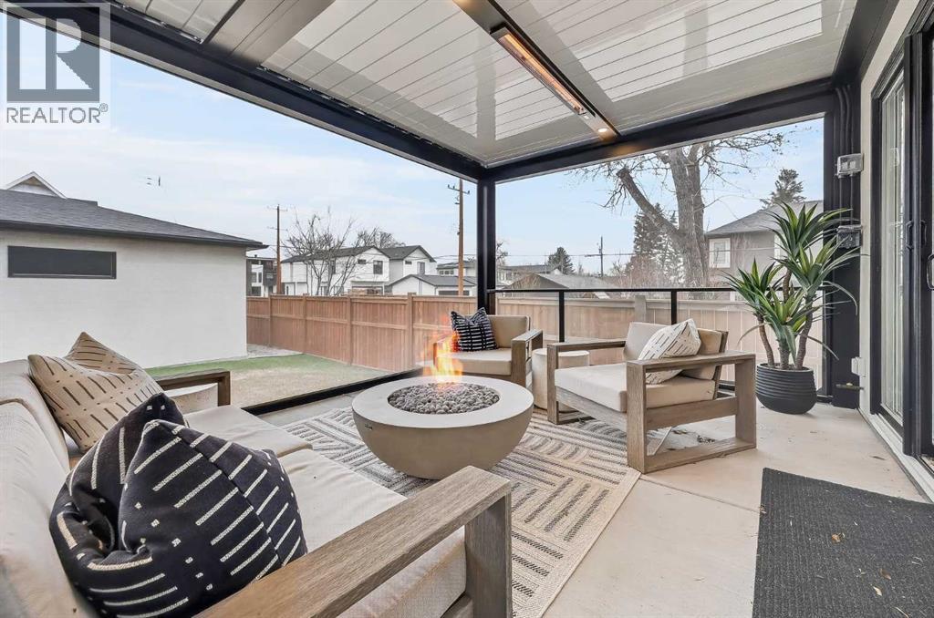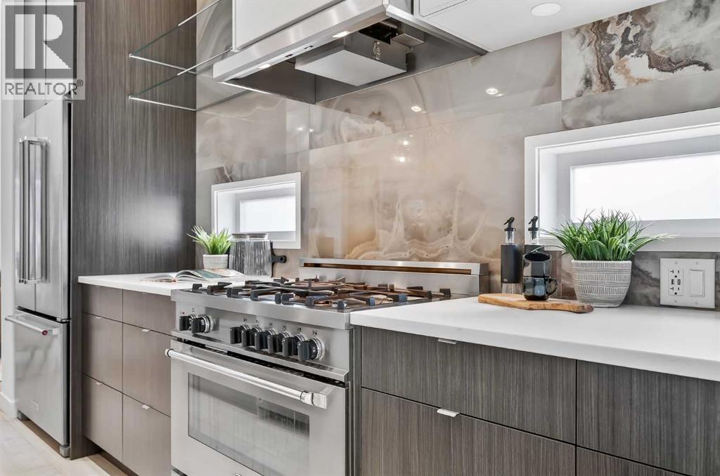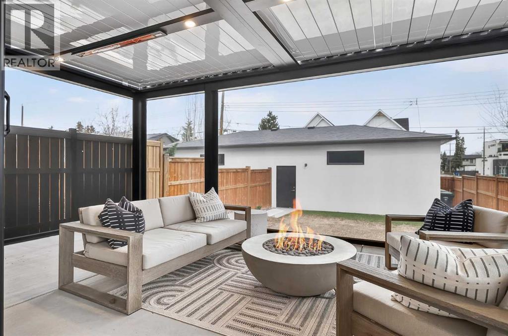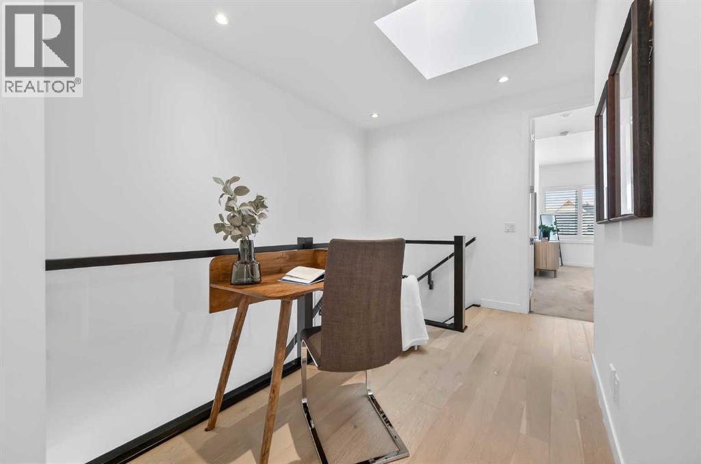 An exceptional and unique residence by William Blake Custom Homes, this beautifully appointed corner home in the heart of Altadore offers over 3,090sq.ft. of refined living space, featuring 4 bedrooms and 3.5 bathrooms. Thoughtfully designed for modern living, the home combines clean architectural lines with high-end finishes and functional elegance throughout.A private corner entrance welcomes you into a bright, open main floor highlighted by soaring 10-foot ceilings and wide-plank white oak engineered hardwood. At the front, a striking glass-enclosed office framed by south-facing windows creates a light-filled workspace. The adjacent formal dining area is anchored by a statement glass globe chandelier, perfect for entertaining.The chef-inspired kitchen is the centrepiece of the home, showcasing a remarkable 16-foot two-toned quartz island with feature lighting above. Premium stainless steel Italian appliances include a 5-burner F.lli Bertazzoni gas range, complemented by a porcelain tile backsplash and unique lower window detailing beneath the cabinetry—an uncommon and thoughtful design element that enhances natural light. The kitchen flows seamlessly into the living room, where a gas fireplace with bookmatched marble porcelain tile creates a warm and sophisticated focal point. Double sliding doors open to a truly standout outdoor retreat. A professionally installed Suncoast enclosure—valued at over $53,000—creates a year-round oasis complete with built-in electric heaters, a gas-assisted fireplace, and generous seating space. Ideal for entertaining or relaxing, this space extends your living area in every season. A spacious mudroom with built-in cabinetry and a stylish powder room complete the main level. Upstairs, hardwood flooring continues throughout, leading to an open workspace enhanced by a large skylight. The upper laundry room is well-equipped with a sink, quartz countertops, and ample cabinetry. Two spacious bedrooms and a beautifully finished full bat hroom with quartz surfaces and a fully tiled tub/shower complete this level.The primary suite is a private retreat, featuring 10-foot ceilings, large windows, and a statement chandelier. A generous walk-in closet provides exceptional storage, while the spa-inspired 5-piece ensuite offers quartz countertops, Calacatta-style tile, a fully tiled glass rain shower, and a luxurious soaker tub. The fully developed basement is designed for comfort and entertaining, complete with in-floor heating and plush carpeting. A large recreation and theatre area is complemented by a built-in wet bar with quartz countertops, custom cabinetry, and a bar fridge. A custom wine feature with integrated seating adds a unique touch. This level also includes a spacious guest bedroom with a walk-in closet and a modern 3-piece bathroom with a floating quartz vanity and fully tiled glass shower. The double detached garage is fully finished with built-in storage and a durable polyaspartic decorative chip floor system. Priced to sell! (id:51989)