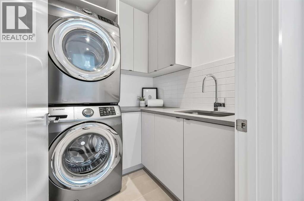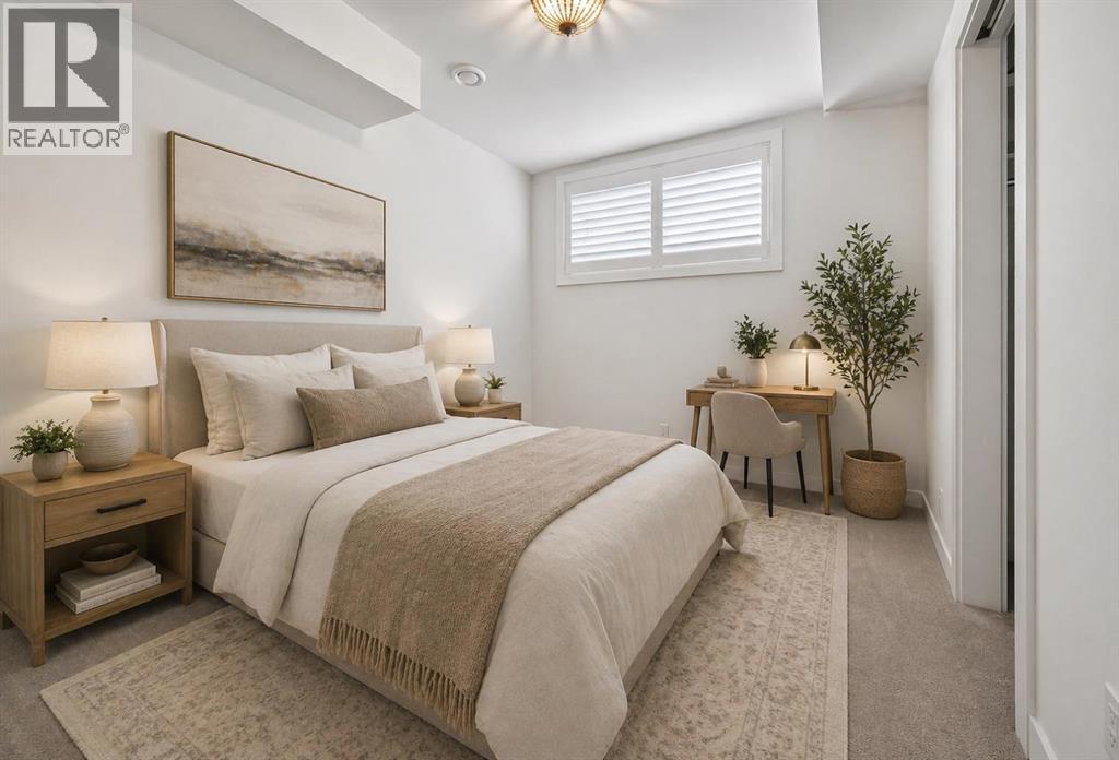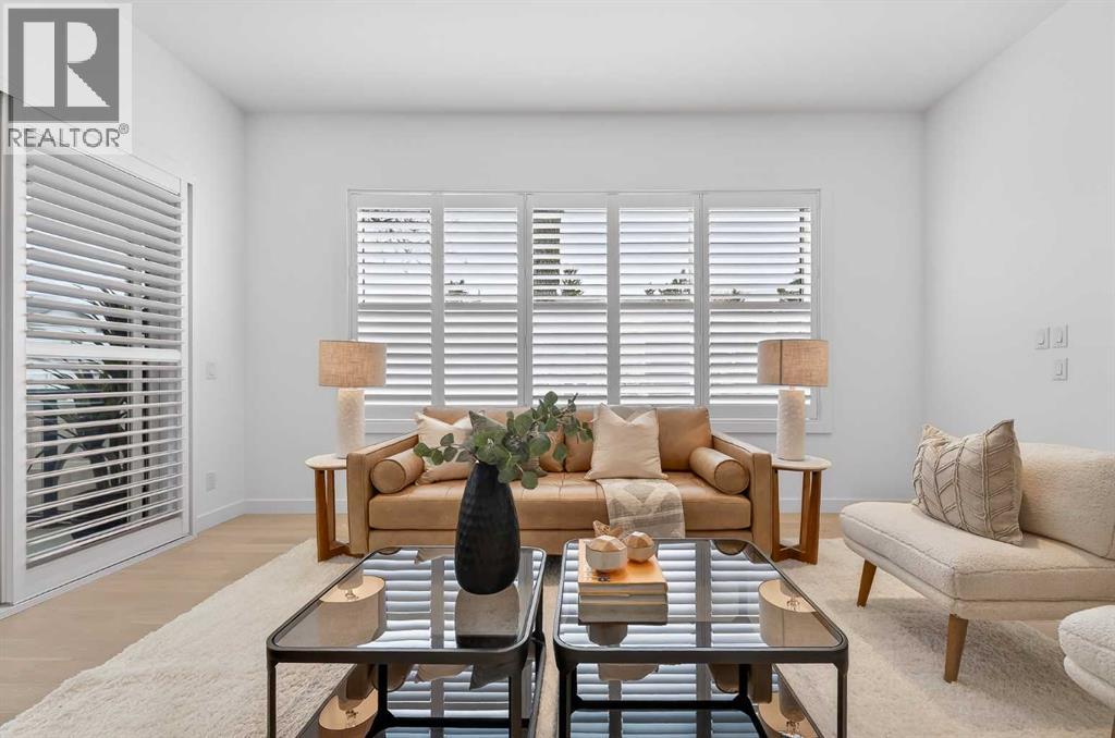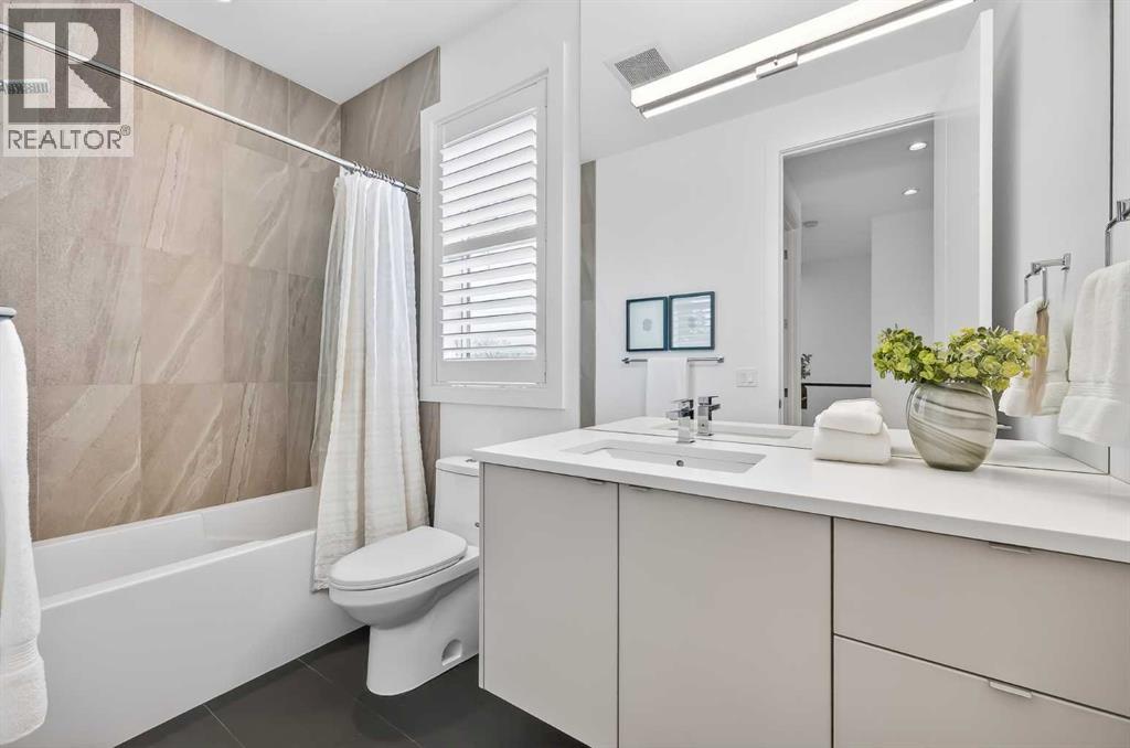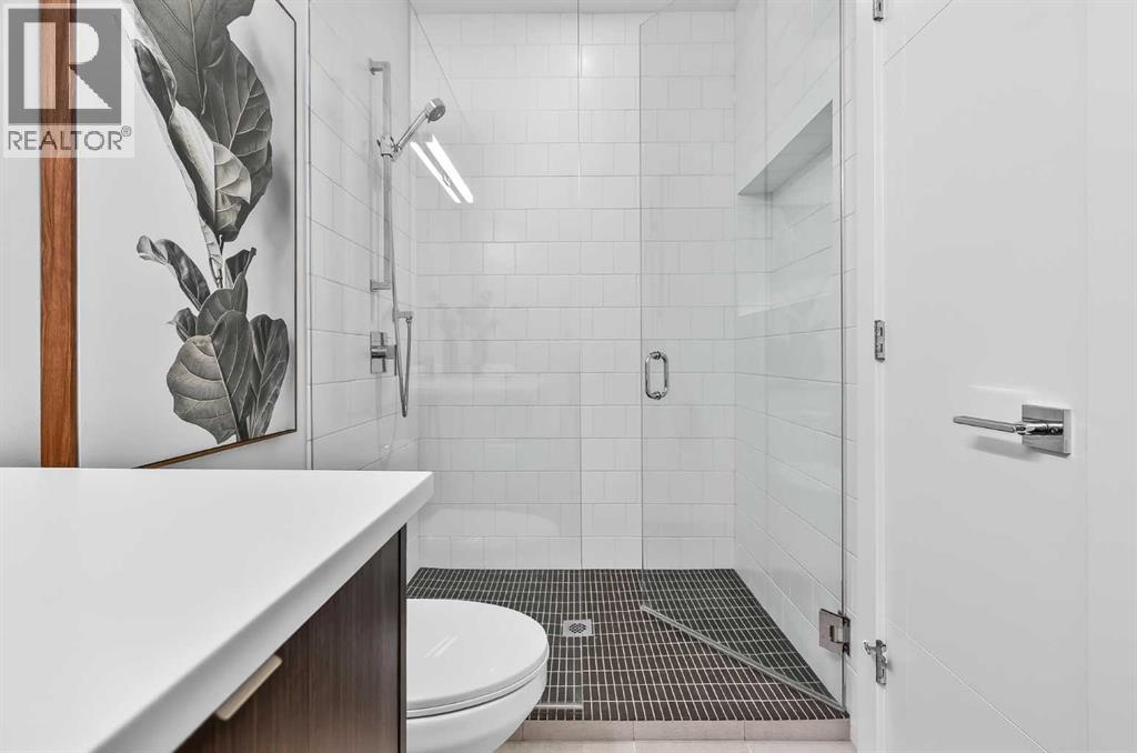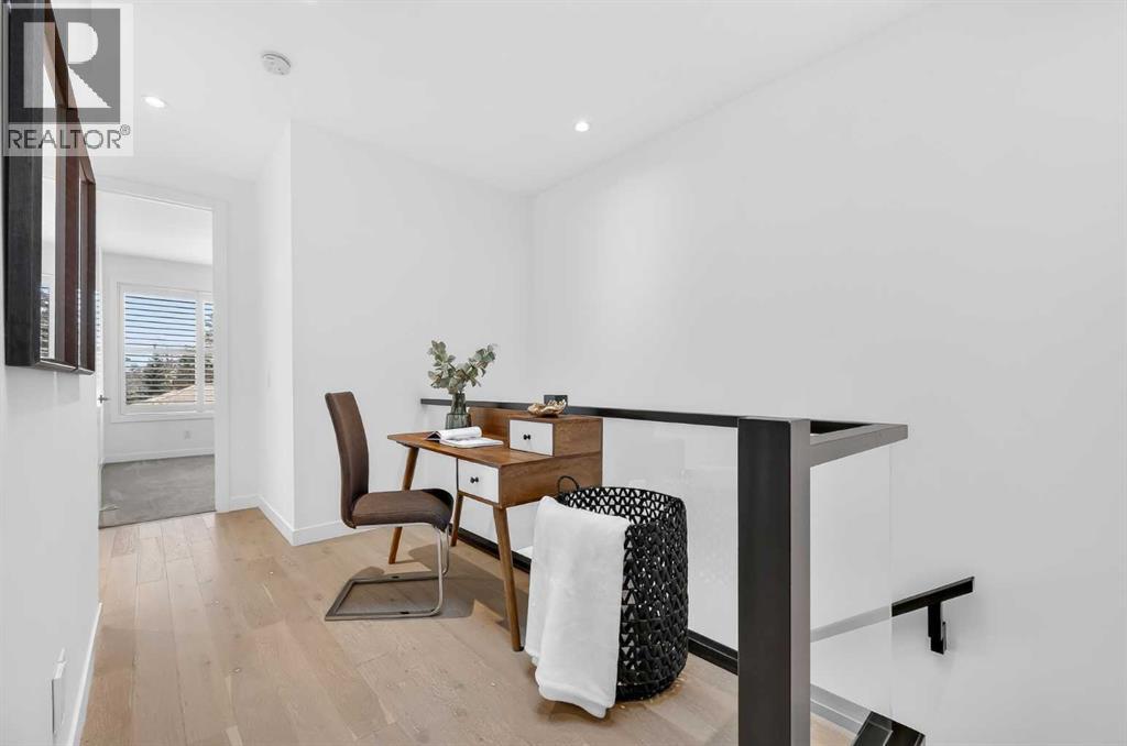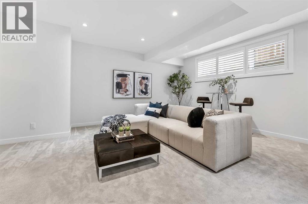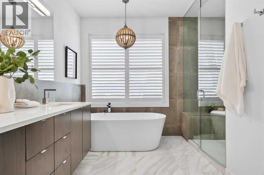 An exceptional and unique residence by William Blake Custom Homes, this beautifully appointed corner home in the heart of Altadore offers over 3,090sq.ft. of refined living space, featuring 4 bedrooms and 3.5 bathrooms. Thoughtfully designed for modern living, the home combines clean architectural lines with high-end finishes and functional elegance throughout.A private corner entrance welcomes you into a bright, open main floor highlighted by soaring 10-foot ceilings and wide-plank white oak engineered hardwood. At the front, a striking glass-enclosed office framed by south-facing windows creates a light-filled workspace. The adjacent formal dining area is anchored by a statement glass globe chandelier, perfect for entertaining.The chef-inspired kitchen is the centrepiece of the home, showcasing a remarkable 16-foot two-toned quartz island with feature lighting above. Premium stainless steel Italian appliances include a 5-burner F.lli Bertazzoni gas range, complemented by a porcelain tile backsplash and unique lower window detailing beneath the cabinetry—an uncommon and thoughtful design element that enhances natural light. The kitchen flows seamlessly into the living room, where a gas fireplace with bookmatched marble porcelain tile creates a warm and sophisticated focal point. Double sliding doors open to a truly standout outdoor retreat. A professionally installed Suncoast enclosure—valued at over $53,000—creates a year-round oasis complete with built-in electric heaters, a gas-assisted fireplace, and generous seating space. Ideal for entertaining or relaxing, this space extends your living area in every season. A spacious mudroom with built-in cabinetry and a stylish powder room complete the main level. Upstairs, hardwood flooring continues throughout, leading to an open workspace enhanced by a large skylight. The upper laundry room is well-equipped with a sink, quartz countertops, and ample cabinetry. Two spacious bedrooms and a beautifully finished full bat hroom with quartz surfaces and a fully tiled tub/shower complete this level.The primary suite is a private retreat, featuring 10-foot ceilings, large windows, and a statement chandelier. A generous walk-in closet provides exceptional storage, while the spa-inspired 5-piece ensuite offers quartz countertops, Calacatta-style tile, a fully tiled glass rain shower, and a luxurious soaker tub. The fully developed basement is designed for comfort and entertaining, complete with in-floor heating and plush carpeting. A large recreation and theatre area is complemented by a built-in wet bar with quartz countertops, custom cabinetry, and a bar fridge. A custom wine feature with integrated seating adds a unique touch. This level also includes a spacious guest bedroom with a walk-in closet and a modern 3-piece bathroom with a floating quartz vanity and fully tiled glass shower. The double detached garage is fully finished with built-in storage and a durable polyaspartic decorative chip floor system. Priced to sell! (id:51989)