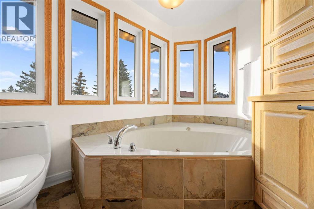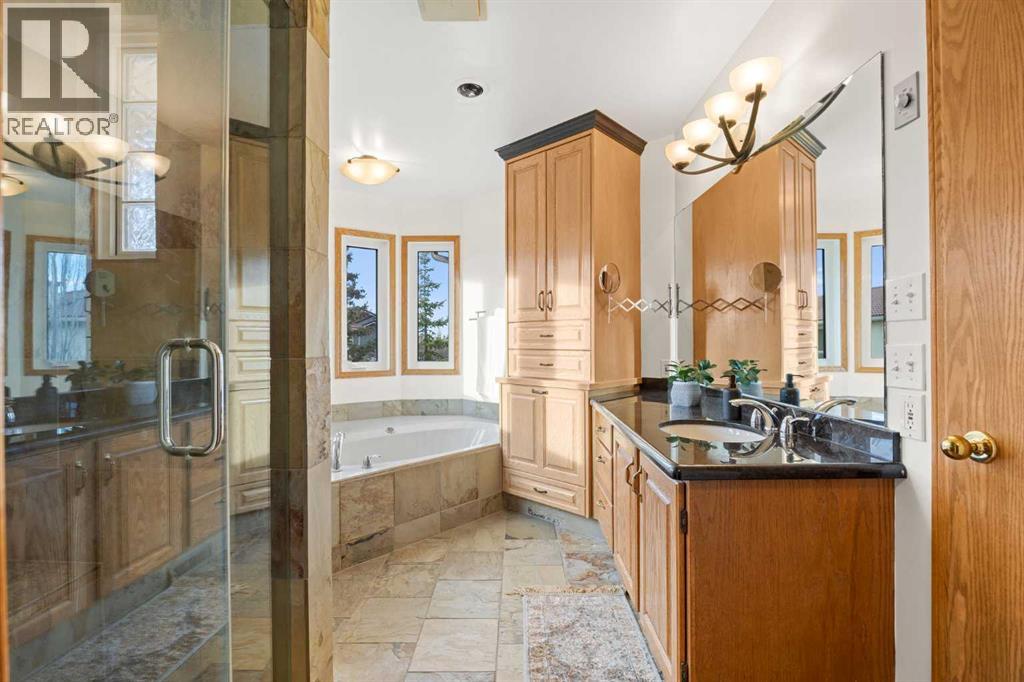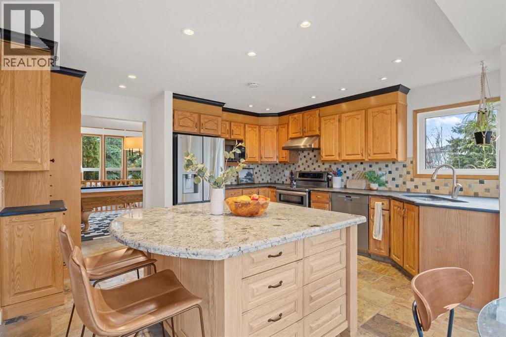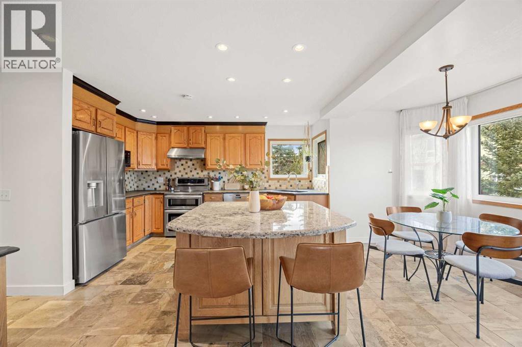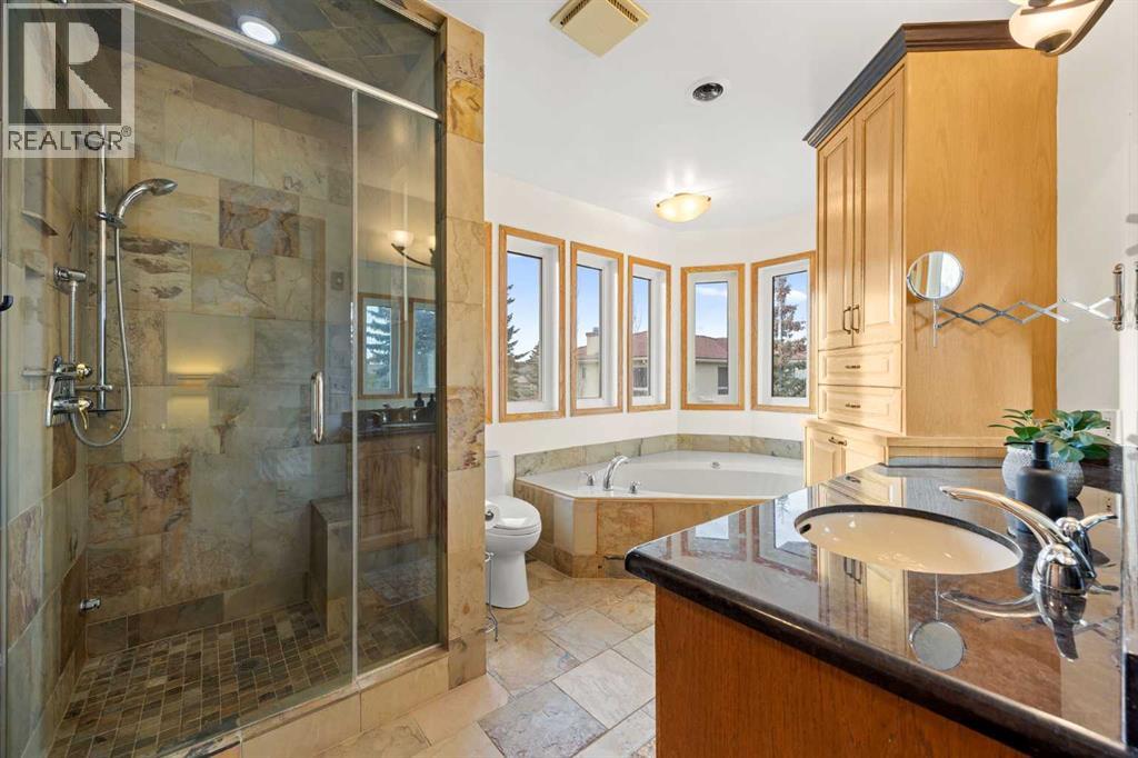 Whether you’re looking for multi-generational living—with a main floor bedroom and full ensuite, or the opportunity to build generational wealth with an income-producing suite, this home delivers. Tucked along the ravine in Edgemont and set on a large pie-shaped lot in a quiet cul-de-sac, this beautiful home offers an exceptional blend of privacy, space, and everyday convenience. With direct access to the Edgemont pathway system and stunning ravine views, this is a rare opportunity to own in one of NW Calgary’s most sought-after locations. A standout feature is the legalized one-bedroom walkout basement suite, offering excellent income potential or a comfortable space for extended family. With its own separate entrance and full living functionality, it adds meaningful flexibility and long-term value. Thoughtfully maintained and extensively updated, all Poly-B plumbing has been removed and the vast majority of windows have been updated. Major mechanical upgrades were completed in 2024, including furnaces, hot water tank, and fresh paint throughout, along with a new radon mitigation system in 2025. The upper level also features a new washer, dishwasher, and fridge (2025), and durable concrete roofing tiles add to the home’s long-term reliability. Inside, soaring vaulted ceilings and large windows flood the home with natural light while showcasing the ravine setting. The main living areas are warm and inviting, with a cozy gas-assist wood fireplace in the family room and a bright breakfast nook that opens onto the rear deck overlooking the ravine. The kitchen is both functional and stylish, featuring a central island and soapstone perimeter countertops for a clean, modern feel. The layout is exceptionally well suited for families of all sizes. Upstairs offers a spacious primary retreat with a full ensuite, along with two additional large bedrooms and another full bathroom. A loft-style bonus room with built-in shelving provides the perfect space for a library, lounge, or play area. The main floor includes a private bedroom with its own full ensuite and walk-in closet—ideal for guests, extended family, or aging relatives seeking main-level living. In addition to the suite, a separate basement flex space with direct access to the lower patio adds even more versatility—perfect for a home gym, media room, or additional living area. The backyard is equally impressive, featuring beautiful crab apple and cherry trees. Additional highlights include an oversized double attached garage and newer window coverings throughout. The home’s timeless design feels both classic and current. Edgemont offers an unmatched lifestyle with scenic pathways, ravines, and proximity to Nose Hill Park. The home is also within walking distance to top-rated schools, including Edgemont School and Tom Baines, as well as everyday amenities like grocery stores, restaurants, and services. A rare combination of location, layout, income potential, and long-term value—this is a home you won’t outgrow! (id:51989)