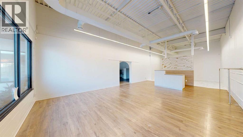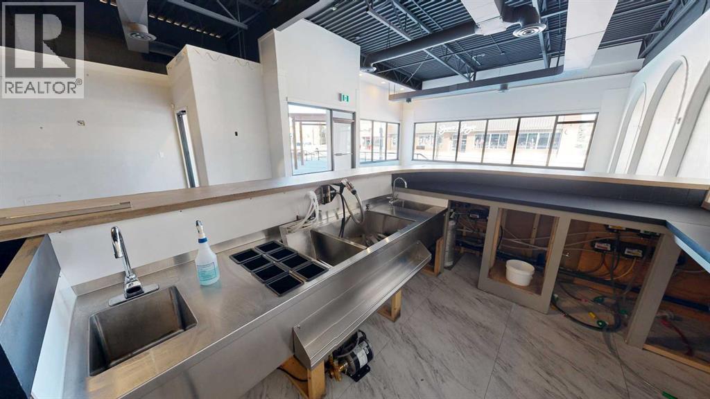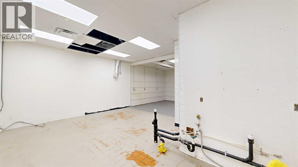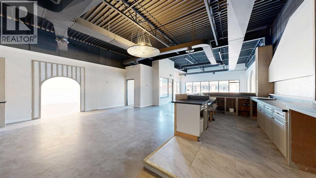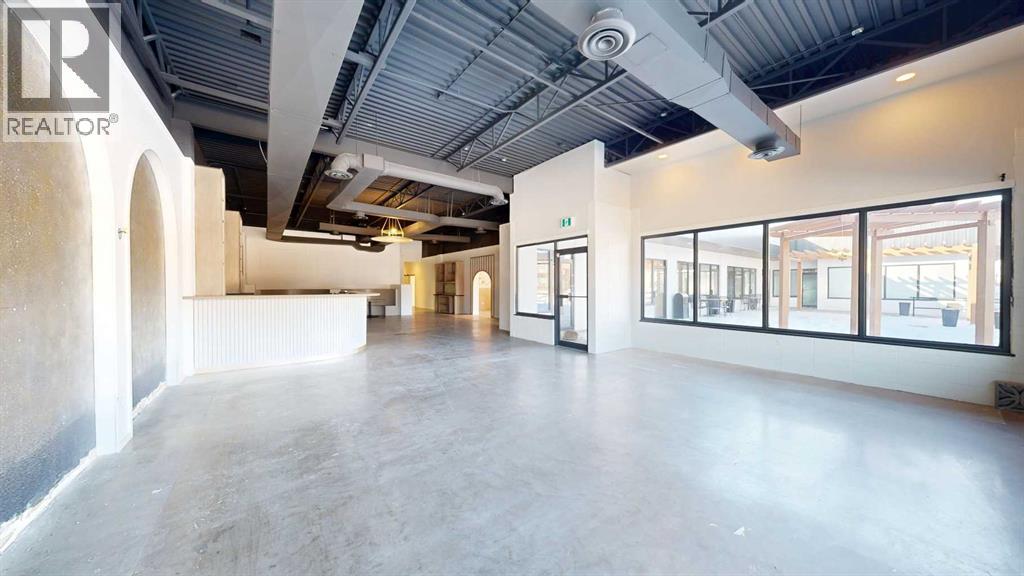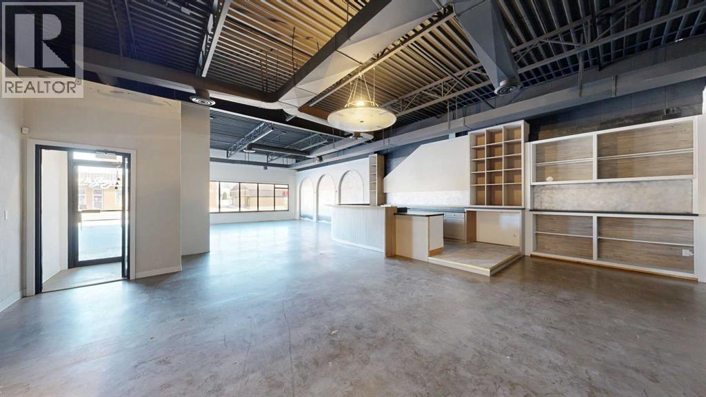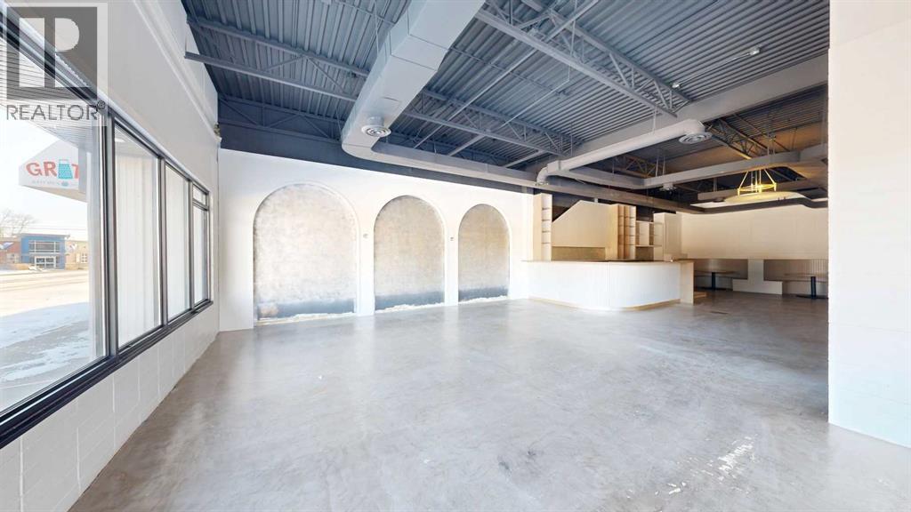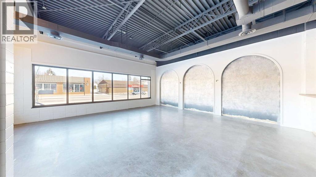 This expansive commercial property on main street in Stettler features a visually appealing and versatile layout suitable for a variety of business styles. The interior blends industrial and modern design, highlighted by exposed beams and ductwork in the high ceilings. Large windows fill the space with natural light for an open, airy feel. This property is partitioned into two main spaces, each with their own front and back doors. The south side has an open area with polished concrete floors, making the space well suited for retail or event use. There is an existing bar with stainless steel commercial sinks, plenty of counterspace, and display shelving. This space currently has two tables with built in seating. The kitchen area adjacent is ready for development. An arched doorway leads you to a bright space with warm wood-look flooring and windows along the front. This could potentially provide a comfortable setting for retail, offices, or meeting areas. Beyond this is another space with marble-look flooring for even more flexibility. There is a large office or storage room as well as a comfortable washroom just around the corner. The hall, which divides the two main spaces, has storage room with shelving and two modern washrooms. With its blend of open concept areas and private rooms, this property can easily accommodate creative studios, professional offices, retail operations, or multi-use commercial ventures. The landlord is open to demising the space with an acceptable lease. (id:51989)