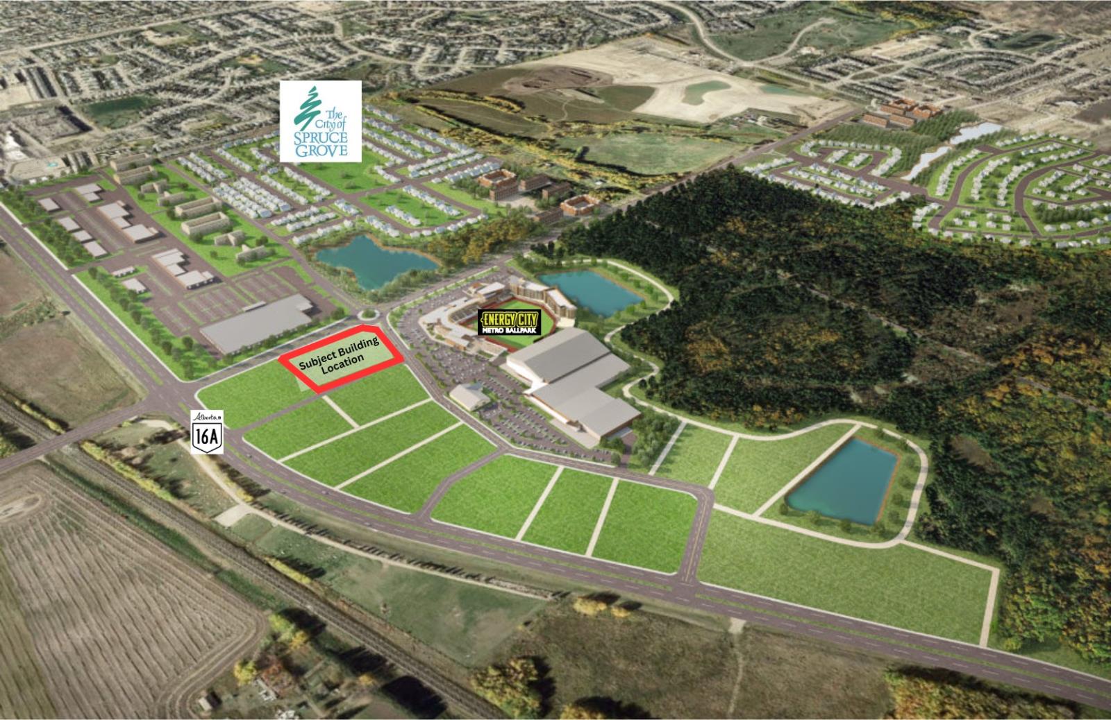 Prime retail leasing opportunity coming to Spruce Groves rapidly expanding Ballpark District. This brand new 1,300 SF retail bay is located within the Pioneer Crossing Phase 2 development in the Ballpark District, offering excellent visibility and accessibility via HWY 16A. The development benefits from approximately 25,000+/- vehicles PPD and is situated next to the future Energy City Metro Ballpark, creating strong long term commercial demand. The building is designed with modern curb appeal and flexible bay configurations suitable for a variety of retail, service commercial, and professional uses, zoned C2 - Highway Commercial. Join a growing commercial node with established tenants including Tim Hortons, hair salon, nail salon, and liquor store. Possession available upon completion, estimated Fall 2026. (id:51989)