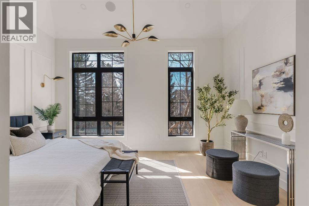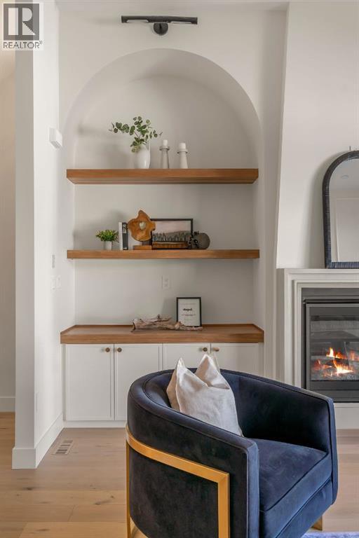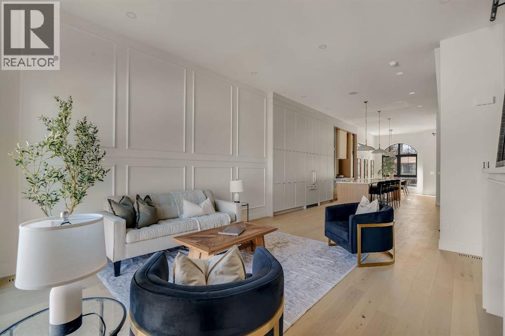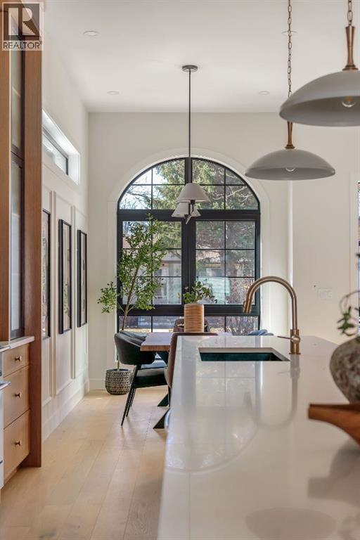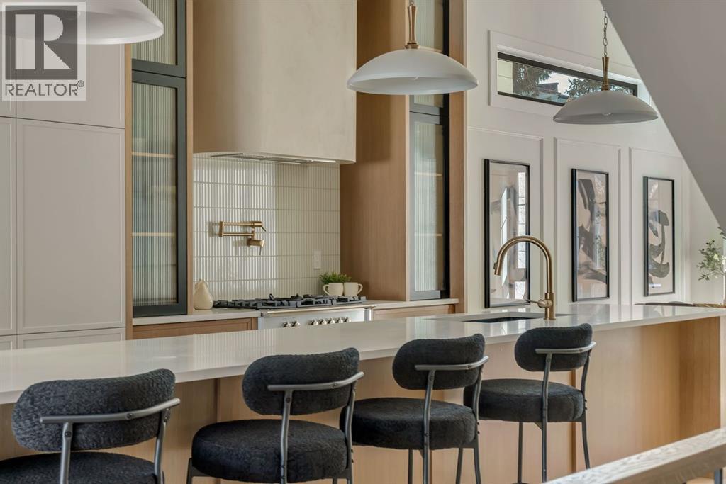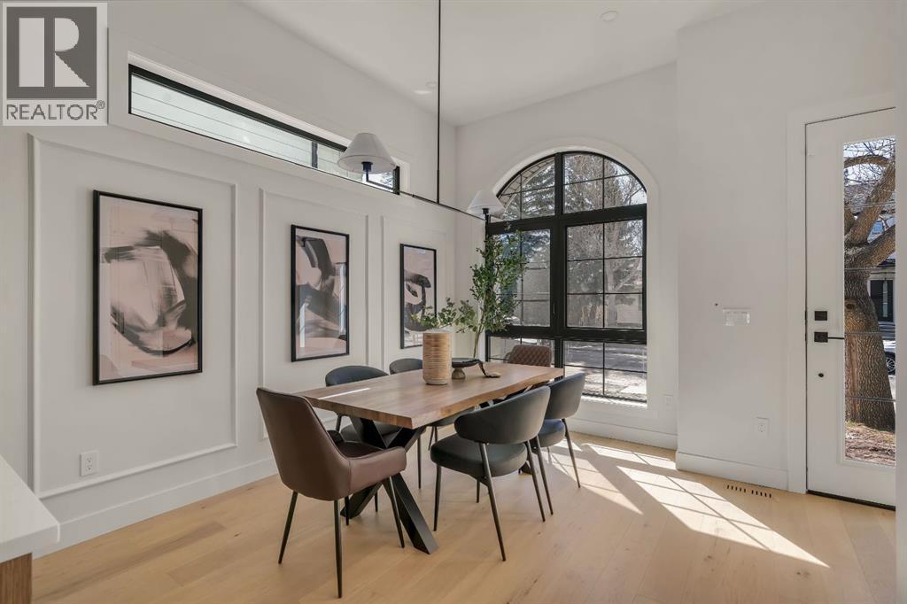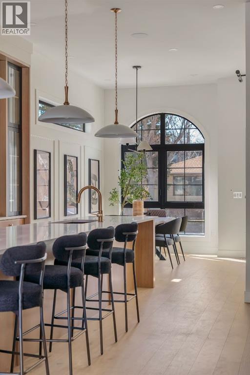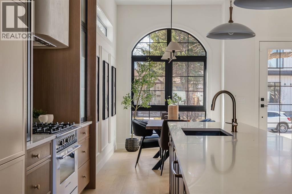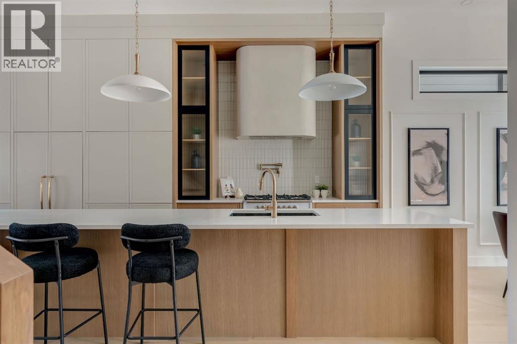 Located just one block from Confederation Park, this beautifully crafted home offers over 2,770 sq ft of refined living space designed with both style and function in mind. The main level features soaring 11-foot ceilings, rich hardwood flooring, a formal dining area with custom wainscoting, large floor to ceiling windows, and a chef-inspired kitchen anchored by a striking 15-foot island, complete with built-in Fisher & Paykel appliances, quartz countertops, an oak island, under-cabinet lighting, a curved plaster hood fan, pot filler, and elegant gold and black accents. The spacious living room is highlighted by a custom plaster gas fireplace with arched oak built-in shelving, while a well-designed mudroom and a designer powder room wrapped in statement wallpaper add everyday convenience and character. Upstairs, 9-foot ceilings and hardwood flooring continue throughout, leading to a stunning primary retreat with vaulted ceilings, detailed wainscoting, and a luxurious 5-piece ensuite featuring in-floor heating and a steam shower rough-in, along with two additional bedrooms, a full 3-piece bathroom, and a dedicated laundry room. The fully finished basement expands the living space with a large recreation area, office, arched wet bar, an additional bedroom, and a 3-piece bathroom. Additional highlights include rough-ins for air conditioning, ceiling speakers, security system, and exterior cameras, along with upgrade options available. Ideally located near parks, schools, shopping, SAIT, the University of Calgary, Foothills Medical Centre, Alberta Children’s Hospital, and offering quick access to the LRT, Highway 1, and Deerfoot Trail, this home combines luxury living with exceptional convenience, with exterior landscaping to be completed as weather permits. Call today to book your private tour! (id:51989)
