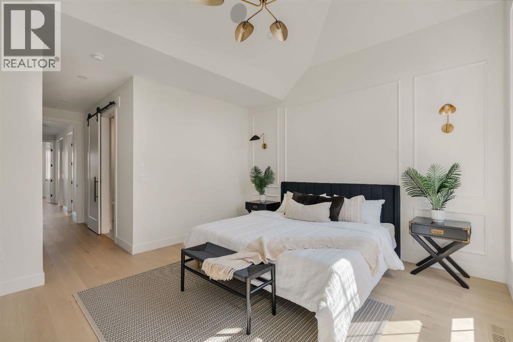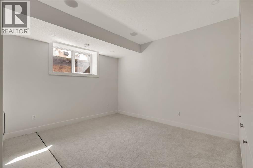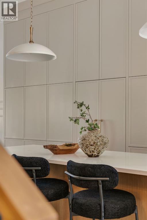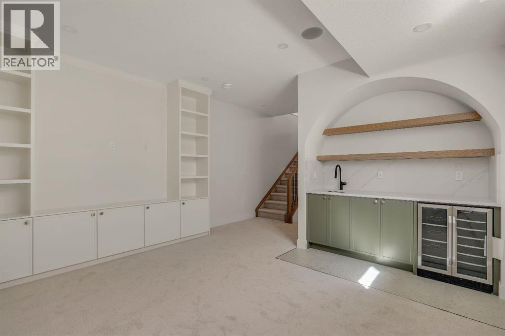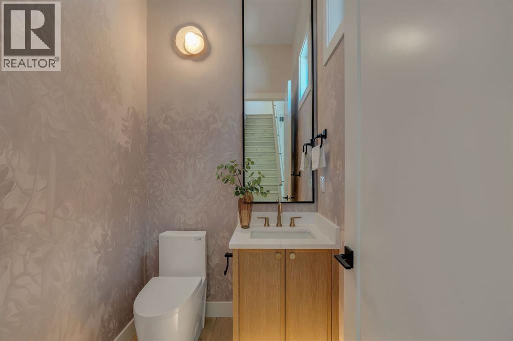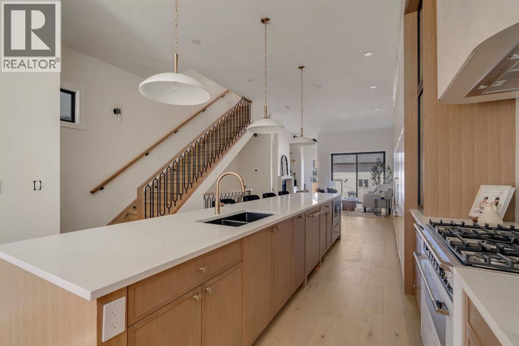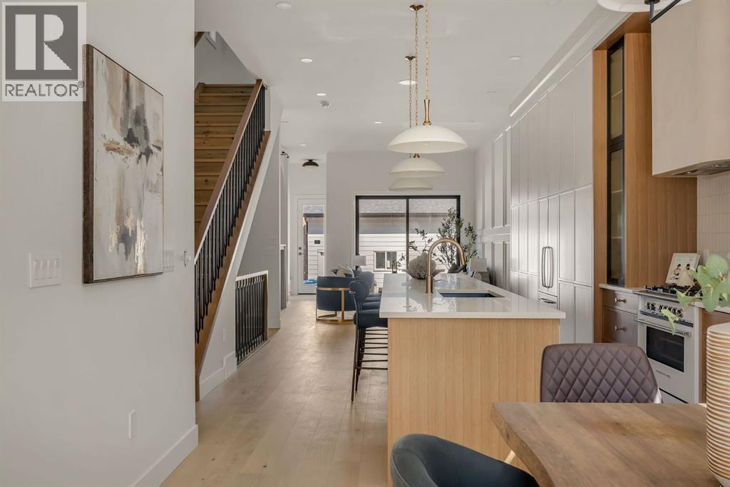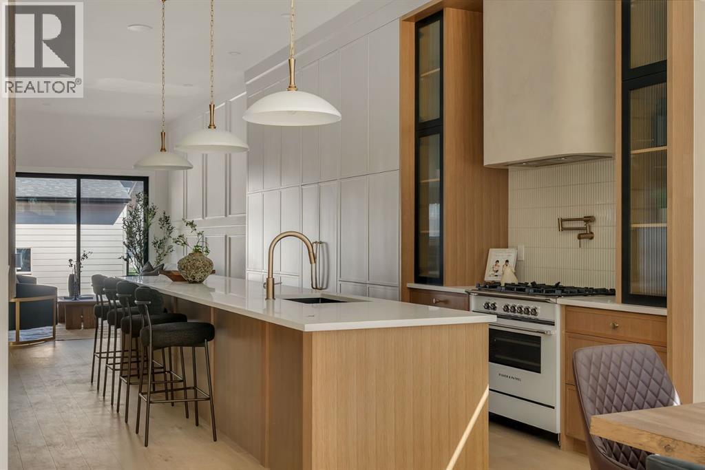 Located just one block from Confederation Park, this beautifully crafted home offers over 2,770 sq ft of refined living space designed with both style and function in mind. The main level features soaring 11-foot ceilings, rich hardwood flooring, a formal dining area with custom wainscoting, large floor to ceiling windows, and a chef-inspired kitchen anchored by a striking 15-foot island, complete with built-in Fisher & Paykel appliances, quartz countertops, an oak island, under-cabinet lighting, a curved plaster hood fan, pot filler, and elegant gold and black accents. The spacious living room is highlighted by a custom plaster gas fireplace with arched oak built-in shelving, while a well-designed mudroom and a designer powder room wrapped in statement wallpaper add everyday convenience and character. Upstairs, 9-foot ceilings and hardwood flooring continue throughout, leading to a stunning primary retreat with vaulted ceilings, detailed wainscoting, and a luxurious 5-piece ensuite featuring in-floor heating and a steam shower rough-in, along with two additional bedrooms, a full 3-piece bathroom, and a dedicated laundry room. The fully finished basement expands the living space with a large recreation area, office, arched wet bar, an additional bedroom, and a 3-piece bathroom. Additional highlights include rough-ins for air conditioning, ceiling speakers, security system, and exterior cameras, along with upgrade options available. Ideally located near parks, schools, shopping, SAIT, the University of Calgary, Foothills Medical Centre, Alberta Children’s Hospital, and offering quick access to the LRT, Highway 1, and Deerfoot Trail, this home combines luxury living with exceptional convenience, with exterior landscaping to be completed as weather permits. Call today to book your private tour! (id:51989)