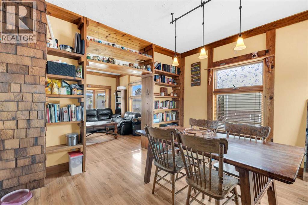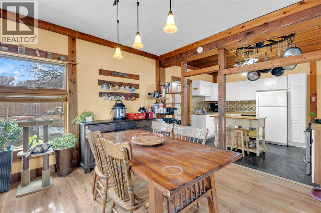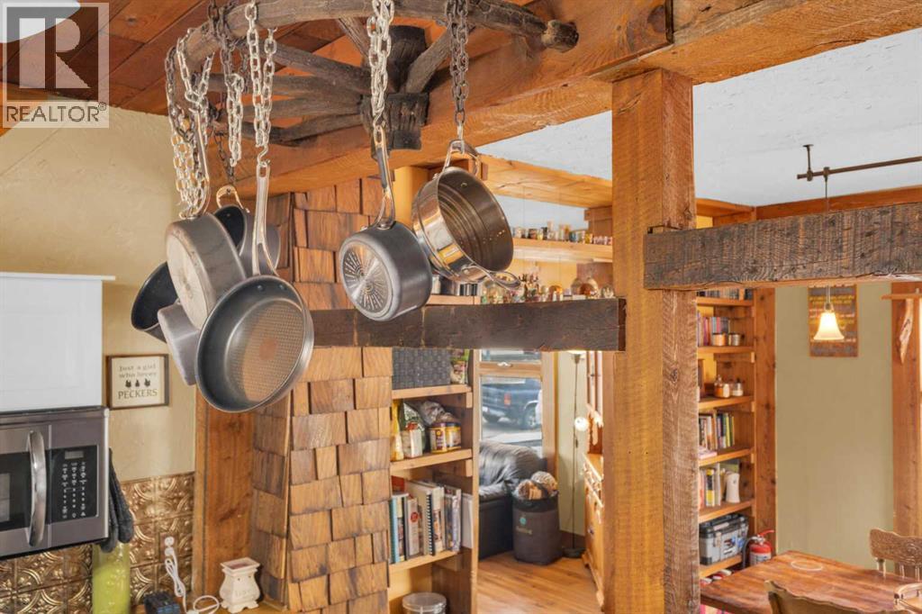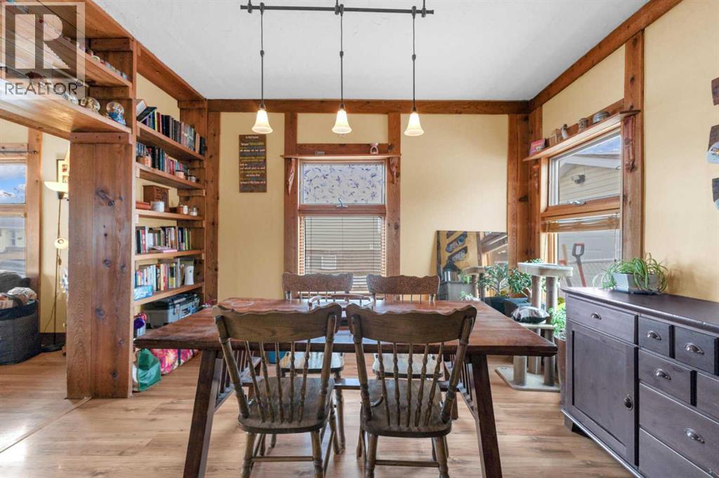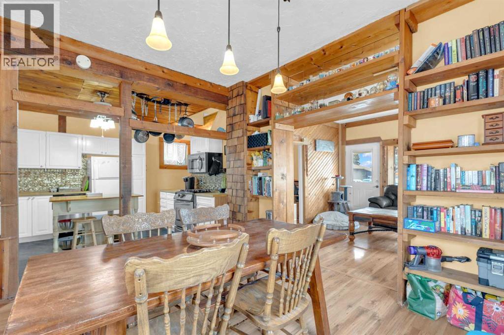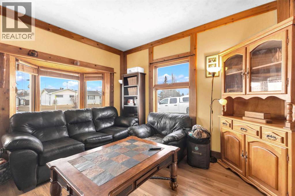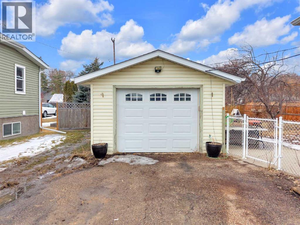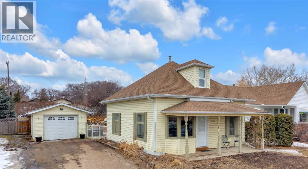 Charm, character, and over a century of Lacombe history — this 1920 one-and-a-half storey is one of a kind. Sitting on a mature double lot in the heart of Downtown Lacombe, it offers the kind of setting that is simply not replicated in newer neighbourhoods: a covered front porch framed by established trees, a fenced yard with flowering and apple-producing trees, and a neighbourhood you can walk from.Inside, the home features beamed ceilings, a practical main floor layout with a good-sized kitchen, dining room, and living room, main floor laundry, and the primary bedroom all on the main level. The upper loft offers a generous second bedroom. A full bathroom completes the main floor.Updates over the years include new roof and eavestroughs on both the house and garage, some new windows, a refreshed kitchen with new cupboards, countertop, and backsplash, an updated electrical box, and in-floor heat and tile in the back entry and bathroom. All appliances are included.Outside, the 50 x 120 lot provides plenty of room to breathe. A detached single garage (14 x 22), a fenced backyard, extra parking, and a deck round out the property. Parks, schools, a playground, and the full amenities of downtown are all close by.A perfect starter home, a smart revenue property, or a place for anyone who appreciates the character and craftsmanship of a true Lacombe original. (id:51989)
