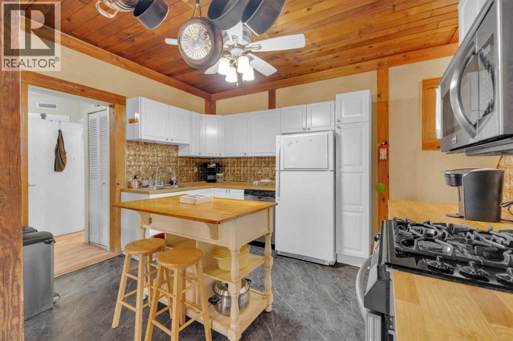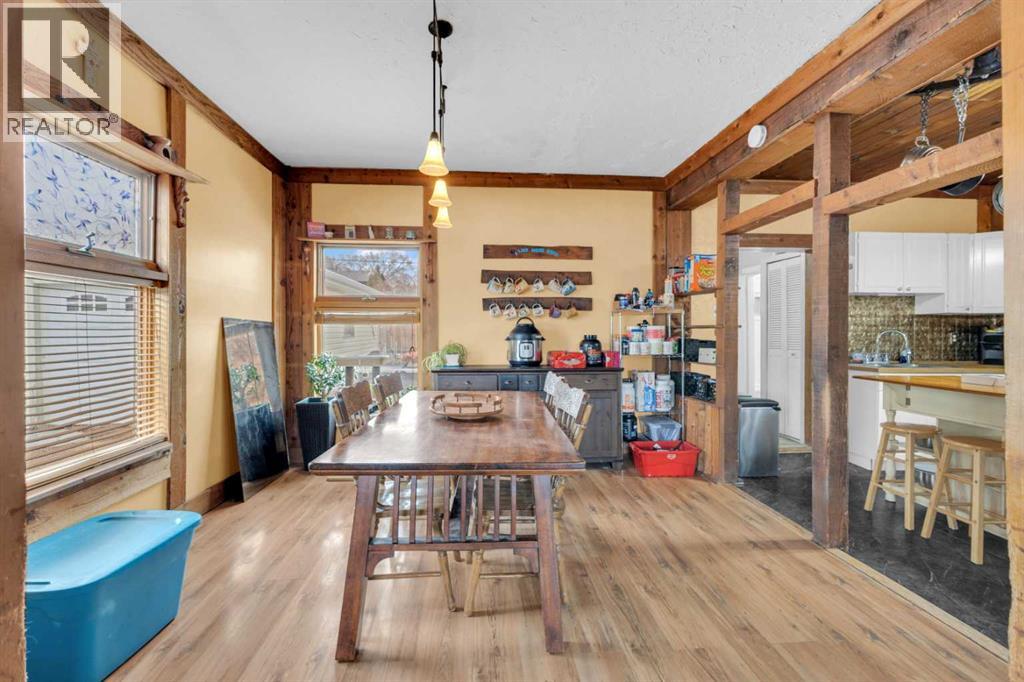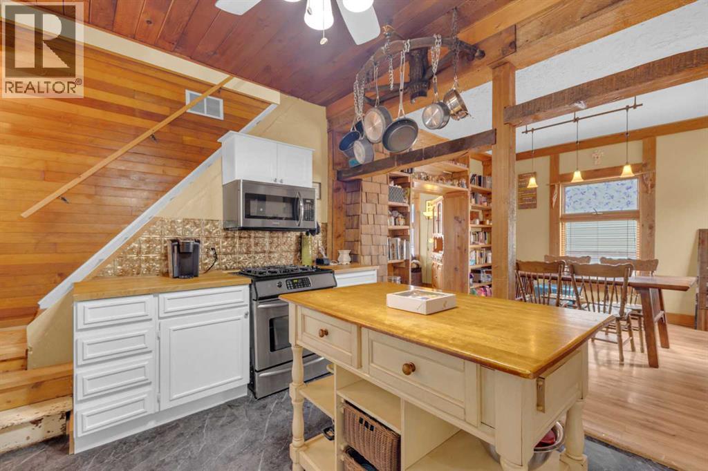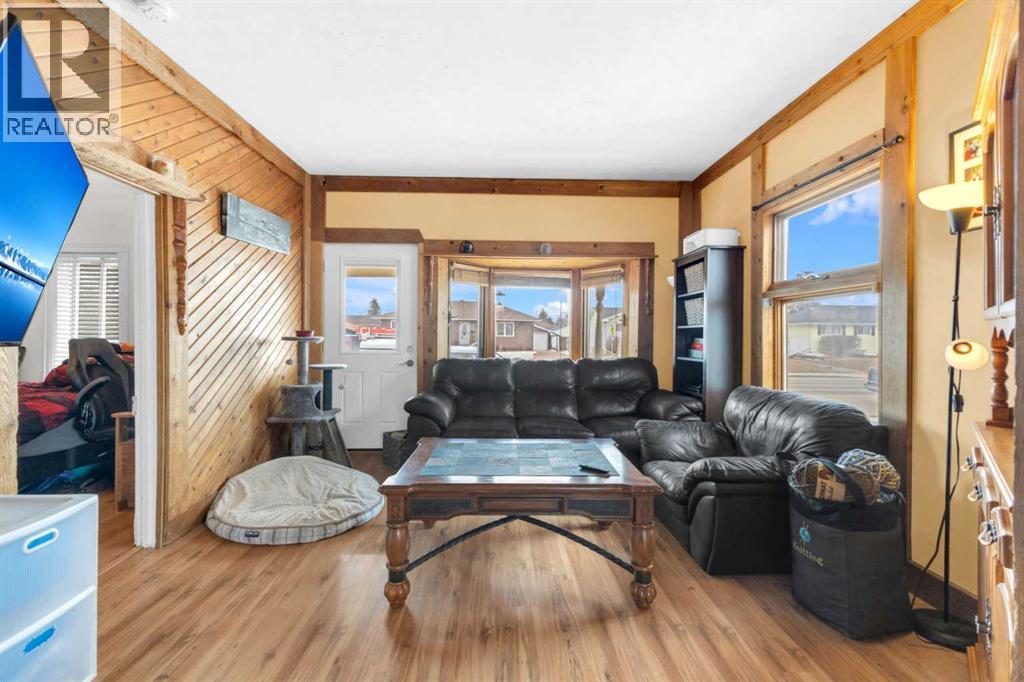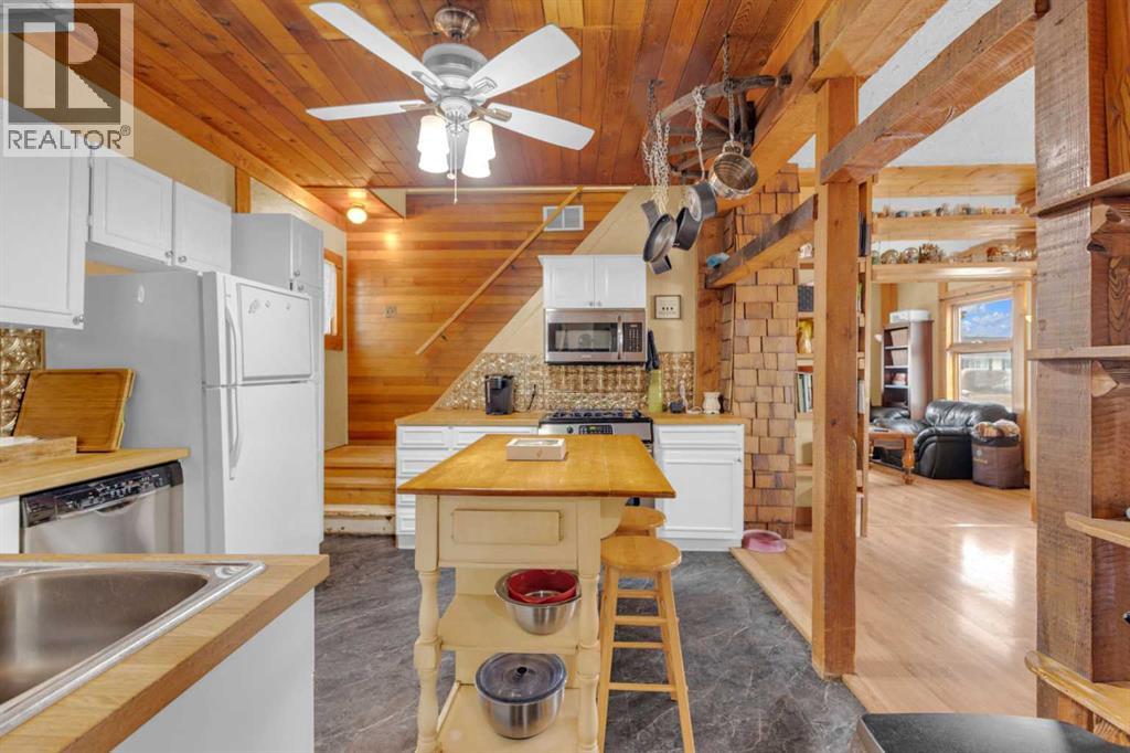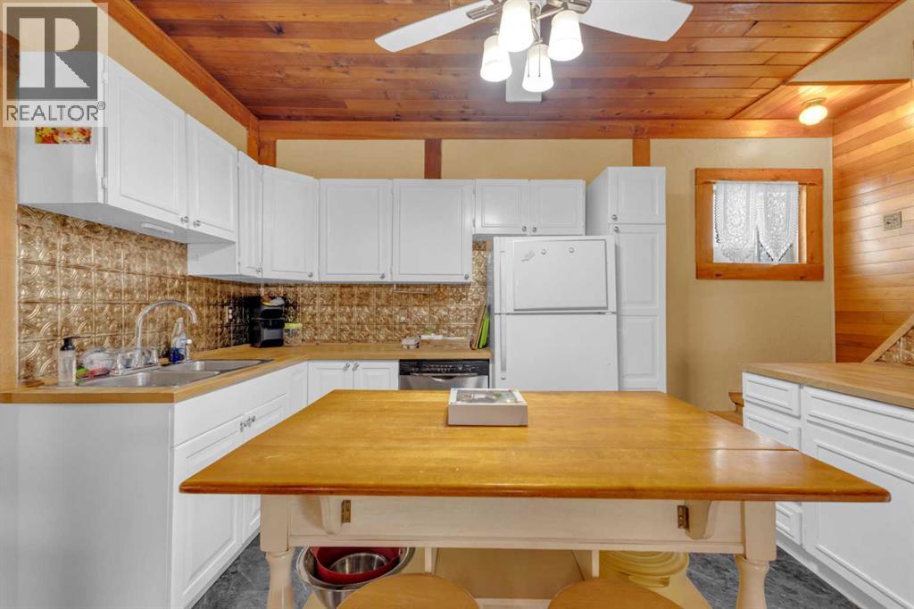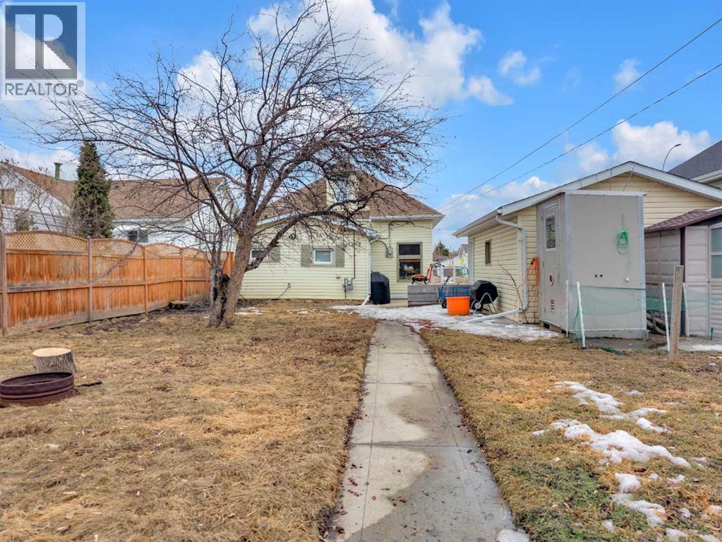 Charm, character, and over a century of Lacombe history — this 1920 one-and-a-half storey is one of a kind. Sitting on a mature double lot in the heart of Downtown Lacombe, it offers the kind of setting that is simply not replicated in newer neighbourhoods: a covered front porch framed by established trees, a fenced yard with flowering and apple-producing trees, and a neighbourhood you can walk from.Inside, the home features beamed ceilings, a practical main floor layout with a good-sized kitchen, dining room, and living room, main floor laundry, and the primary bedroom all on the main level. The upper loft offers a generous second bedroom. A full bathroom completes the main floor.Updates over the years include new roof and eavestroughs on both the house and garage, some new windows, a refreshed kitchen with new cupboards, countertop, and backsplash, an updated electrical box, and in-floor heat and tile in the back entry and bathroom. All appliances are included.Outside, the 50 x 120 lot provides plenty of room to breathe. A detached single garage (14 x 22), a fenced backyard, extra parking, and a deck round out the property. Parks, schools, a playground, and the full amenities of downtown are all close by.A perfect starter home, a smart revenue property, or a place for anyone who appreciates the character and craftsmanship of a true Lacombe original. (id:51989)
