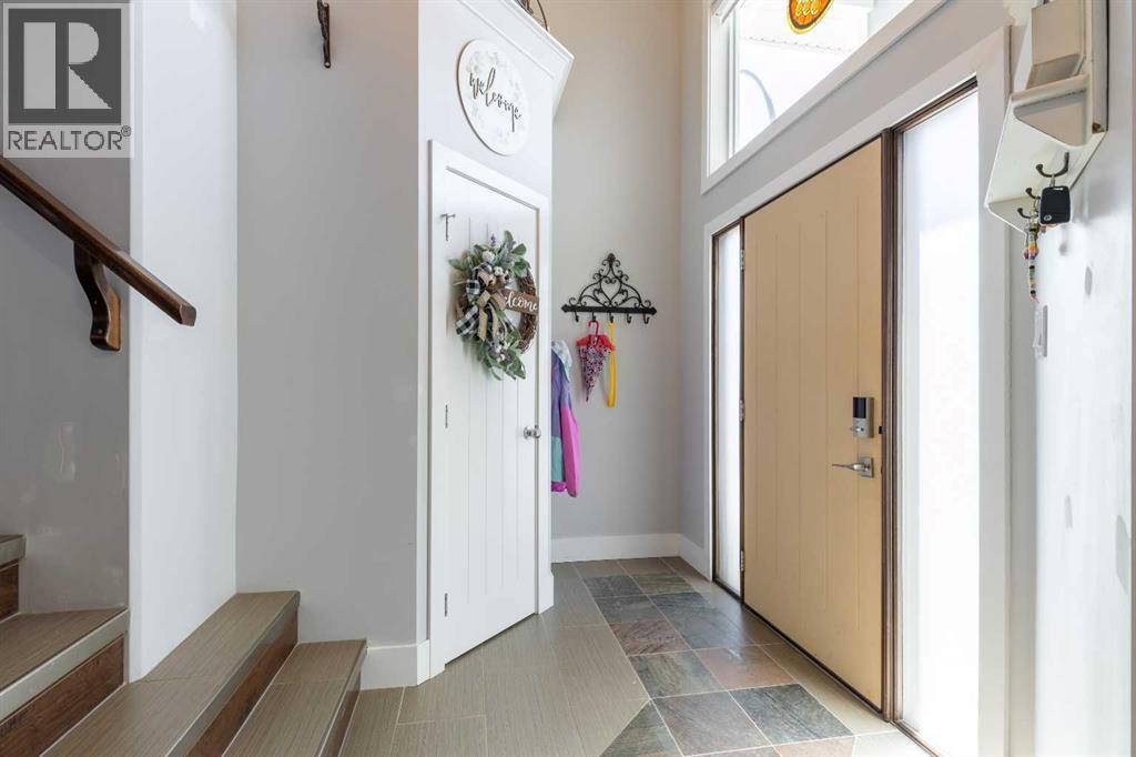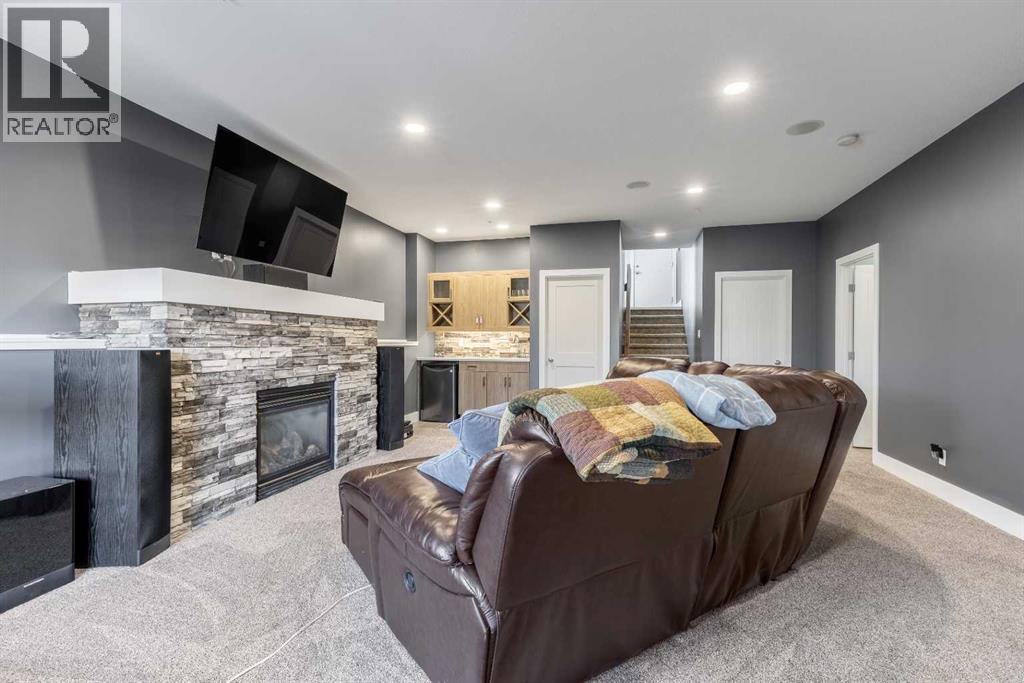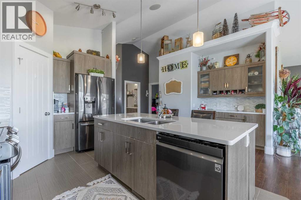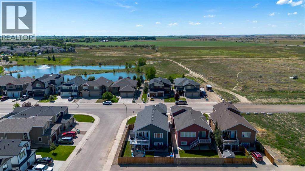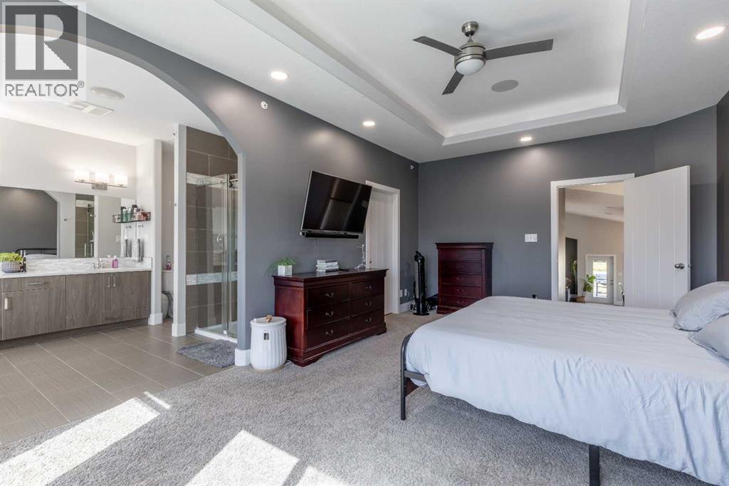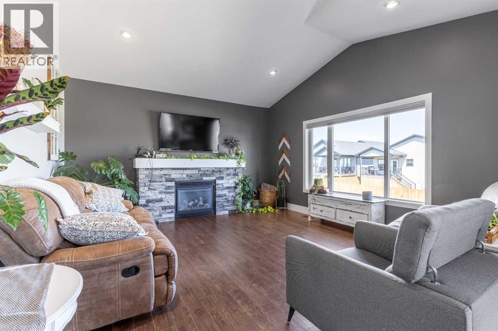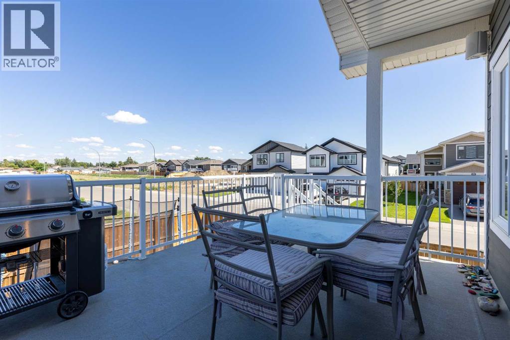 Welcome to 5401 43 Street in Taber — an exceptional family home situated on a quiet corner lot, thoughtfully designed with comfort, function, and modern elegance in mind. The exterior impresses with striking curb appeal, featuring Hardie board siding with smart trim accents, exposed aggregate concrete, PVC windows, and maintenance-free handrails. The fully fenced and professionally landscaped yard includes a stamped concrete patio that also doubles as R.V. parking, a covered lower patio ideal for a future hot tub, and a spacious back deck — the perfect place to enjoy peaceful, east-facing sunrises. A charming front porch invites you to start your mornings with a coffee in hand.Inside, the main level is bright and open, enhanced by vaulted ceilings and an airy, functional layout. The kitchen is beautifully appointed with quartz countertops, a large island with an undermount sink, updated appliances, a pantry, garburator, and tile backsplash. The adjacent dining and living spaces are warm and inviting, centered around a gas fireplace and built-in desk area, and complemented by a full-home speaker system—ideal for everyday living and entertaining. Privately situated above the garage, the spacious primary suite offers a quiet retreat. It features a tray ceiling with ambient mood lighting, access to a private balcony, an expansive walk-in closet, and a luxurious 6-piece ensuite with an extra-long soaker tub, dual vanities, and generous built-in storage. Two additional well-sized bedrooms and a stylish 4-piece bathroom complete the main floor. The fully finished basement offers 9’ ceilings, a large family room with a second gas fireplace, two more generously sized bedrooms—each with walk-in closets—a 4-piece bathroom, and a wet bar. Comfort and practicality continue with in-floor heating, air conditioning, and rough-ins for central vacuum. Additional highlights include a heated double attached garage, underground sprinklers, exposed aggregate front steps, an outdoor spea ker system, and durable asphalt shingles. Perfectly located just minutes from schools, parks, and all amenities Taber has to offer, this beautifully maintained home is an ideal choice for families seeking space, style, and functionality (id:51989)