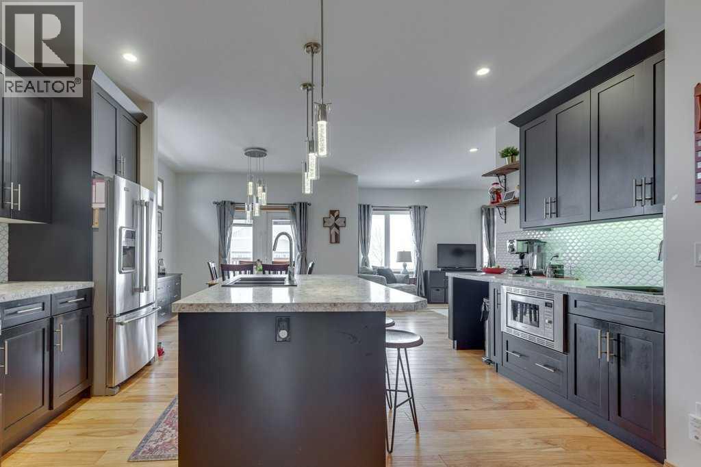 Beautifully maintained modified bi-level located in one of Innisfail’s most desirable neighborhoods, Napoleon Meadows Way! From the moment you arrive, the curb appeal stands out on this home. The modern exterior with stone accents and covered entry creates a welcoming first impression. Inside, the main level features engineered hardwood flooring and an open layout that flows seamlessly between the living, dining, and kitchen areas. The living room is enhanced by a cozy gas-burning fireplace that adds warmth and character. The kitchen offers rich cabinetry, generous counter space, a functional island, and a gas stove for cooking- a feature anyone who loves to cook will appreciate! Patio doors lead directly to the deck, making summer entertaining and BBQs effortless. Also located on the main floor are two well-sized bedrooms and a 4-piece bathroom- ideal for children, guests, or a home office setup. Upstairs, the primary bedroom truly feels like its own private suite. Set apart from the other bedrooms, this upper-level retreat offers excellent separation and privacy but is still located close enough to tend to small children. Complete with a walk-in closet and a 4-piece ensuite, it’s a comfortable and functional space designed for everyday living. The lower level offers substantial development already underway, including a developed bedroom, a two piece bathroom, some framed rooms and a large open area ready to be finished to your preference. In-floor heat keeps things nice and cozy! The mechanical systems are clean and well organized, including a high-efficiency furnace and hot water tank. The home is also equipped with air conditioning, providing year-round comfort. Step outside to enjoy the fully fenced yard and upper deck with decorative railing detail and neighborhood views. The double attached garage is oversized with excellent overhead storage and workspace potential- perfect for busy families, hobbies, or additional organization. Located in a quiet close and w ith popular Centennial park within walking distance, this is a solid, well-built home that offers comfort today and the flexibility to complete the basement development in the future! (id:51989)