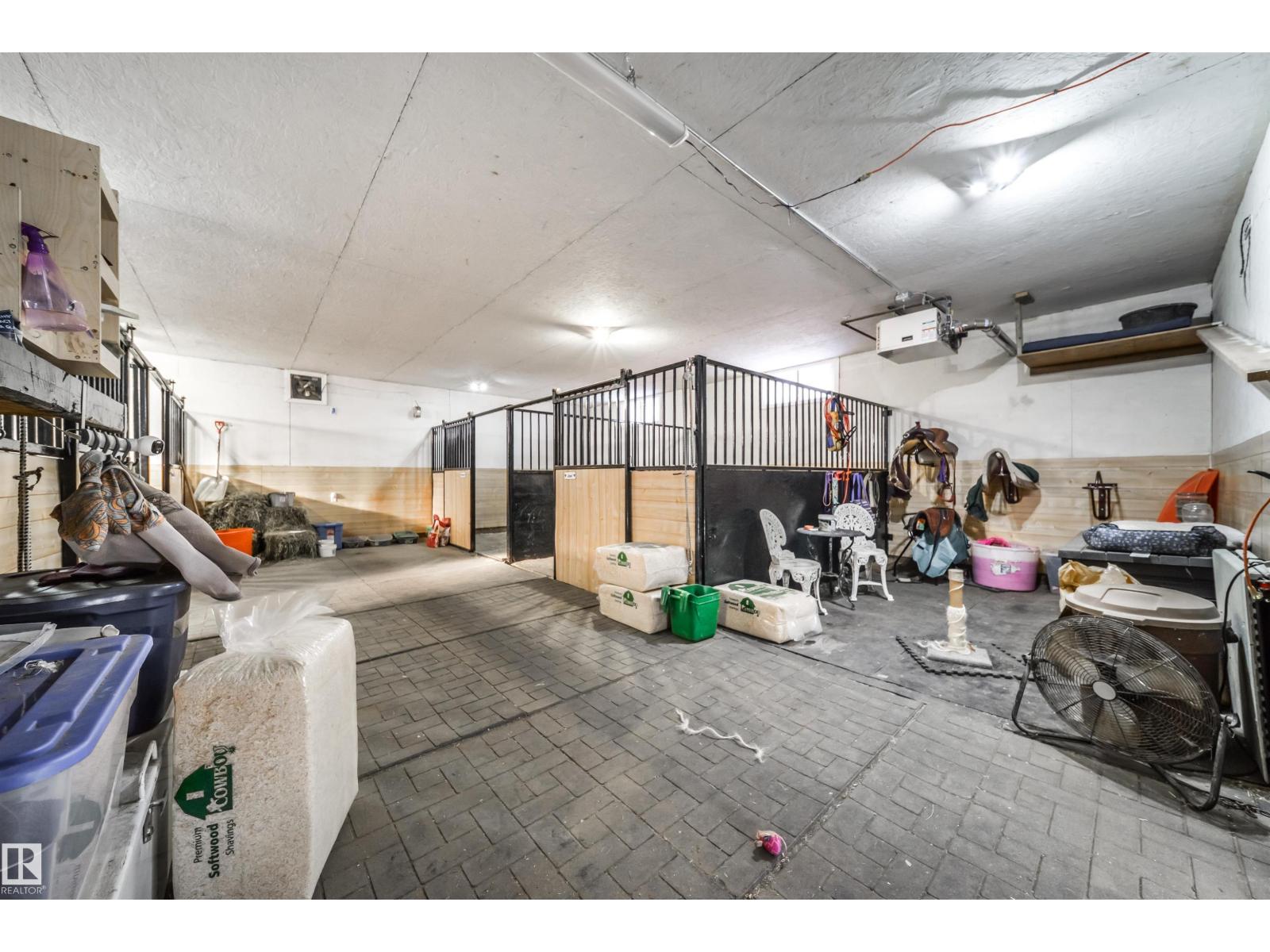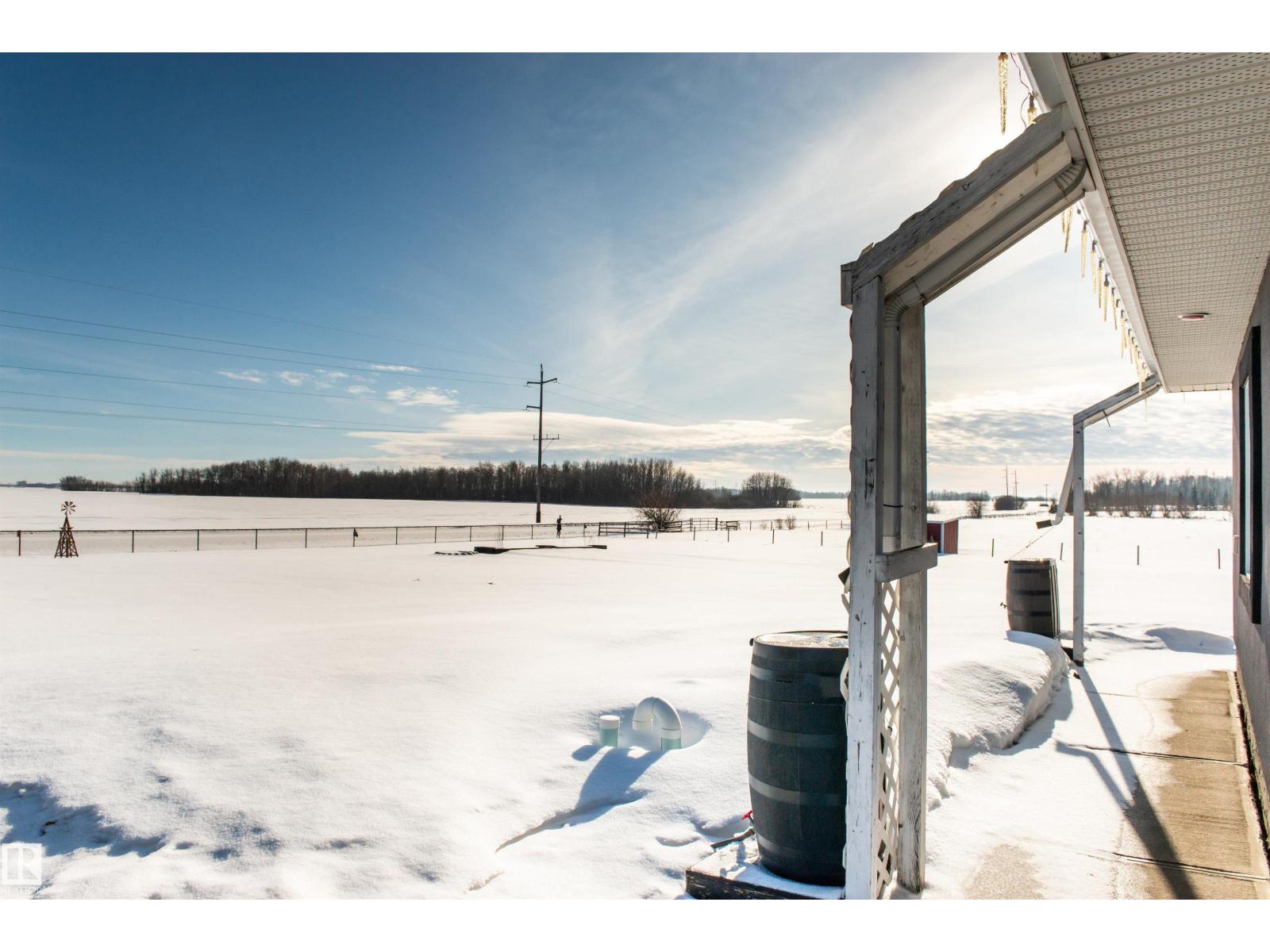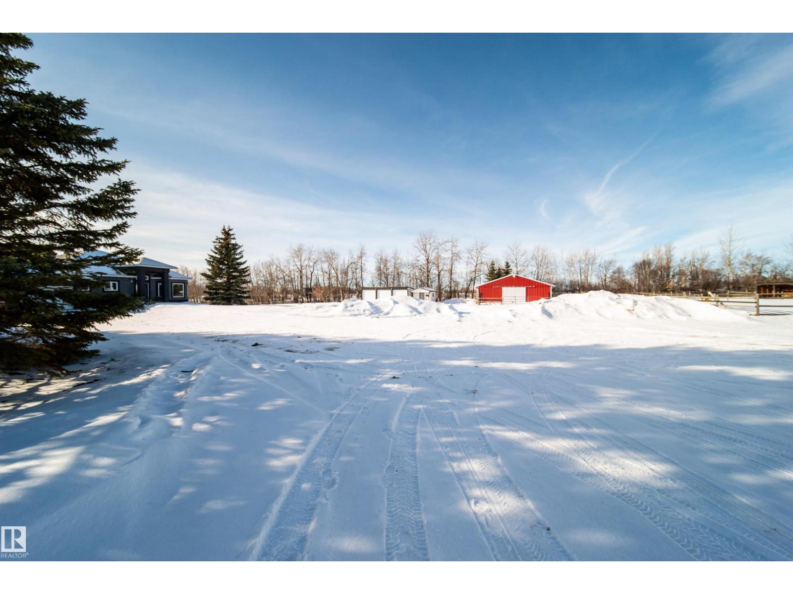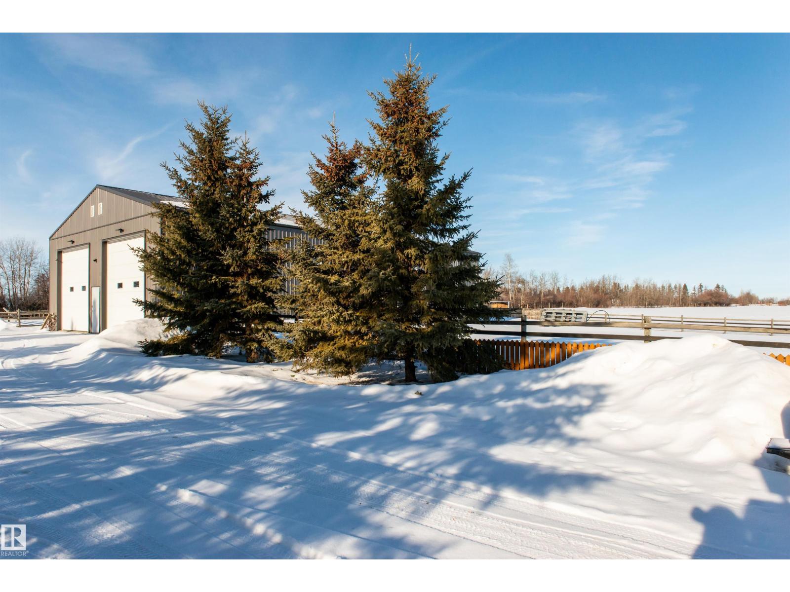 Bring the family and the horses! This beautifully updated 3 bedroom, 3 bath walkout bungalow sits on 12.92 acres just 20 minutes from St. Albert and blends modern comfort with acreage living. The bright open-concept main floor features beautiful kitchen with quartz island, stainless appliances, walk-in pantry, and south-facing views from the dining area with access to a covered deck. The living room offers 11’ ceilings, large windows, and a cozy gas fireplace. A spacious den, laundry/boot room, full bath, and primary suite with ensuite complete the main level. The finished walkout basement includes two bedrooms, hobby room, full bath, and large rec room with pellet stove. Outside you’ll find corrals, riding area, heated 5-stall barn, 2016 massive 78x42 in-floor heated shop with 14’ x14' doors, shed, heated triple attached garage, plus a private 2017 Artic Ozone salt water swim spa with beach house for year-round relaxation. Acreage living done right. Railroad tracks are decommissioned. (id:51989)