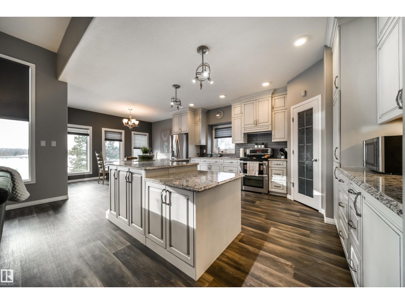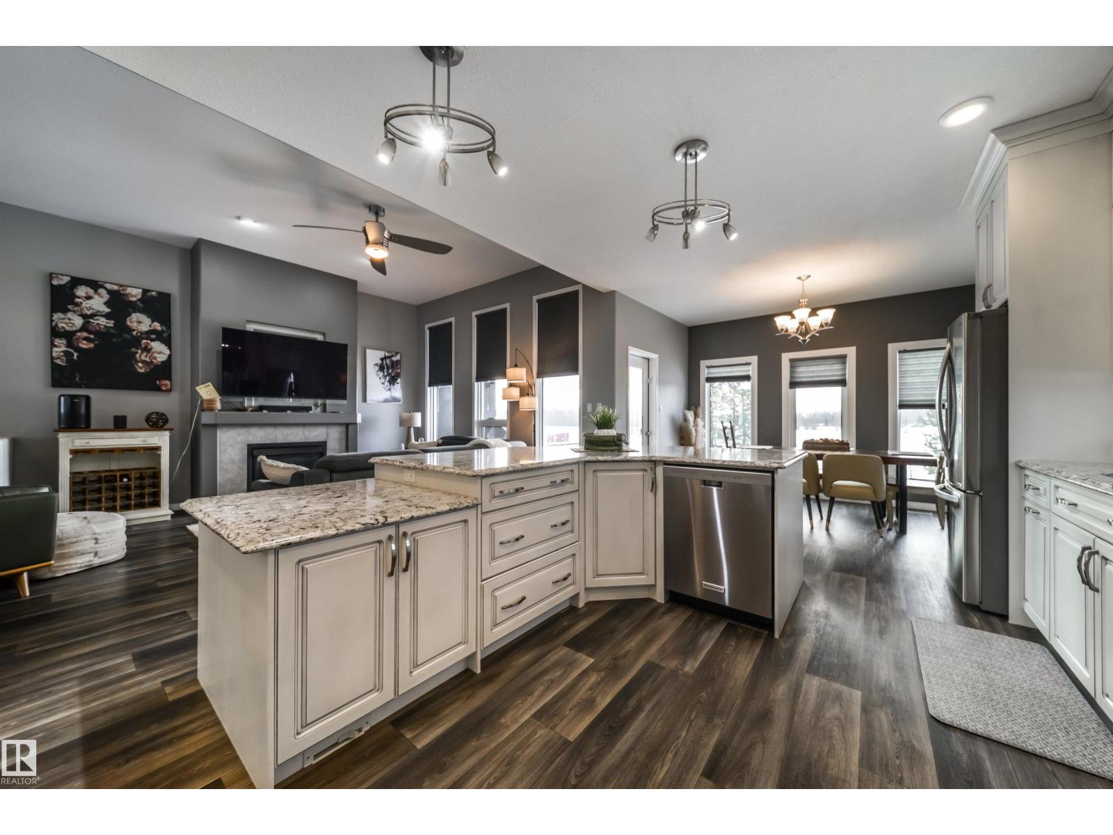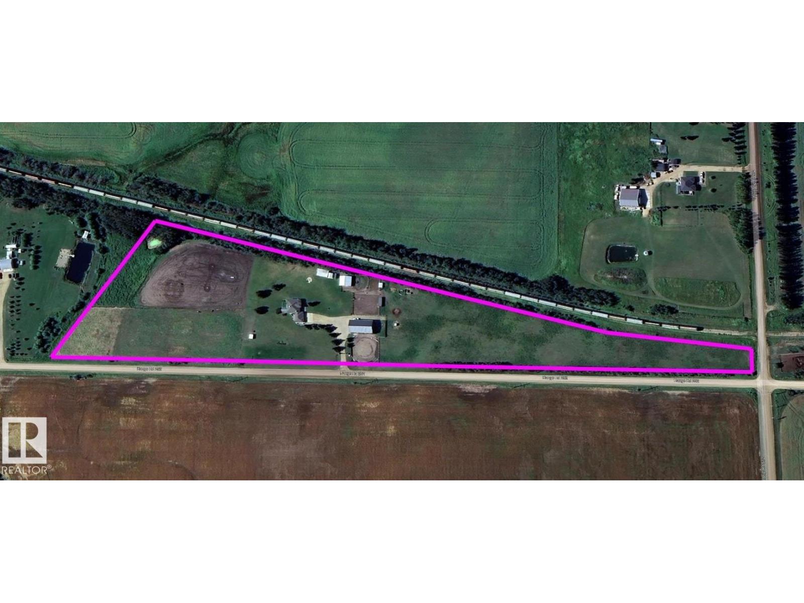 Bring the family and the horses! This beautifully updated 3 bedroom, 3 bath walkout bungalow sits on 12.92 acres just 20 minutes from St. Albert and blends modern comfort with acreage living. The bright open-concept main floor features beautiful kitchen with quartz island, stainless appliances, walk-in pantry, and south-facing views from the dining area with access to a covered deck. The living room offers 11’ ceilings, large windows, and a cozy gas fireplace. A spacious den, laundry/boot room, full bath, and primary suite with ensuite complete the main level. The finished walkout basement includes two bedrooms, hobby room, full bath, and large rec room with pellet stove. Outside you’ll find corrals, riding area, heated 5-stall barn, 2016 massive 78x42 in-floor heated shop with 14’ x14' doors, shed, heated triple attached garage, plus a private 2017 Artic Ozone salt water swim spa with beach house for year-round relaxation. Acreage living done right. Railroad tracks are decommissioned. (id:51989)