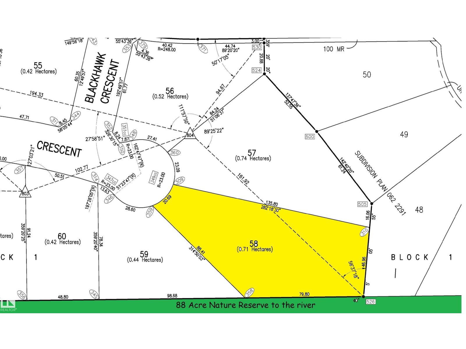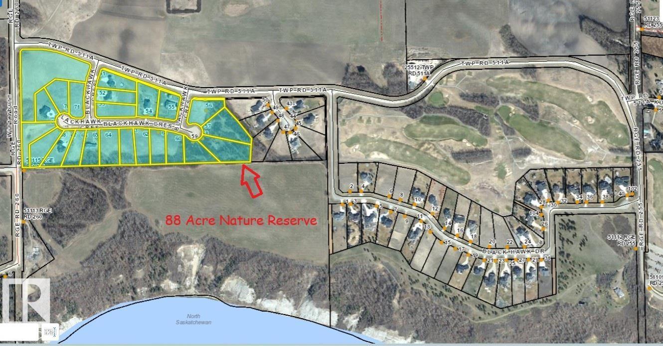 This site is well suited for a hilltop walkout basement style home that does have a great view over the countryside to the river valley. This parcel backs onto the Edmonton Area 88 acres Nature Preserve with 1/2 mile of river frontage and walking trails. There are many fine homes already built in this community. The world class Blackhawk Golf Course is nearby. Included with the sale price are the engineered site and architectural drawings for a 7,000 sq ft hillside bungalow prepared by Dean Thomas Design Group as shown in the photos. From Blackhawk it just a short 15 minute drive to west Edmonton or about the same to the Edmonton International Airport. (id:51989)