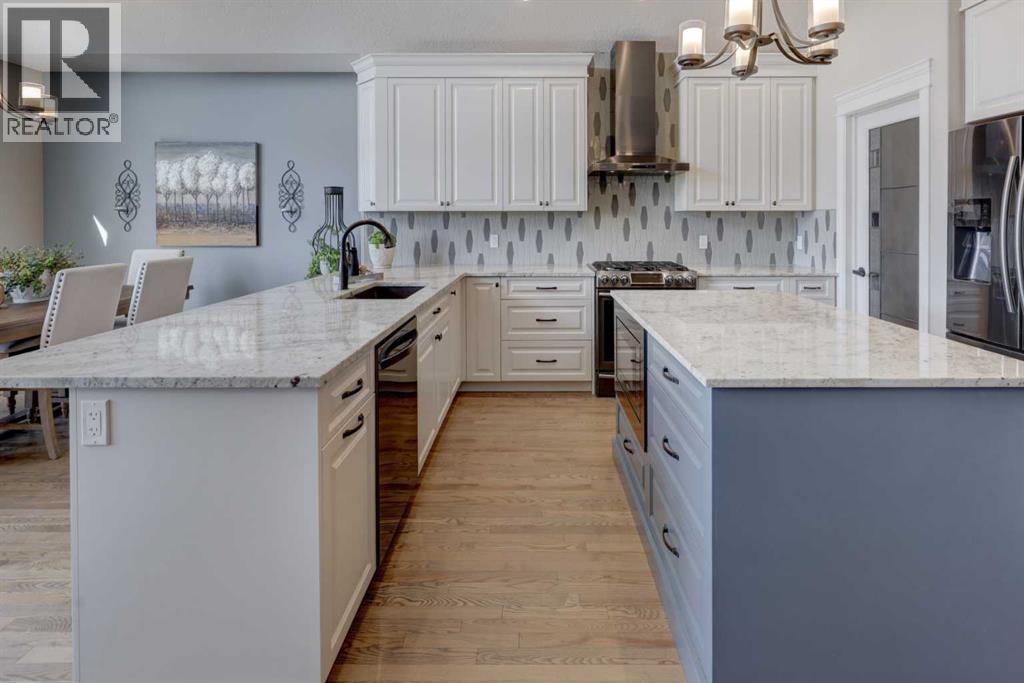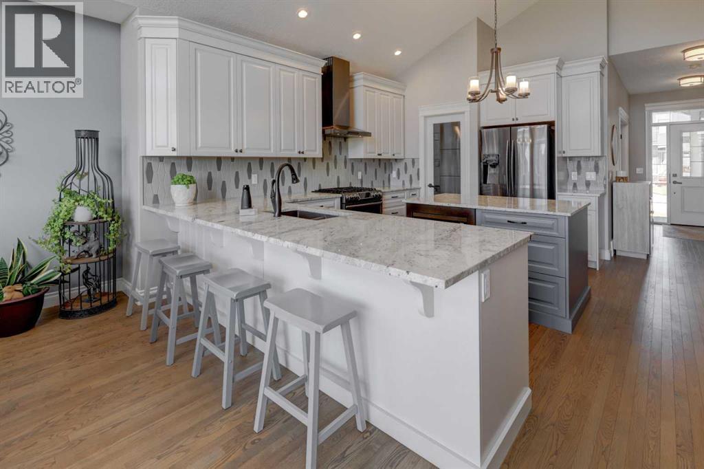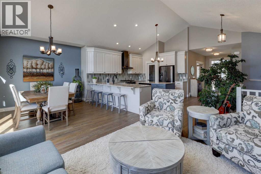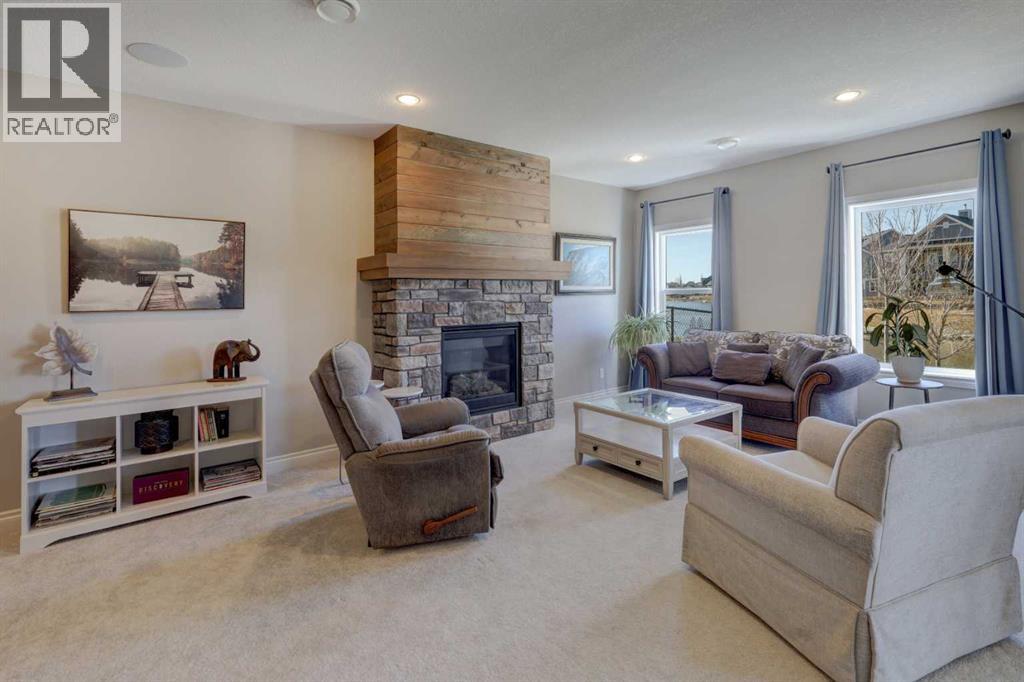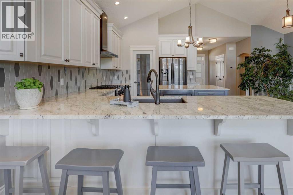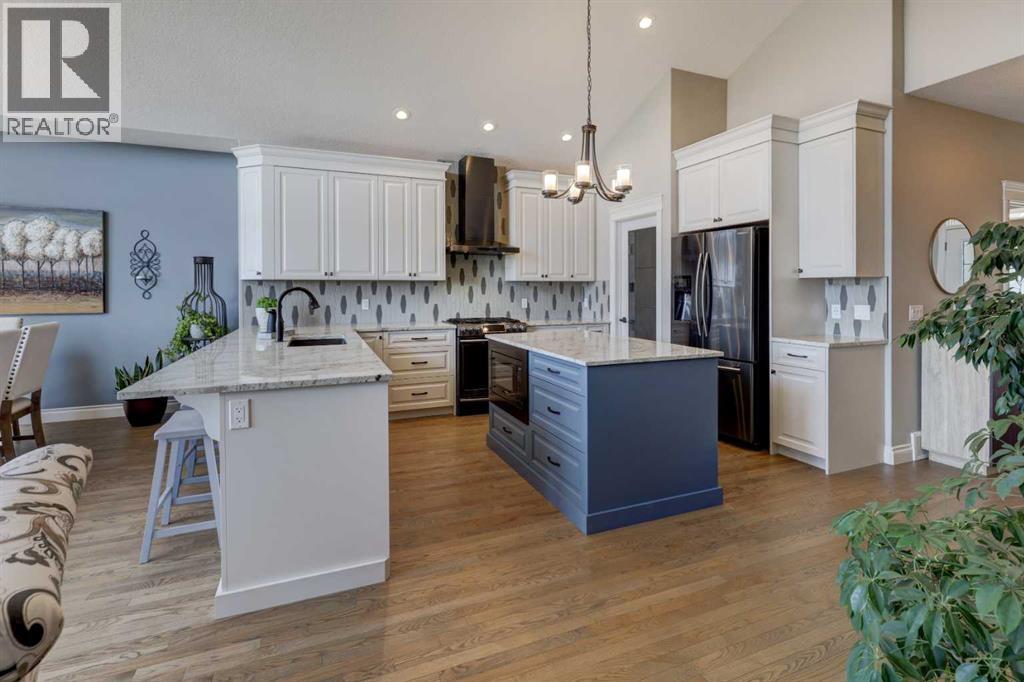 Welcome to this custom built McKee bungalow, proudly offered by the original owner and perfectly positioned on the waterfront in Bayside Estates. Featuring a triple tandem heated garage, this home offers exceptional space for all your vehicles, tools and toys. Step inside to a bright and inviting main floor, showcasing rich hardwood flooring and 9 foot ceilings throughout, complemented by central air conditioning to keep you comfortable year round.. Just off the entrance, a dedicated home office provides the ideal space for remote work or quiet study. As you move further in, the chef-inspired kitchen impresses with custom colors, including cream cabinetry, Black stainless steel appliances, granite countertops with a breakfast bar and a walk-in pantry with an elegant French door. The heart of the home is highlighted by soaring vaulted ceilings and stunning south-facing windows that flood the dining and living areas with natural light. A cozy fireplace creates the perfect ambiance for relaxing evenings. The spacious primary retreat offers a true escape, complete with a luxurious 5 piece ensuite featuring a soaker tub, separate shower, dual vanities and a walk in closet. Step out from the living room onto the expansive upper deck, finished with durable Duradek, where you can take in peaceful waterfront views. A convenient 2-piece bathroom and main floor laundry complete this level. Downstairs, the fully developed walkout basement is designed for entertaining, featuring 9 foot ceilings and a massive recreation and games area with a second fireplace. A custom-built wet bar and kitchenette add both function and flair. This level also includes two additional bedrooms and a 4-piece bathroom. Outside, your private backyard oasis awaits—complete with a concrete patio and direct water access. Whether you're considering a future dock or simply enjoying the setting, this space is perfect for morning coffee or unwinding with a glass of wine in the evening. Located just a short w alk to Nose Creek School (K–4) and close to parks, playgrounds, sports fields, shopping, restaurants, and everyday amenities, this home offers an unbeatable lifestyle. Waterfront. Luxury. Location. This one truly has it all. (id:51989)