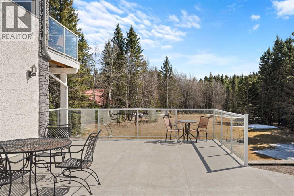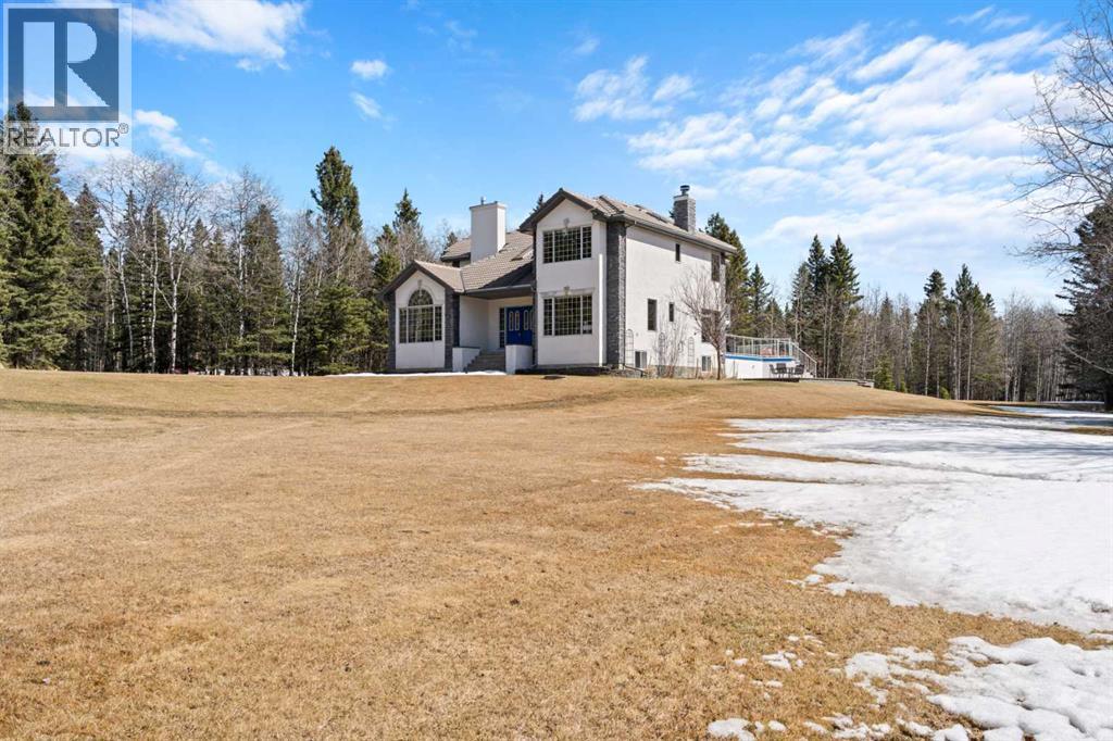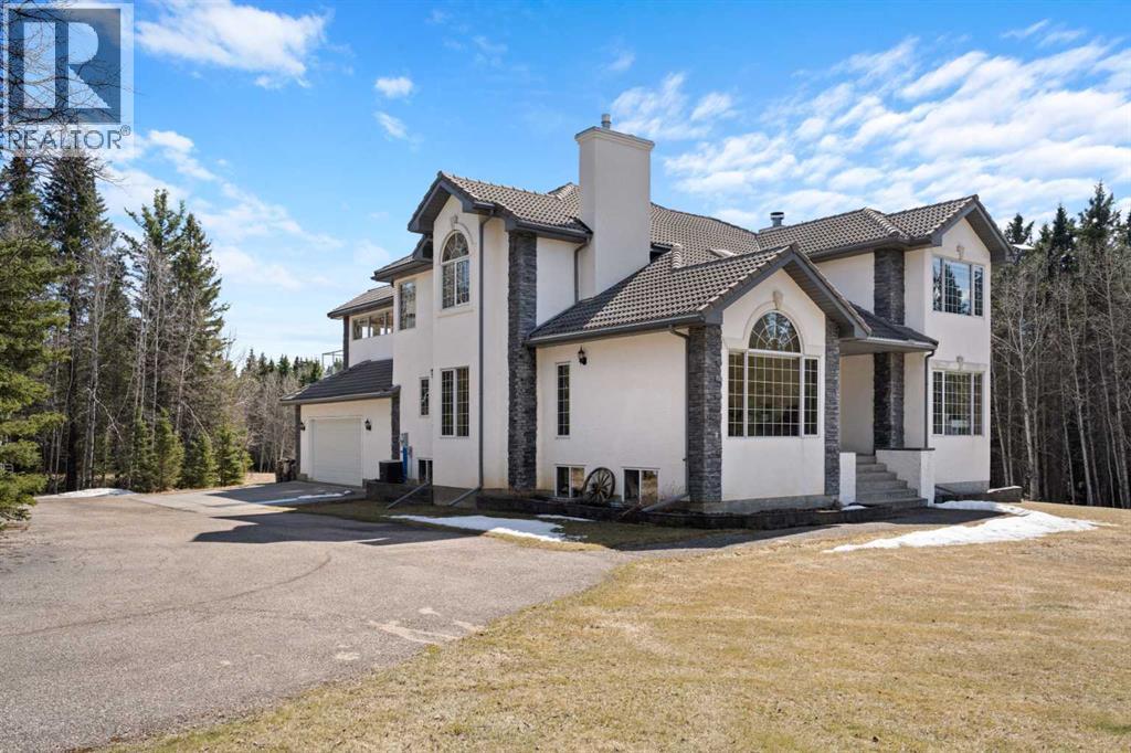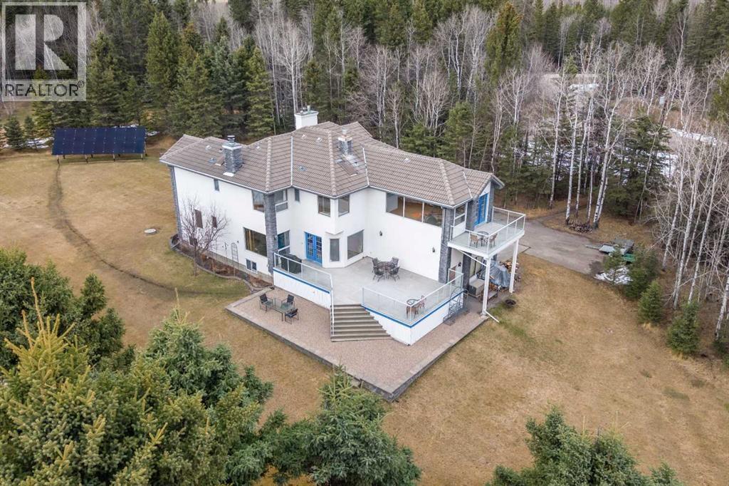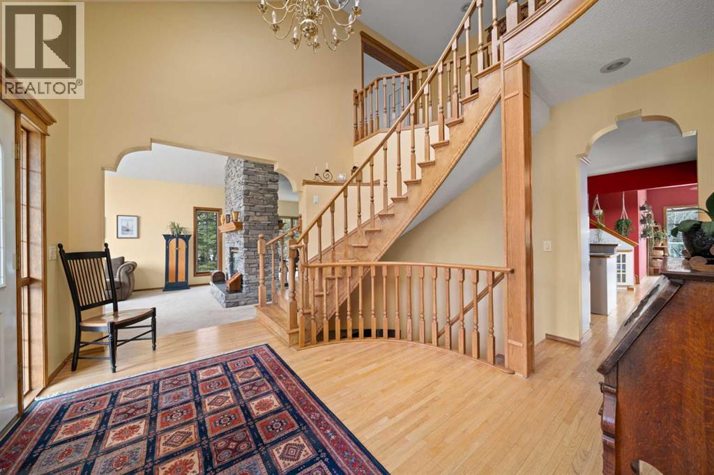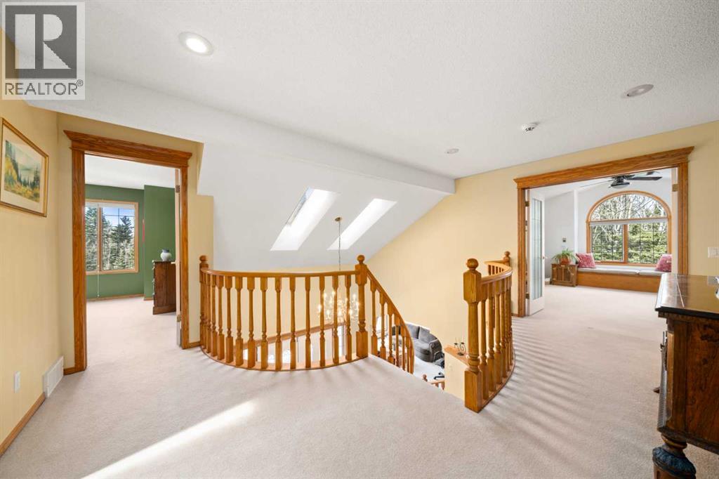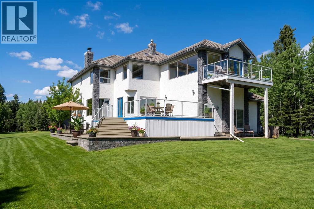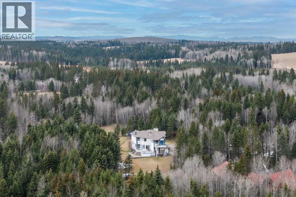 ESTATE LIVING IN WINTERGREEN! ONE OF BRAGG CREEK’S FINEST! PRIVATE CUL-DE-SAC LOCATION ON 2.50 ACRES WITH SW EXPOSURE! Tucked away at the end of a quiet cul-de-sac, this exceptional estate property sits on a stunning 2.50 acre lot surrounded by open meadow, mature trees, and endless sunshine, offering ultimate privacy and a setting that rarely comes available. This home features 3,666 sq ft above grade plus a fully developed lower level designed for both everyday living and entertaining. From the moment you enter you are greeted by a grand curved staircase, soaring ceilings with skylights, and beautiful custom woodwork throughout. The main floor offers a spacious den or office with custom oak built-ins and great views, while the kitchen is the heart of the home with stainless steel appliances including a built-in stove, extensive cabinetry, pantry, large island, and space for a coffee bar, all opening to a cozy living room with a stone-faced wood burning fireplace and a bright dining nook with access to the south facing deck with incredible views. A formal sitting and dining area with a double sided gas fireplace, a half bath, and laundry with chute complete the main floor. Upstairs features a stunning primary retreat with sitting area, built-in bench, gas fireplace, large walk-in closet, and a 5 piece ensuite with corner jacuzzi tub and beautiful south facing views, along with two additional bedrooms with built-in desks and a full 5 piece bathroom. One of the standout features is the upper level bonus room over the garage, filled with natural light, surrounded by windows, and offering access to a private balcony, perfect for a playroom, gym, or media space. The fully finished basement offers 9 ft ceilings, a large rec room, theatre room, two additional bedrooms, and a 4 piece bathroom. The outdoor space is just as impressive with a massive south facing deck finished with duradek, a lower gravel patio, upper balcony, and endless yard space to enjoy. Additional featu res include an oversized double garage with EV charger, solar panels, new high efficiency furnace and hot water tank, concrete tile roof, custom built-ins throughout, and beautiful hardwood flooring. Located just minutes to Bragg Creek with easy access to Kananaskis Country, West Bragg Creek, Elbow Falls, and countless outdoor activities including golf, hiking, biking, and skiing, all while being only 30 minutes to Calgary. This is a rare opportunity to own one of the best locations in Wintergreen and a property that must be seen to be fully appreciated. (id:51989)