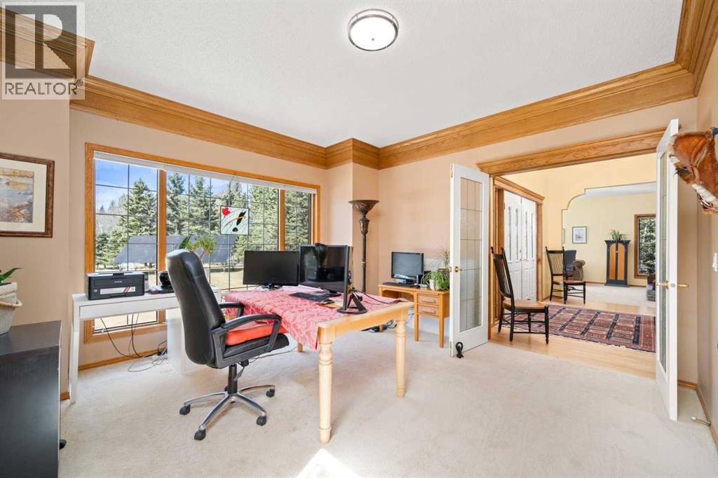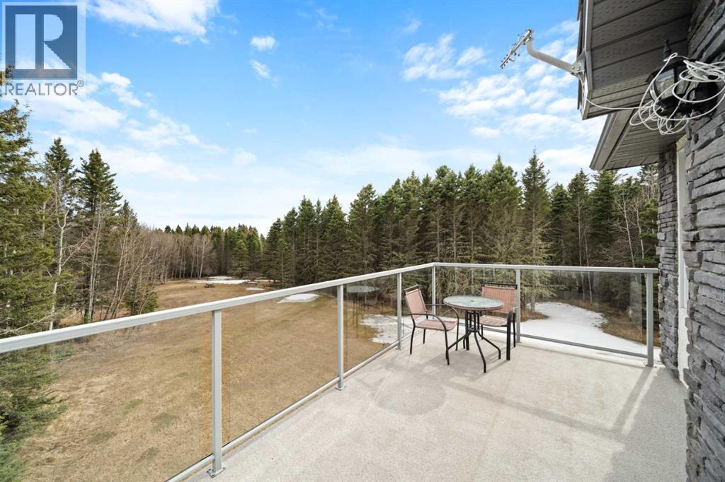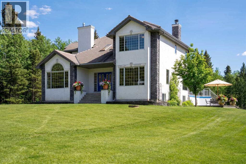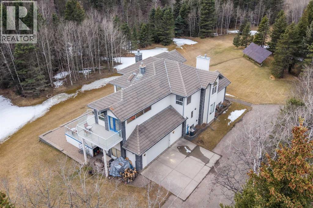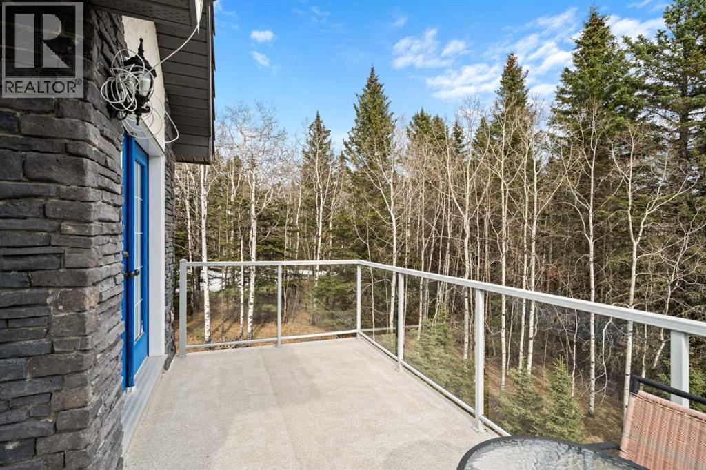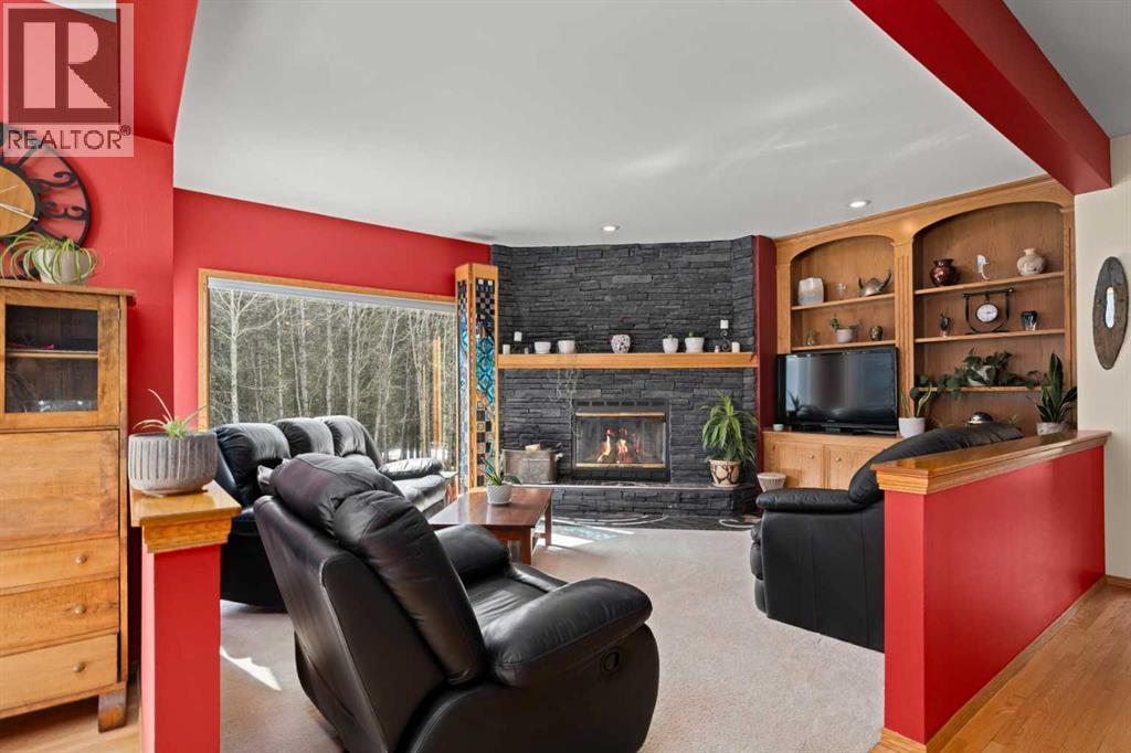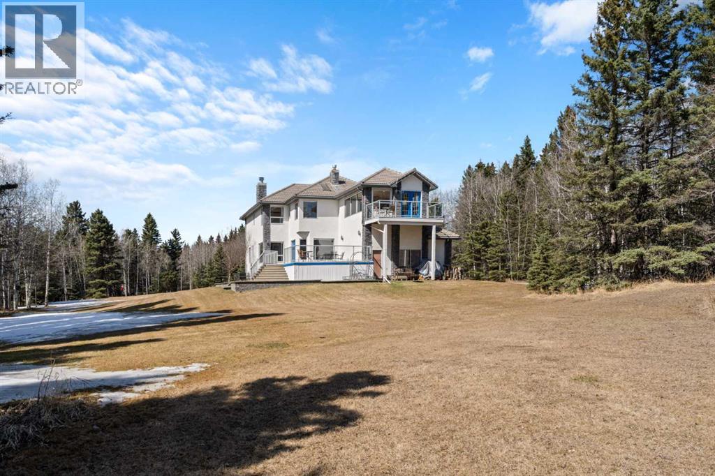 ESTATE LIVING IN WINTERGREEN! ONE OF BRAGG CREEK’S FINEST! PRIVATE CUL-DE-SAC LOCATION ON 2.50 ACRES WITH SW EXPOSURE! Tucked away at the end of a quiet cul-de-sac, this exceptional estate property sits on a stunning 2.50 acre lot surrounded by open meadow, mature trees, and endless sunshine, offering ultimate privacy and a setting that rarely comes available. This home features 3,666 sq ft above grade plus a fully developed lower level designed for both everyday living and entertaining. From the moment you enter you are greeted by a grand curved staircase, soaring ceilings with skylights, and beautiful custom woodwork throughout. The main floor offers a spacious den or office with custom oak built-ins and great views, while the kitchen is the heart of the home with stainless steel appliances including a built-in stove, extensive cabinetry, pantry, large island, and space for a coffee bar, all opening to a cozy living room with a stone-faced wood burning fireplace and a bright dining nook with access to the south facing deck with incredible views. A formal sitting and dining area with a double sided gas fireplace, a half bath, and laundry with chute complete the main floor. Upstairs features a stunning primary retreat with sitting area, built-in bench, gas fireplace, large walk-in closet, and a 5 piece ensuite with corner jacuzzi tub and beautiful south facing views, along with two additional bedrooms with built-in desks and a full 5 piece bathroom. One of the standout features is the upper level bonus room over the garage, filled with natural light, surrounded by windows, and offering access to a private balcony, perfect for a playroom, gym, or media space. The fully finished basement offers 9 ft ceilings, a large rec room, theatre room, two additional bedrooms, and a 4 piece bathroom. The outdoor space is just as impressive with a massive south facing deck finished with duradek, a lower gravel patio, upper balcony, and endless yard space to enjoy. Additional featu res include an oversized double garage with EV charger, solar panels, new high efficiency furnace and hot water tank, concrete tile roof, custom built-ins throughout, and beautiful hardwood flooring. Located just minutes to Bragg Creek with easy access to Kananaskis Country, West Bragg Creek, Elbow Falls, and countless outdoor activities including golf, hiking, biking, and skiing, all while being only 30 minutes to Calgary. This is a rare opportunity to own one of the best locations in Wintergreen and a property that must be seen to be fully appreciated. (id:51989)