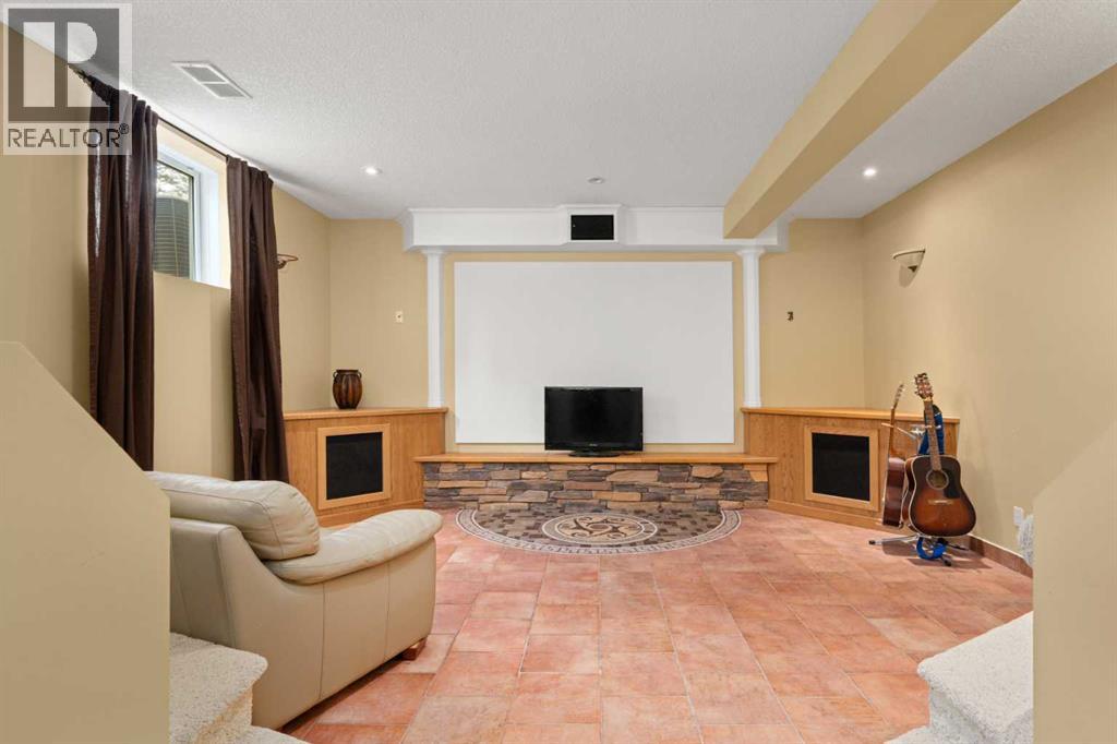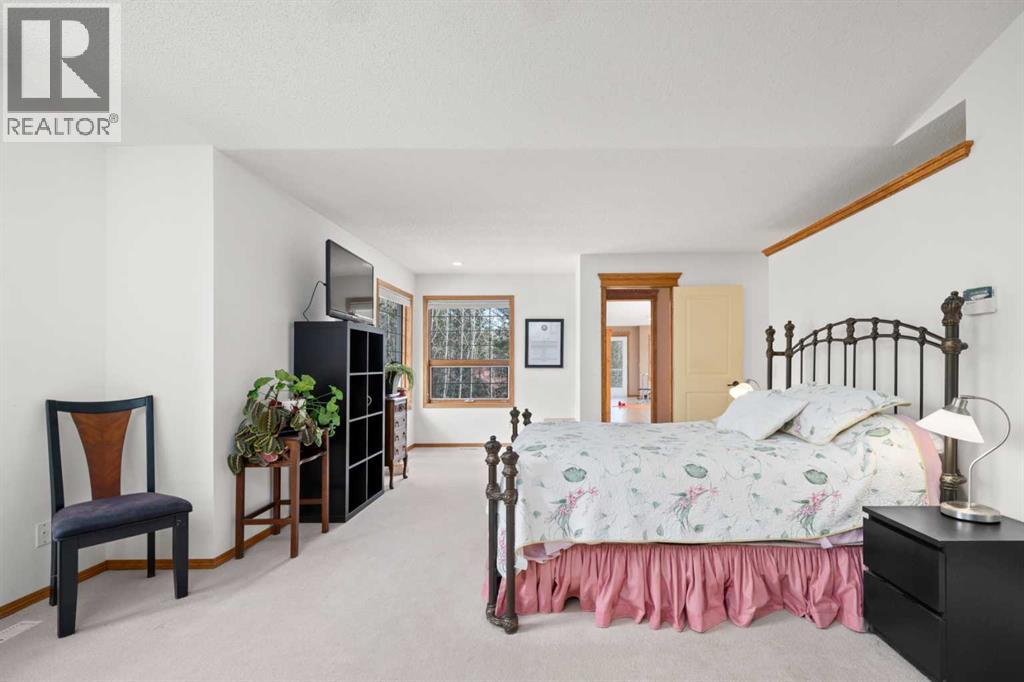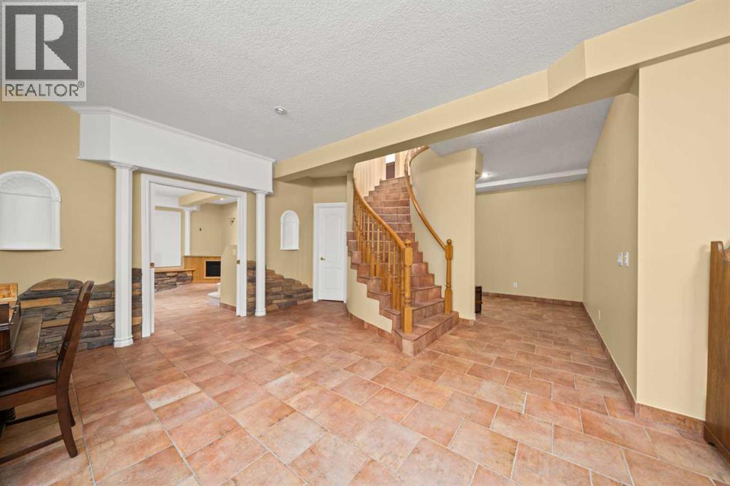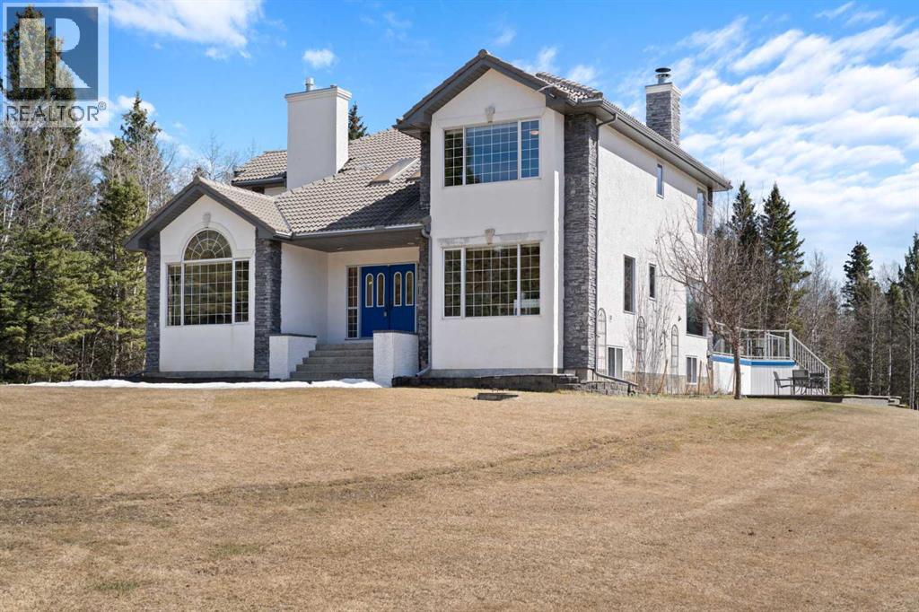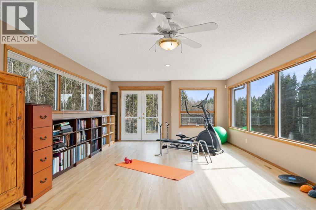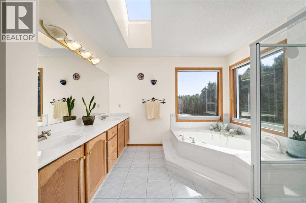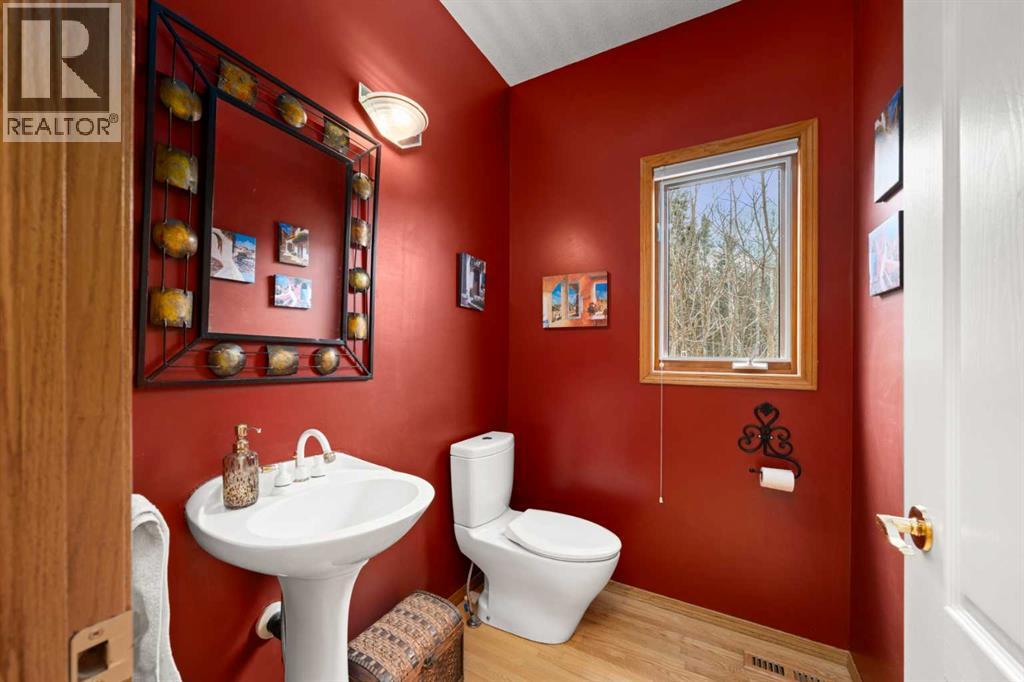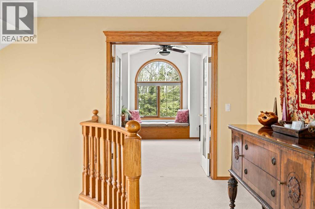 ESTATE LIVING IN WINTERGREEN! ONE OF BRAGG CREEK’S FINEST! PRIVATE CUL-DE-SAC LOCATION ON 2.50 ACRES WITH SW EXPOSURE! Tucked away at the end of a quiet cul-de-sac, this exceptional estate property sits on a stunning 2.50 acre lot surrounded by open meadow, mature trees, and endless sunshine, offering ultimate privacy and a setting that rarely comes available. This home features 3,666 sq ft above grade plus a fully developed lower level designed for both everyday living and entertaining. From the moment you enter you are greeted by a grand curved staircase, soaring ceilings with skylights, and beautiful custom woodwork throughout. The main floor offers a spacious den or office with custom oak built-ins and great views, while the kitchen is the heart of the home with stainless steel appliances including a built-in stove, extensive cabinetry, pantry, large island, and space for a coffee bar, all opening to a cozy living room with a stone-faced wood burning fireplace and a bright dining nook with access to the south facing deck with incredible views. A formal sitting and dining area with a double sided gas fireplace, a half bath, and laundry with chute complete the main floor. Upstairs features a stunning primary retreat with sitting area, built-in bench, gas fireplace, large walk-in closet, and a 5 piece ensuite with corner jacuzzi tub and beautiful south facing views, along with two additional bedrooms with built-in desks and a full 5 piece bathroom. One of the standout features is the upper level bonus room over the garage, filled with natural light, surrounded by windows, and offering access to a private balcony, perfect for a playroom, gym, or media space. The fully finished basement offers 9 ft ceilings, a large rec room, theatre room, two additional bedrooms, and a 4 piece bathroom. The outdoor space is just as impressive with a massive south facing deck finished with duradek, a lower gravel patio, upper balcony, and endless yard space to enjoy. Additional featu res include an oversized double garage with EV charger, solar panels, new high efficiency furnace and hot water tank, concrete tile roof, custom built-ins throughout, and beautiful hardwood flooring. Located just minutes to Bragg Creek with easy access to Kananaskis Country, West Bragg Creek, Elbow Falls, and countless outdoor activities including golf, hiking, biking, and skiing, all while being only 30 minutes to Calgary. This is a rare opportunity to own one of the best locations in Wintergreen and a property that must be seen to be fully appreciated. (id:51989)