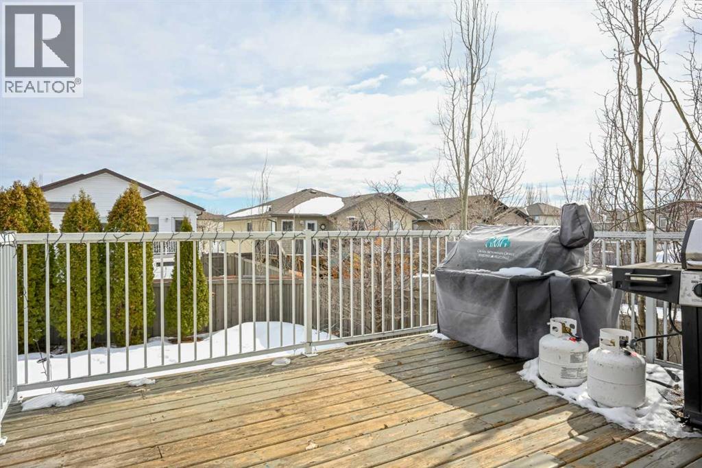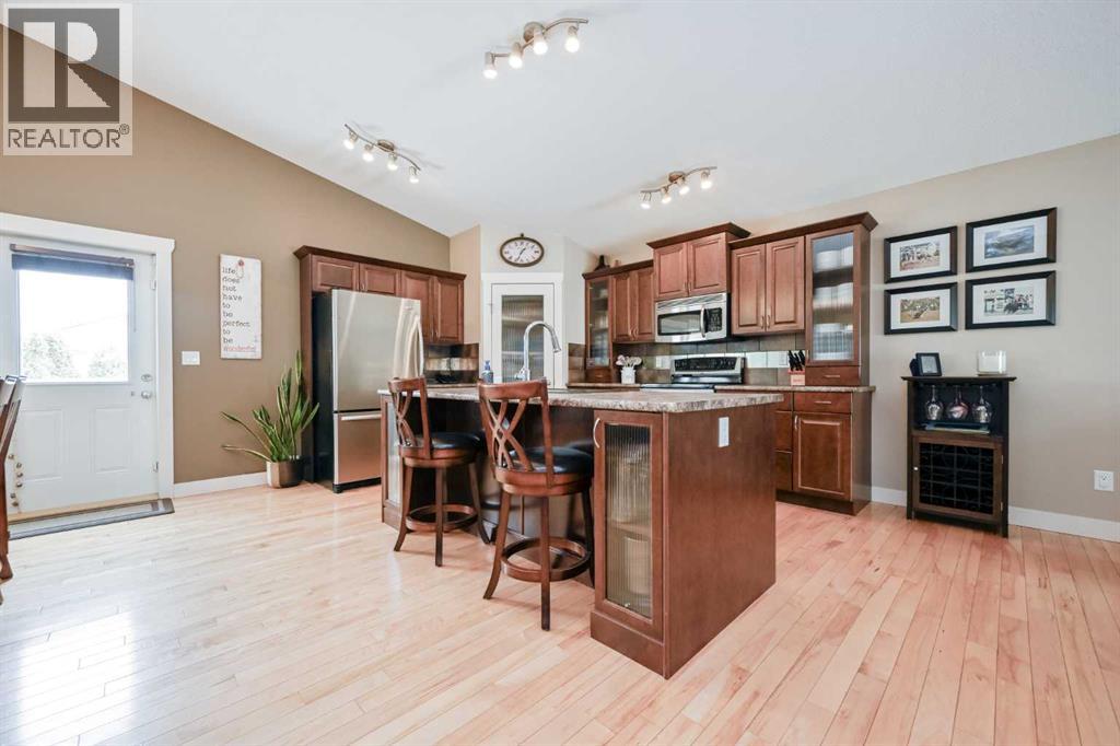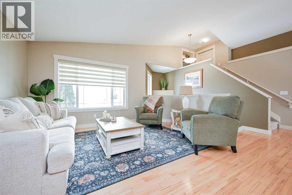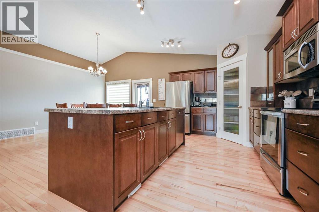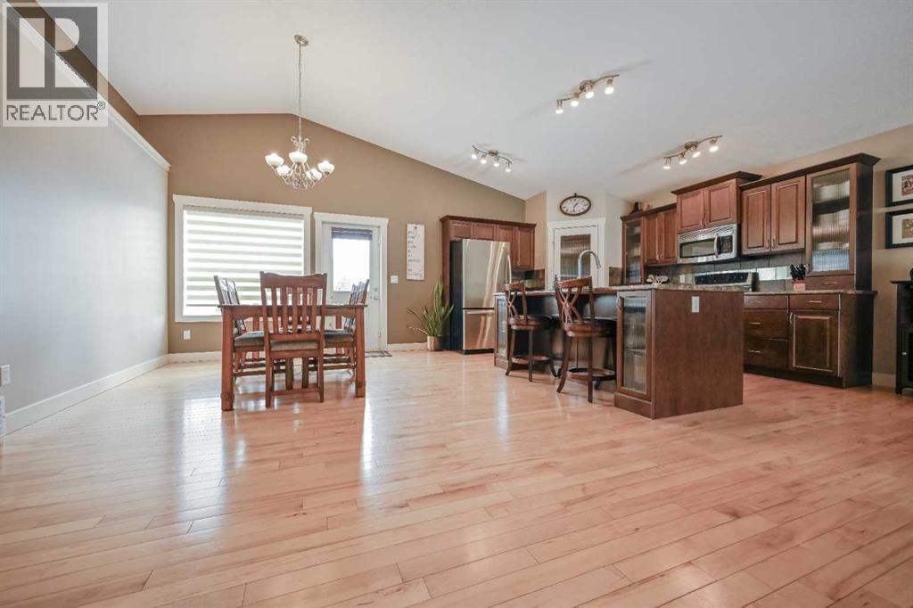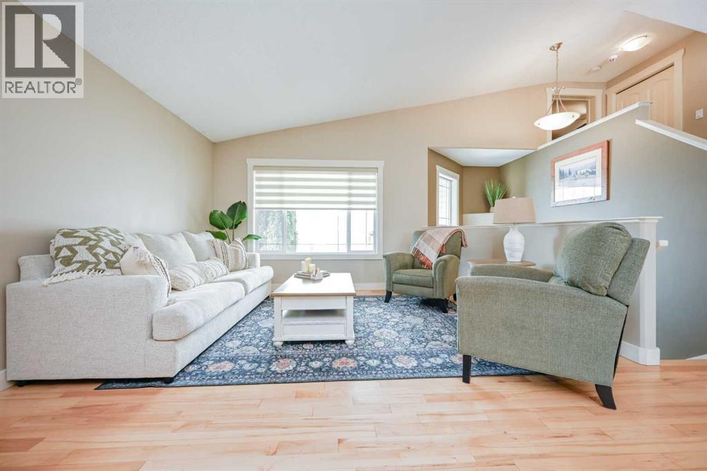 Move in ready across from a playground park in beautiful Signature Falls. This fully developed modified bi-level offers four bedrooms and two full bathrooms with excellent finishes throughout. You'll be impressed with the vaulted ceilings and hardwood floors that run throughout the main living area. The thoughtfully designed kitchen includes an large island with breakfast bar, dark cabinetry stainless appliances and walk in pantry. The bright and inviting living room boasts a large window providing bright light perfect for relaxing or entertaining. Enjoy family meals in the spacious dining area and a garden door which opens onto the deck. Main floor includes two bedrooms and a full bathroom, while the private primary suite is tucked above the garage and features a huge walk-in closet and five piece ensuite. The finished basement offers 9' ceilings along with a large family room, one more bedroom, laundry area and the option to add a third full bath. The attached 24' X 26' garage is finished and heated and ready for Alberta winters. Outside you'll love the large deck for the BBQ that overlooks the spacious east exposed fenced and beautifully landscaped yard with firepit. The location here can't be beat, with a park/playground across the street, walking trails, pond and quick access to getting around doesn't get any easier than this. Come and see for yourself what this incredible home has to offer! (id:51989)