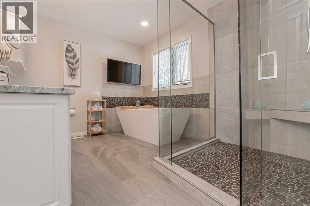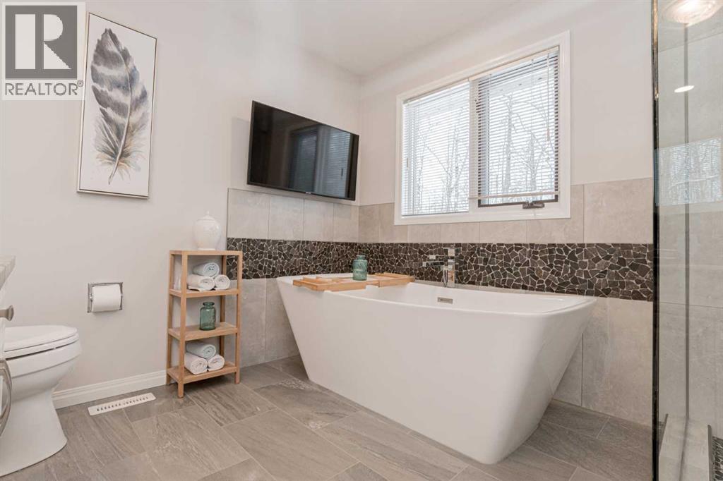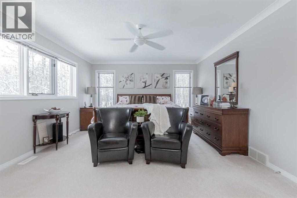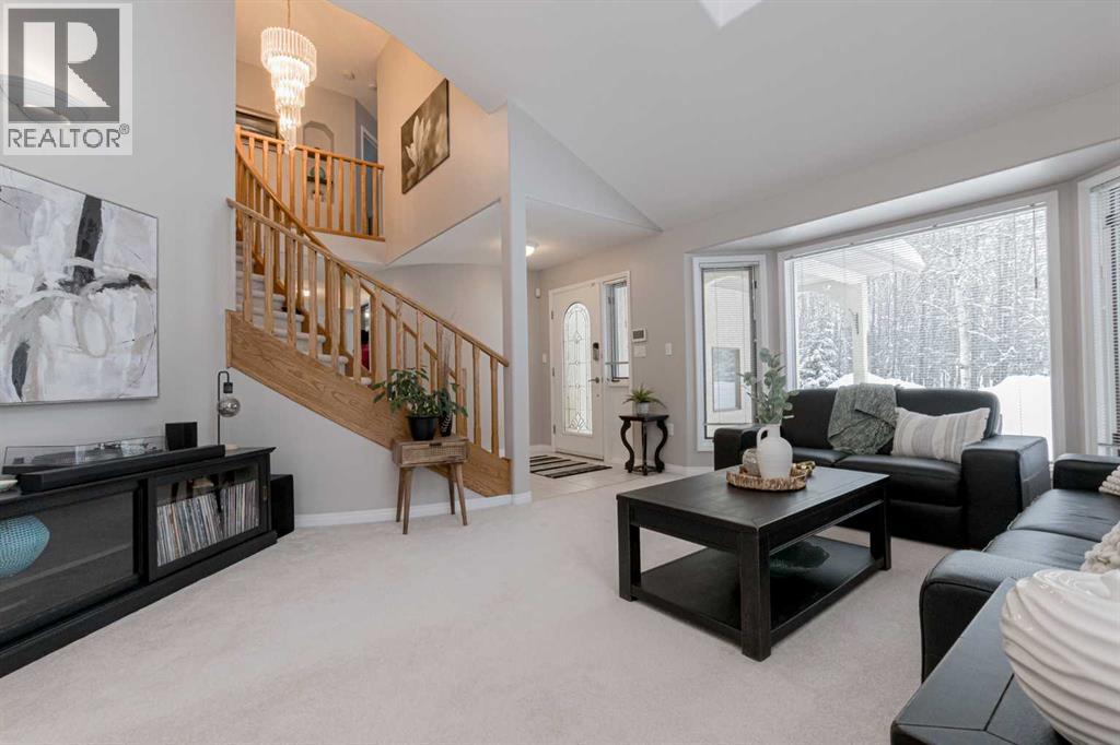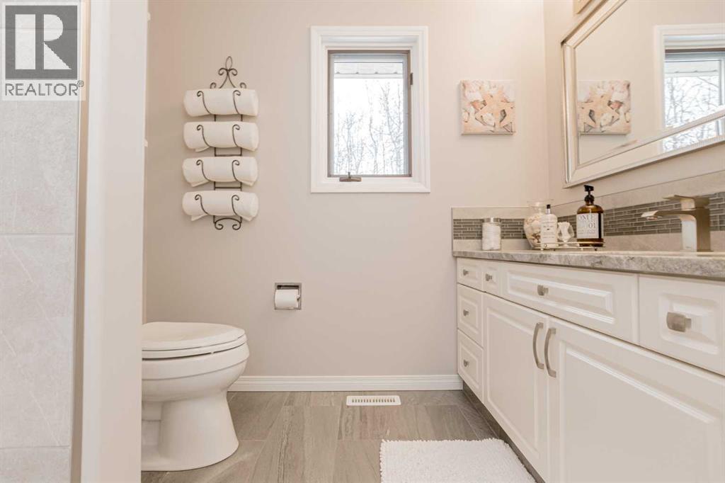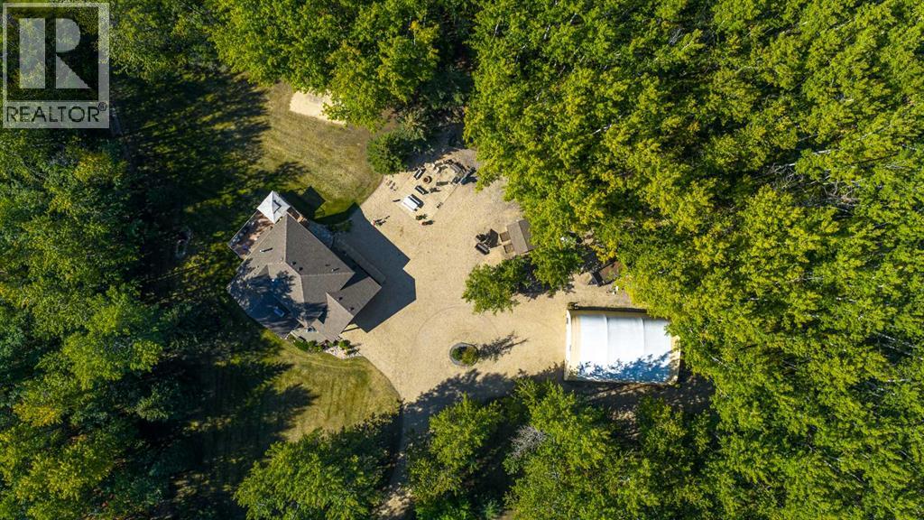 Immaculate custom-built top quality 1.5-storey home on a completely private, treed 5-acre parcel — on pavement and just minutes from popular amenities. Offering over 2,300 sq ft, this beautifully maintained home showcases numerous upgrades, including a renovated kitchen featuring white cabinetry, updated countertops, remodeled pantry, and new appliances. The cozy TV room and breakfast nook open onto a 16' x 32' composite rear deck complete with glass railing, gas BBQ hookup, pergola, and serene, private views — perfect for entertaining or relaxing. Just off the kitchen is the formal dining area highlighted by a striking three-sided fireplace, updated skylights, new windows, and hardwood flooring that flows into the elegant front sitting room with bright east-facing windows. The main floor also offers a convenient laundry room located near the half bath and attached double garage with radiant heat. The welcoming front entry leads to a stunning spiral staircase and upper level featuring a sprawling primary suite with fireplace, new windows, walk-in closet, and an updated ensuite with glass shower, soaker tub, and modern vanity. Two additional oversized bedrooms, an updated full bath, and a flexible bedroom/bonus room space complete this space along with upper-level AC. The basement is partially developed with rec room area & sewing room and includes two hot water tanks, dual furnaces, pressure system, and RO system. Outside, this CR-5 zoned property is meticulously landscaped and includes a large 24' x 60' Arch-Rib Coverall building with power and gravel floor, gravel parking pad, two storage sheds, and newer shingles replaced in 2020 — all surrounded by trees and pure privacy. This is a rare opportunity to purchase a stunning acreage close to town that is CR5 with pavement access and ultimate seclusion. City water available at curb. This home shows 10/10 and you can feel the pride in ownership as soon as you approach the welcoming curved driveway. Every detail has been well thought out from the construction to the recent updates. This is not just a home; it's a lifestyle! (id:51989)
