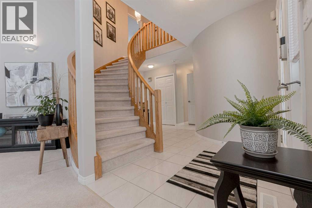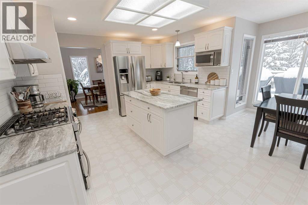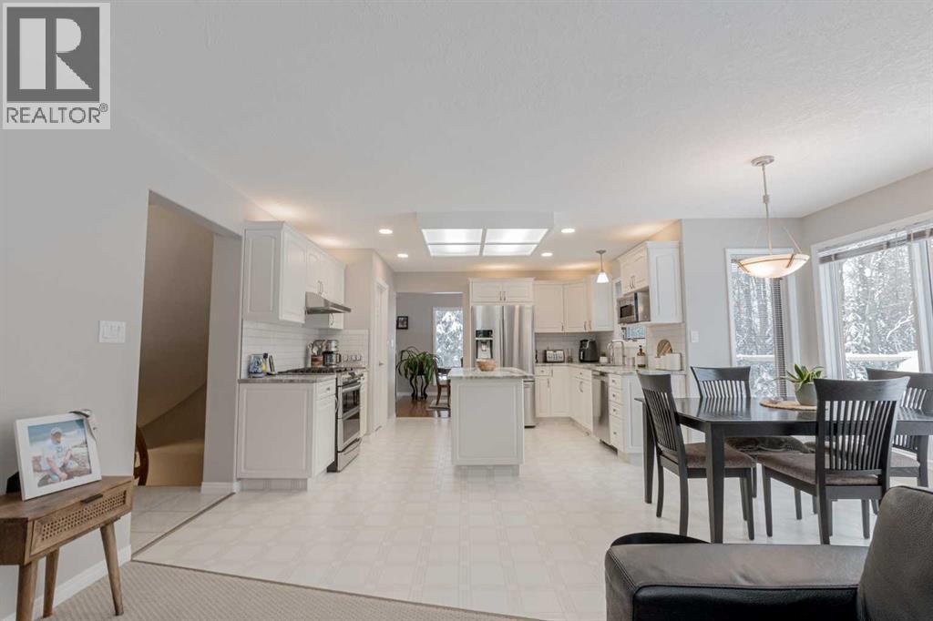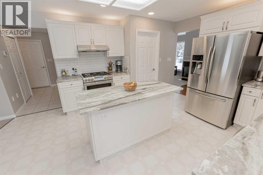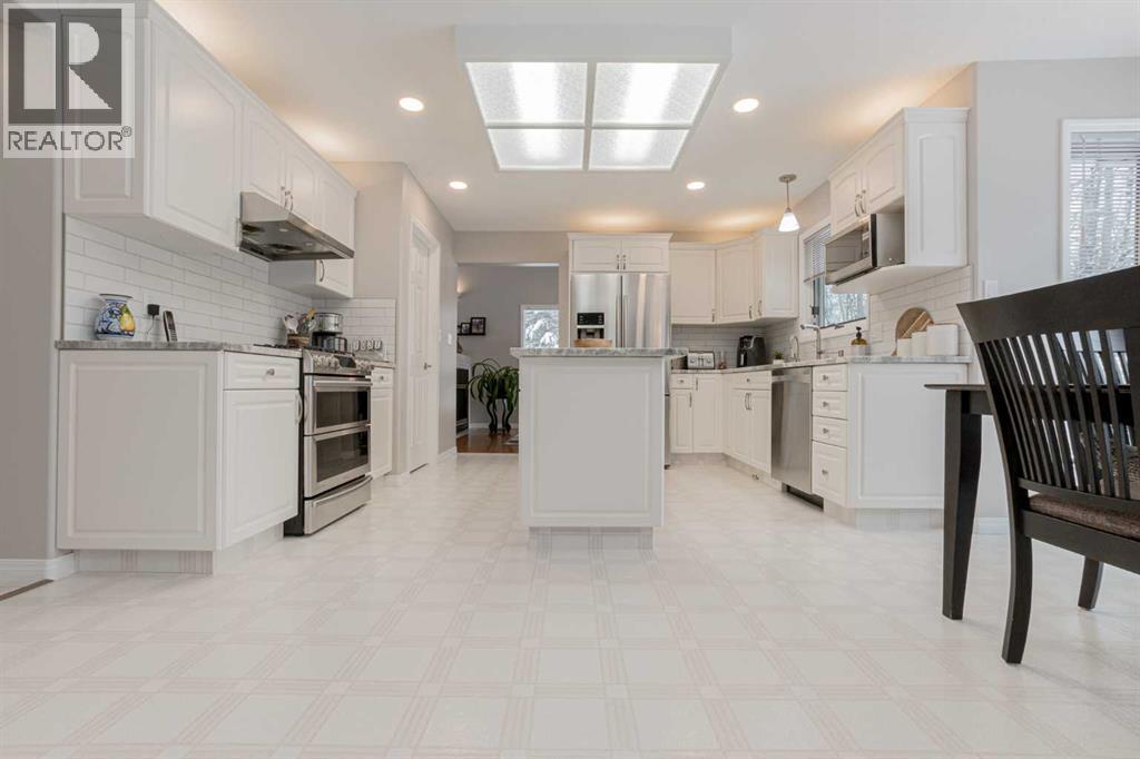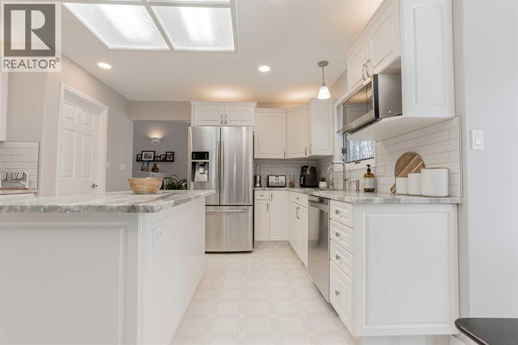 Immaculate custom-built top quality 1.5-storey home on a completely private, treed 5-acre parcel — on pavement and just minutes from popular amenities. Offering over 2,300 sq ft, this beautifully maintained home showcases numerous upgrades, including a renovated kitchen featuring white cabinetry, updated countertops, remodeled pantry, and new appliances. The cozy TV room and breakfast nook open onto a 16' x 32' composite rear deck complete with glass railing, gas BBQ hookup, pergola, and serene, private views — perfect for entertaining or relaxing. Just off the kitchen is the formal dining area highlighted by a striking three-sided fireplace, updated skylights, new windows, and hardwood flooring that flows into the elegant front sitting room with bright east-facing windows. The main floor also offers a convenient laundry room located near the half bath and attached double garage with radiant heat. The welcoming front entry leads to a stunning spiral staircase and upper level featuring a sprawling primary suite with fireplace, new windows, walk-in closet, and an updated ensuite with glass shower, soaker tub, and modern vanity. Two additional oversized bedrooms, an updated full bath, and a flexible bedroom/bonus room space complete this space along with upper-level AC. The basement is partially developed with rec room area & sewing room and includes two hot water tanks, dual furnaces, pressure system, and RO system. Outside, this CR-5 zoned property is meticulously landscaped and includes a large 24' x 60' Arch-Rib Coverall building with power and gravel floor, gravel parking pad, two storage sheds, and newer shingles replaced in 2020 — all surrounded by trees and pure privacy. This is a rare opportunity to purchase a stunning acreage close to town that is CR5 with pavement access and ultimate seclusion. City water available at curb. This home shows 10/10 and you can feel the pride in ownership as soon as you approach the welcoming curved driveway. Every detail has been well thought out from the construction to the recent updates. This is not just a home; it's a lifestyle! (id:51989)