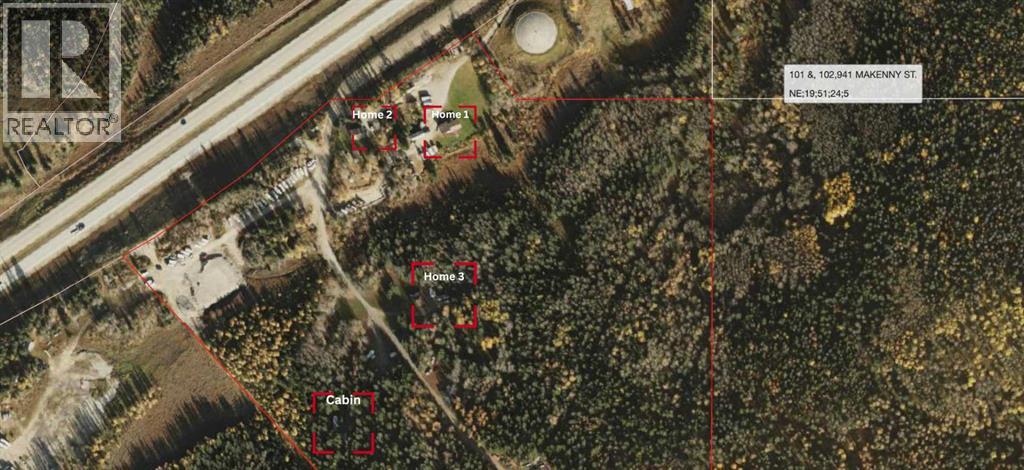 Your out door oasis awaits you!. 779 Mackenny street is a 71.91 Acre sub dividable lot located south of hiway 16 within Hinton municipal boundary. It is loaded with endless potential and so many extras! This is a private secluded parcel with developed road and trail system throughout. The main 4 bedroom home sits upon an expansive open field with views of wooded forest in all directions. This home also features custom hickory kitchen cabinets that opens up to a massive, newly constructed private wrap around deck with its own hot tub. The main home area also includes a heated 14x40 shop with 220V power supply, several storage sheds and a large fire pit. This property comes with 2 more separate homes and a secluded cabin. There is so much room to roam here, there is even an C-can & RV Storage row plus 3 Large illuminated highway signs facing east bound lane and 3 facing westbound lanes. These are also included as an attached chattel with this parcel. The back of this parcel you will find additional seasonal storage area plus a lay down yard and gravel pit. There is prime black dirt located here. Moving further back into the forest there is a another clearing that provides provides secluded quiet camping. There is endless opportunities for exploring the large parcel and beyond with trails and paths leading to crown land. This property is sure attract private buyers and developers alike with its flexible zoning and endless potential for private living. The seller is negotiable on subdivision of land and will negotiate the price and land areas. See pictures for proposal. (id:51989)