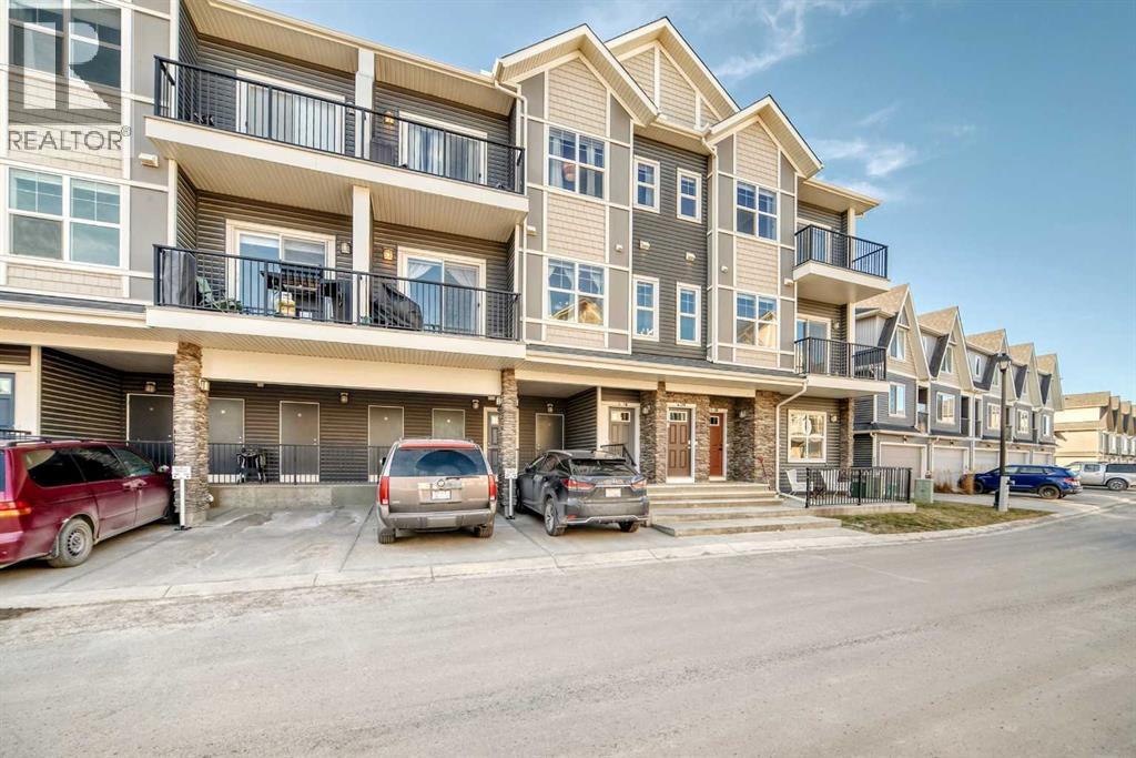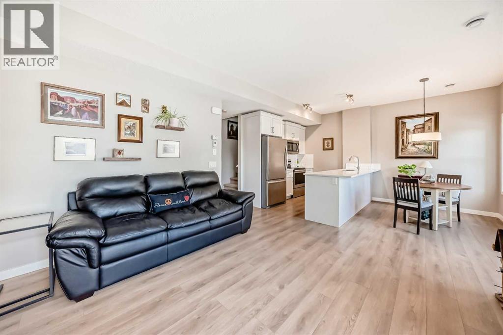 Discover this beautifully maintained and upgraded townhome in Fireside with views of the pond and green space that create a peaceful, nature-inspired backdrop to everyday living. The bright, open-concept layout showcases a modern kitchen with quartz countertops, white European-style cabinetry with custom PULL-OUT shelving, stainless steel appliances, island with breakfast bar and PANTRY. Also features wide plank flooring, plush carpets, 9-foot ceilings, quartz counters throughout, and energy-efficient LED lighting. Large windows flood the home with natural light and patio doors open to two private balconies with views of the pond, ideal for morning coffee or evening relaxation. The home offers two spacious bedrooms, including a primary bedroom with a walk-in closet, a full bathroom and a stylish powder room, upper-floor laundry, ample in-unit storage, as well as a designated enclosed, heated storage unit and a titled parking at the side of your front door, just perfect for off loading groceries and everyday errands. Located in a well-managed, family-friendly complex close to schools, parks, walking paths, shopping, and recreation, with easy access to Calgary and approximately one hour from Banff and Canmore. Carefully crafted and elegantly finished, this property combines comfort, style, and functionality. This home delivers exceptional value and lifestyle for the discerning buyer. (id:51989)