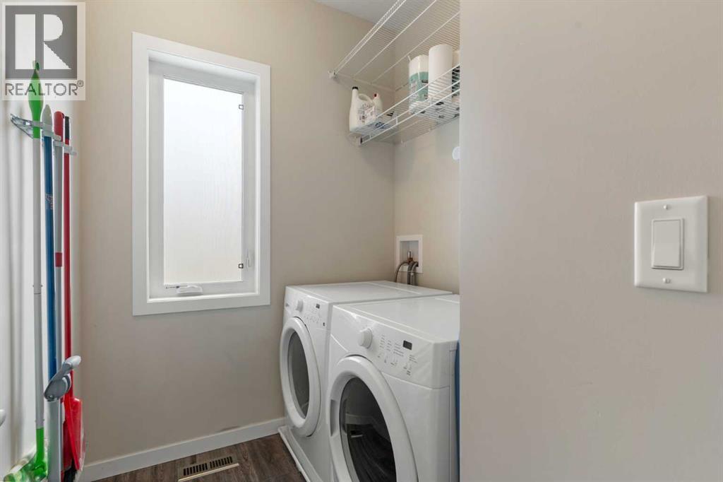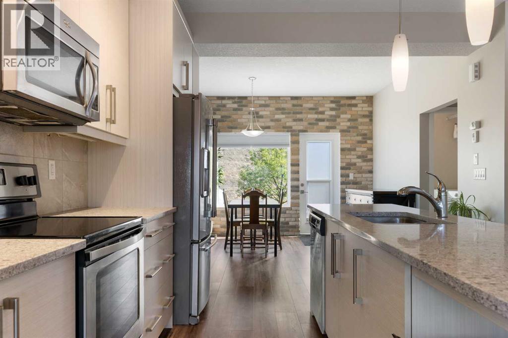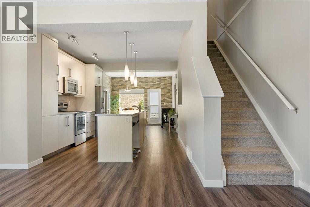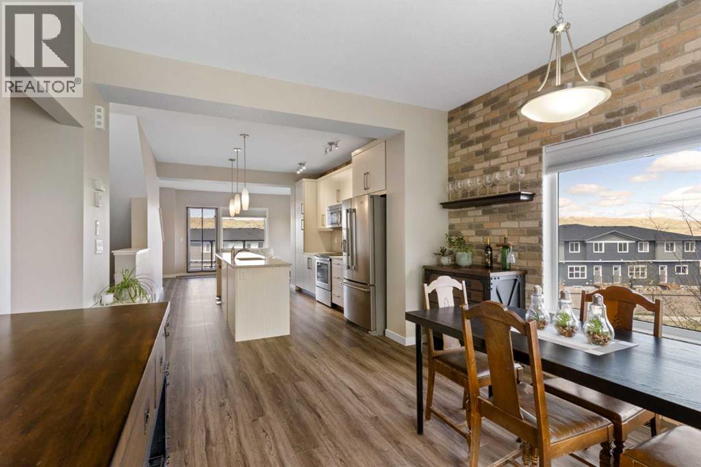 Welcome to this bright and stylish 3-storey corner townhouse in The Rise, backing onto green space for added privacy and natural light. The open-concept main level features a modern kitchen with central island, spacious living and dining areas, brick accent wall, main floor laundry, and A/C rough-in. Enjoy both a front balcony and private rear outdoor space, perfect for relaxing or entertaining.Upstairs offers 3 bedrooms and 2.5 bathrooms, creating one of the most functional layouts in the complex, with elevated views toward Cochrane. The oversized tandem garage comfortably fits two vehicles with extra room for storage.Ideally located close to parks, schools, pathways, and amenities, with quick access to downtown Cochrane, the Jack Tennant Memorial Bridge, Highway 1, and the mountains. (id:51989)