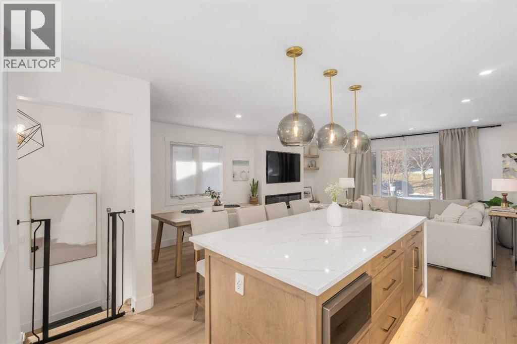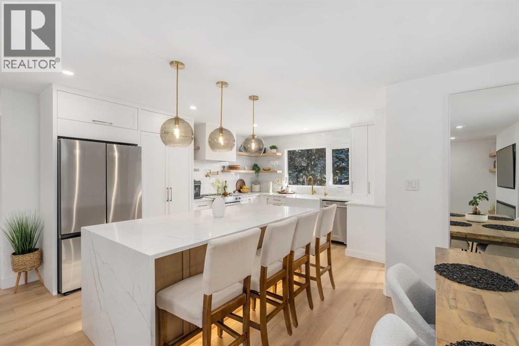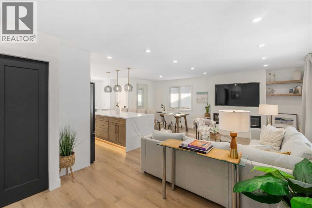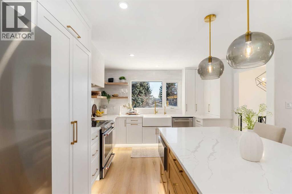 Experience a refreshing new twist on the renovated home—one that honours the original character and thoughtful space planning while introducing a modern design with carefully curated materials and a warm, inviting colour palette. Unlike the typical all-white renovations, this home offers a balanced and sophisticated aesthetic from the moment you step through the front door. The main floor welcomes you with an open and airy layout that seamlessly connects the kitchen, dining area, and living room. At the heart of the home is a beautifully designed kitchen featuring a large centre island—intentionally uninterrupted by sinks or cooktops—allowing the premium quartz surface to shine as both a functional workspace and gathering place. Natural wood grain cabinetry on the island adds warmth and contrast to the elegant off-white upper cabinets. A farmhouse sink provides both style and practicality for handling larger pots and pans, while the window above offers a peaceful view of the spacious backyard. Ample cabinetry ensures plenty of storage, with room to expand if desired. The dining area comfortably accommodates gatherings of eight and flows effortlessly into the living room, where a sleek electric fireplace creates a welcoming focal point. Above the fireplace, a perfectly framed niche offers space for artwork or a mounted television, complemented by wood shelving with integrated lighting. The living room provides a backdrop of large windows that fill the space with natural light. The main level has three bedrooms, including a primary retreat with a convenient 2-piece ensuite and walk-in closet, along with two additional bedrooms located near the stylish 4-piece bathroom. The fully developed basement expands the living space with a large family room and an impressive games and entertainment area complete with a modern wet bar that could rival any downtown lounge. A generous fourth bedroom comfortably fits a king-sized bed with nightstands, and a contemporary 3-piece ba throom completes this level. Outside, the large backyard offers mature trees and a welcoming outdoor space featuring a concrete patio and Rundle rock firepit area—perfect for relaxing evenings or entertaining. Additional features include Central A/C, and an extra-wide double detached garage adds convenience and functionality. Situated in the established community of Canyon Meadows, this home offers excellent access to nearby schools including Canyon Meadows Elementary, St. Catherine Elementary, Robert Warren School, and Dr. E.P. Scarlett High School. Residents enjoy exceptional amenities such as Fish Creek Provincial Park, Canyon Meadows Golf & Country Club, the Canyon Meadows Aquatic & Fitness Centre, Trico Centre for Family Wellness, Southcentre Mall, and Willow Park Village. Commuting is effortless with convenient access to Macleod Trail, Anderson Road, and Stoney Trail, along with a short walk to the Canyon Meadows LRT Station. (id:51989)
