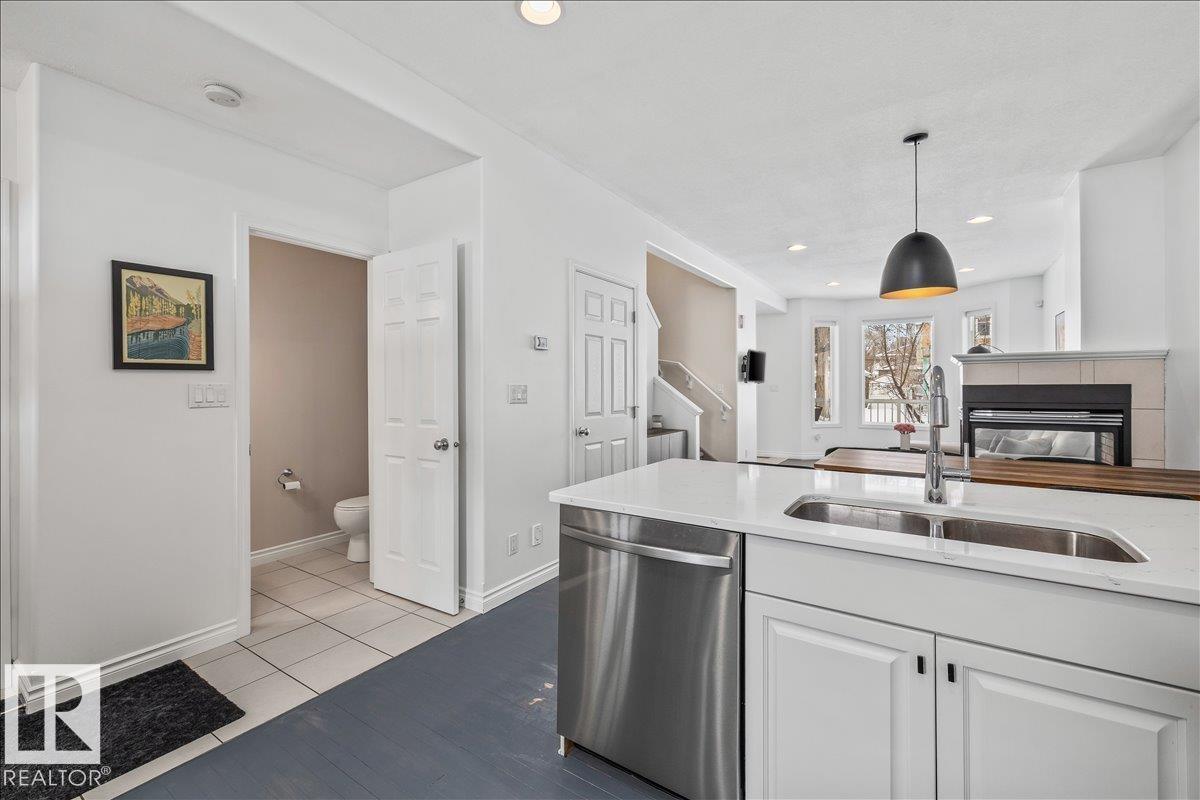 Beautifully maintained 2 storey townhouse tucked away on a quiet, tree lined street near Faculté Saint Jean, Mill Creek Ravine, & Whyte Avenue. Offering 3 bedrooms, 3 full bathrooms, 1 half bathroom, air conditioning, finished basement, and a double detached garage, this home combines space & functionality in a prime central location. The open concept main floor features large front windows, hardwood flooring, and a 3 sided fireplace. The kitchen includes quartz countertops, ceramic tile backsplash, stainless steel appliances, pantry, & access to the south facing backyard deck. Upstairs offers 3 spacious bedrooms including the primary suite with a 3 piece ensuite, plus a 4 piece main bath. The finished basement provides a versatile flex space for a home office, gym, or additional living area, along with a 4 piece bathroom, laundry, and extra storage. Enjoy the low maintenance south facing backyard complete with deck and pergola. A rare opportunity in one of Edmonton’s most sought after central locations. (id:51989)
