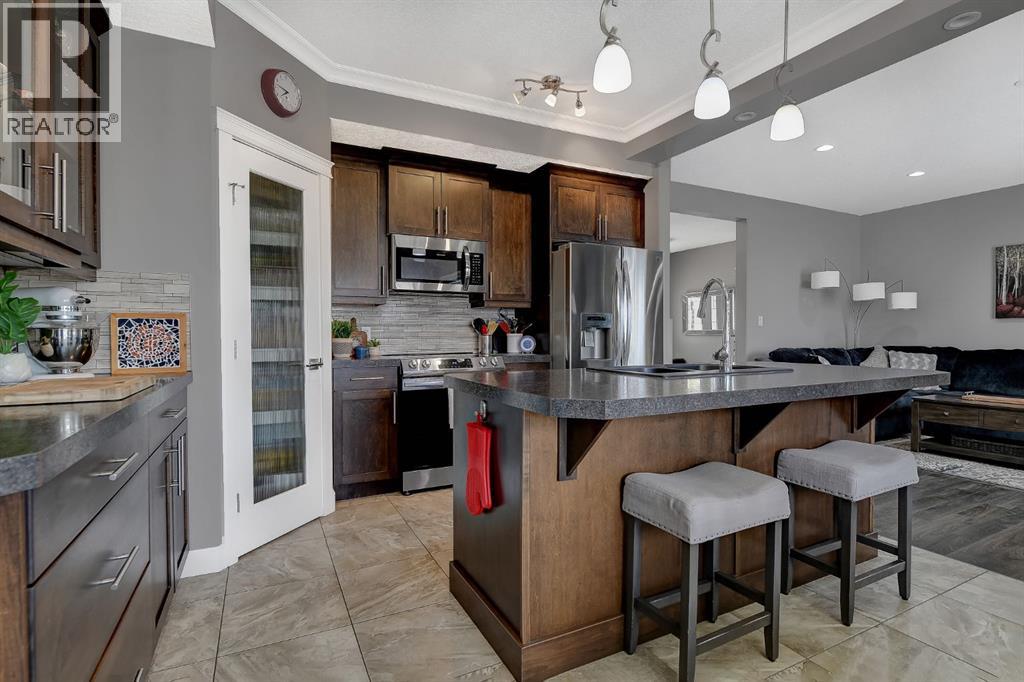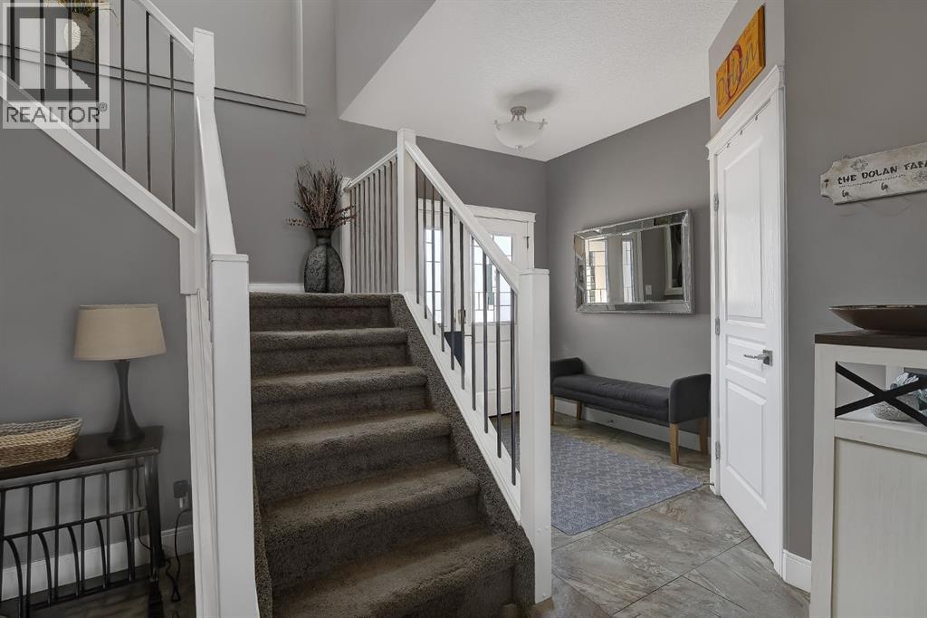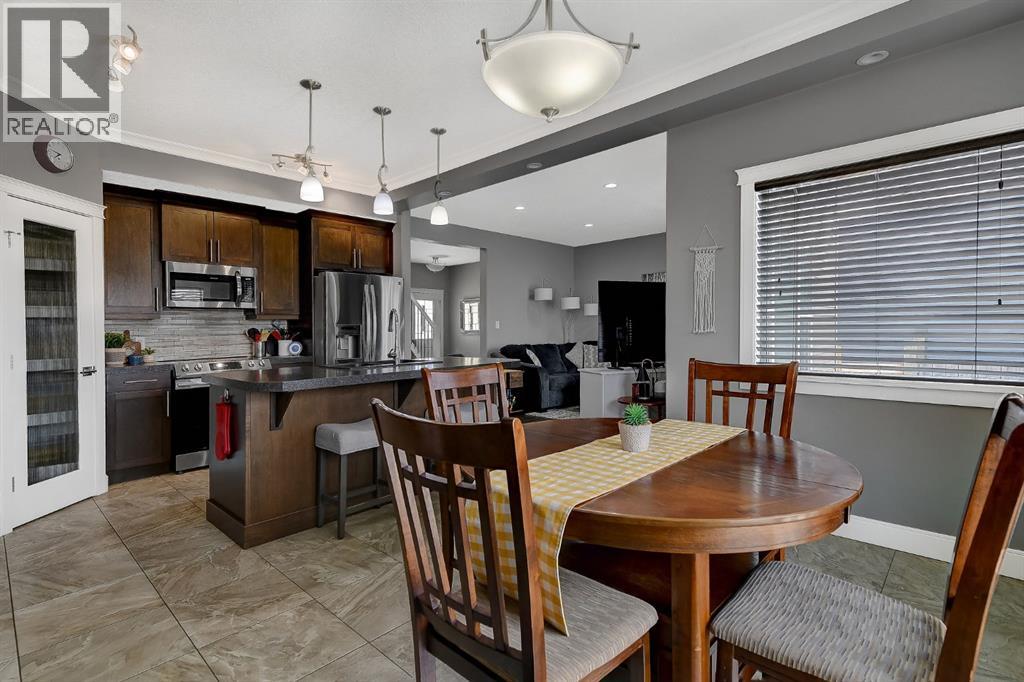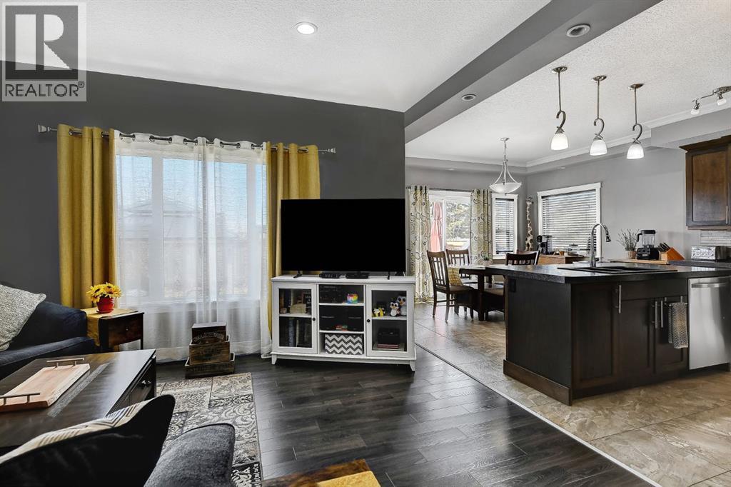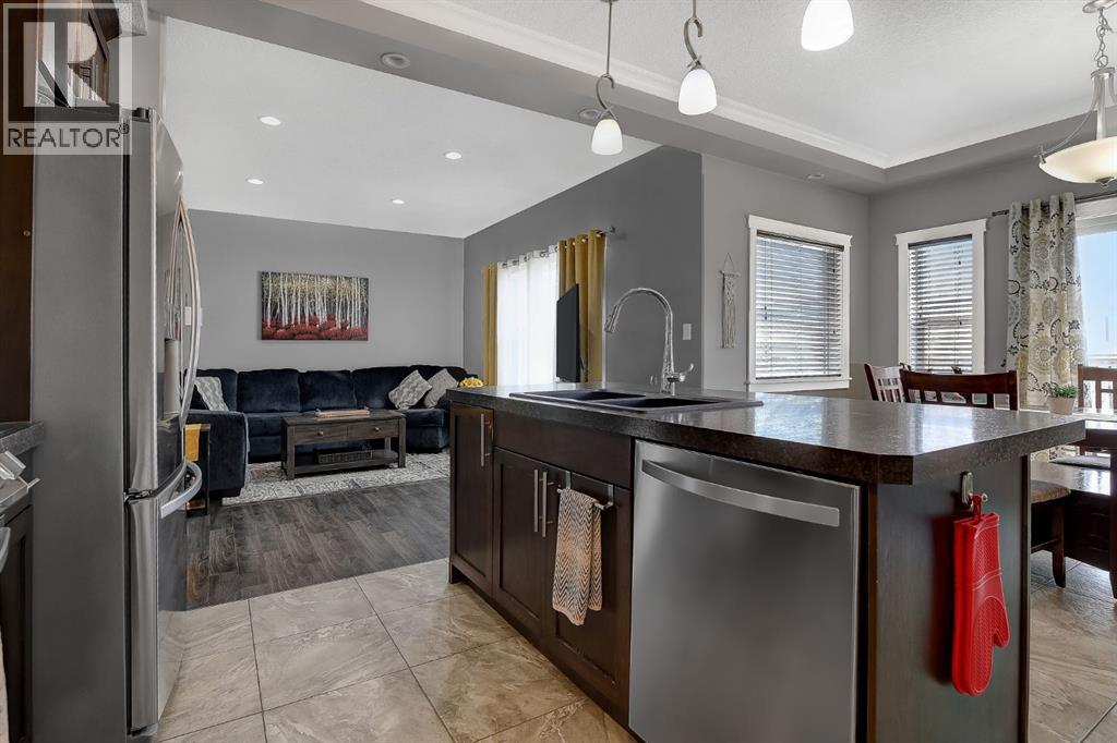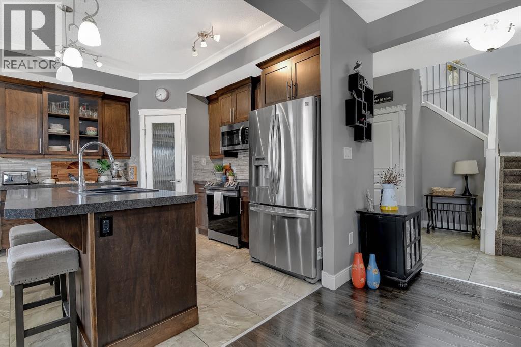 Welcome to this beautifully maintained 2-storey home, built in 2014 and proudly owned by its original owners. Offering 3 bedrooms and 2.5 bathrooms, this home showcases a warm, modern brown palette throughout, creating a timeless and inviting feel. The heart of the home is the chef’s kitchen, featuring soft-close cabinetry, under-cabinet lighting, stainless steel appliances, and generous countertop space—perfect for both everyday living and entertaining. The open-concept layout flows seamlessly into the main living areas, complemented by the convenience of main floor laundry. Upstairs, the spacious primary bedroom offers a true retreat, complete with a tasteful 5-piece ensuite featuring his and hers sinks, a tiled shower, and plenty of room to unwind. Step outside to your recently completed backyard oasis—designed for relaxation and enjoyment—with a beautiful combination of brick and wood patio space, a charming gazebo, washed rock, mulched flower beds, a newer shed, and a deck with practical under-deck storage. The yard is fully fenced with a gate, ideal for families, pets, or added privacy. The attached double car garage is fully finished, heated, and bright—perfect for Alberta winters. Additional features include central A/C to keep you cool during warm summer days and a basement that’s ready for your future development. This home checks all the boxes—style, comfort, and functionality. (id:51989)