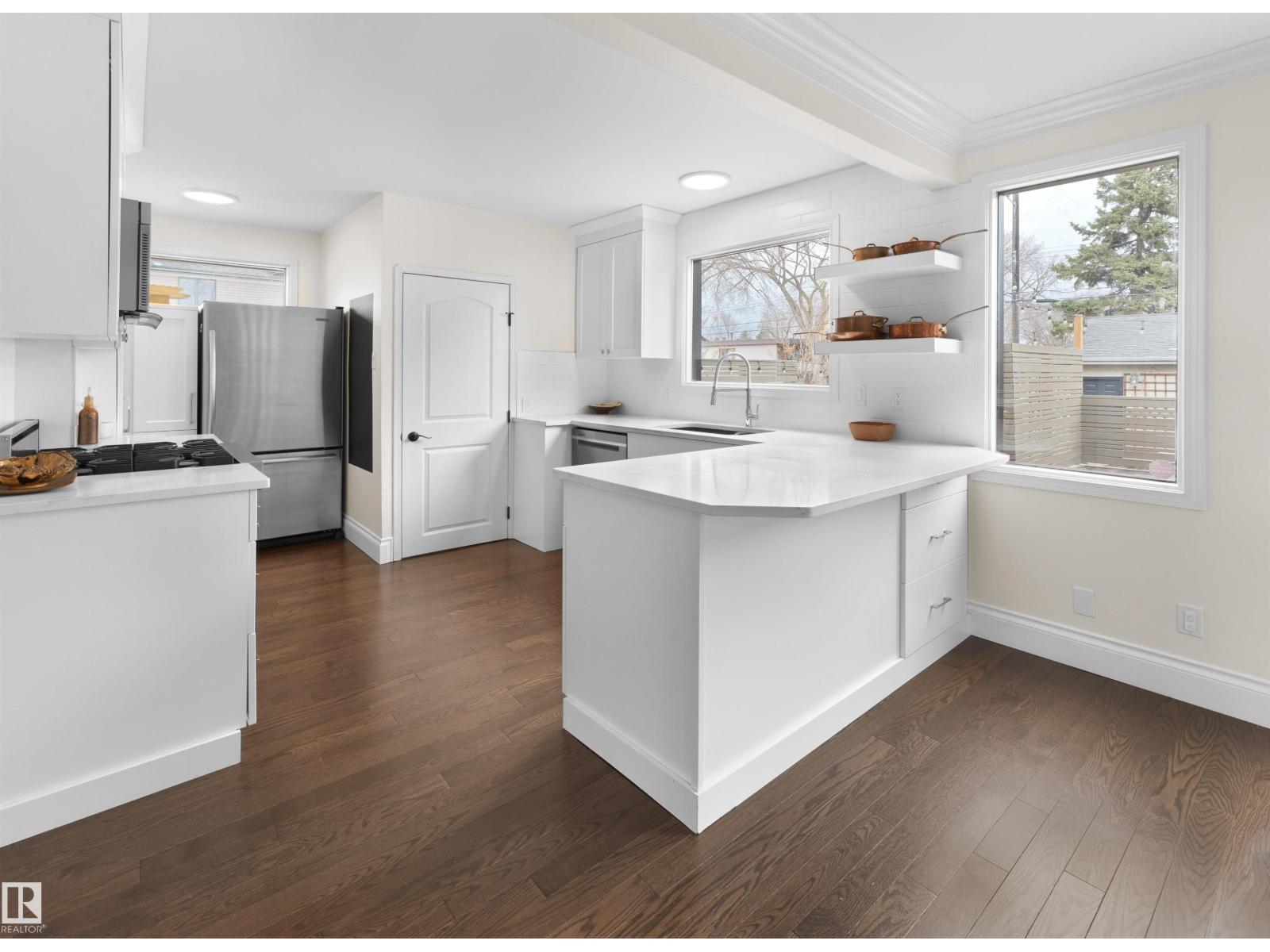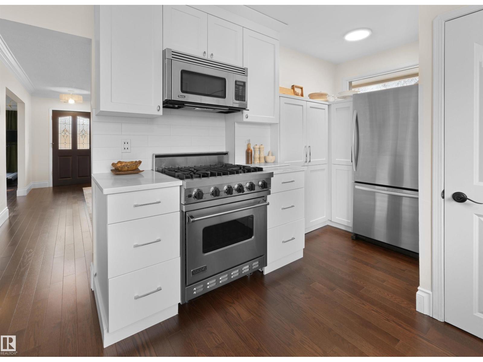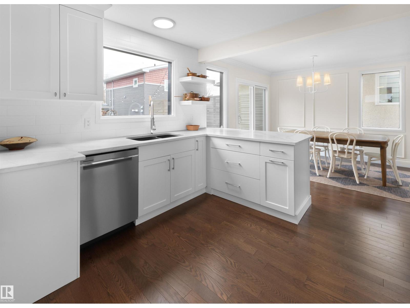 Steps to Mill Creek Ravine, this King Edward Park corner lot home is the one you've been waiting for. Hardwood throughout, soaring natural light & a stunning white quartz kitchen w/ Viking gas range open to the dining space & private deck for effortless indoor/outdoor living. Main floor also offers a large living room, 2pc bath & family room w/ fireplace. Upstairs: primary bedroom w/ his & hers closets, reading nook, two more generous bedrooms, laundry & renovated 4pc bath w/ heated floors. Basement features a bright rec room w/ full kitchen, large bedroom, full bathroom, den/storage & private side entrance. Outside: tiered backyard w/ beautiful deck, mature landscaping & oversized detached double garage. Mechanically loaded: two furnaces (2025), A/C (2024), hot water tank (2024), new exterior water & sanitary lines (2025), & aluminum cladding on all doors & windows (2025) . Homes like this don't come up often in King Edward Park. The owners have loved it. You will too. (id:51989)