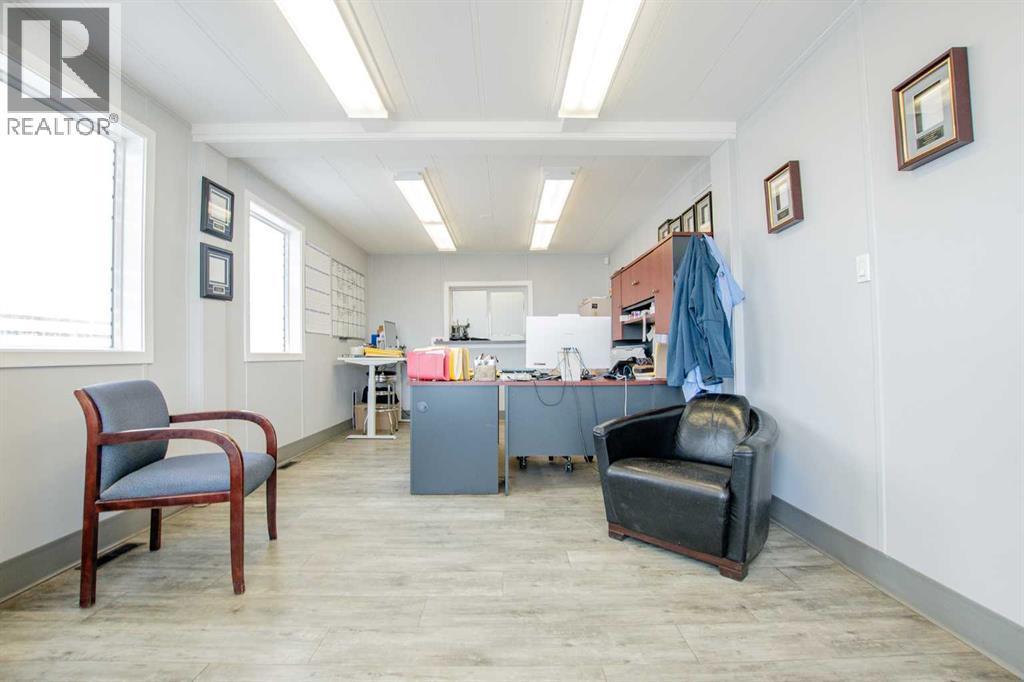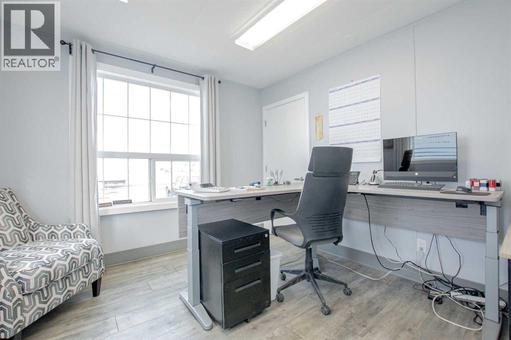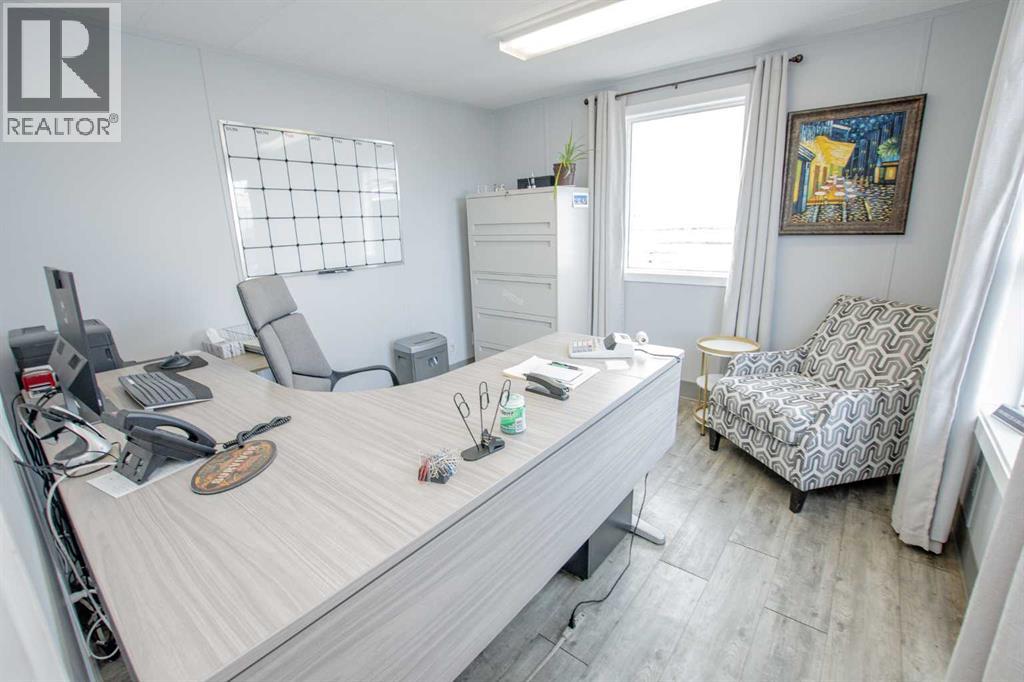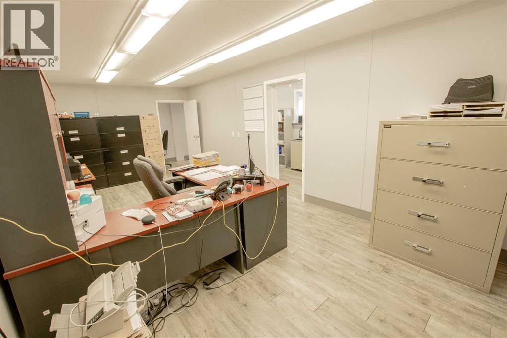 Situated on 1.2 acres, this versatile commercial property features a 4,000 sq ft warehouse/shop and a separate 2,000 sq ft office building, all within a fully fenced yard.The warehouse, constructed in 2003 by HWD Construction, offers two 14' x 14' overhead doors with side-mount openers, two man doors, radiant heat, a sump, and updated lighting. The structure is also designed to accommodate a future mezzanine if desired.The office building is well laid out with a reception area, three private offices, a large bullpen workspace, lunchroom, two washrooms, and a live-in suite. The generously sized rooms provide flexibility and can be reconfigured to suit a variety of business needs. Additional features include air conditioning and a rear deck.Recent upgrades include new shingles on both the shop and office buildings. This one checks all the boxes: yard space, shop space & office space. Contact your commercial Realtor to view this desirable property. (id:51989)