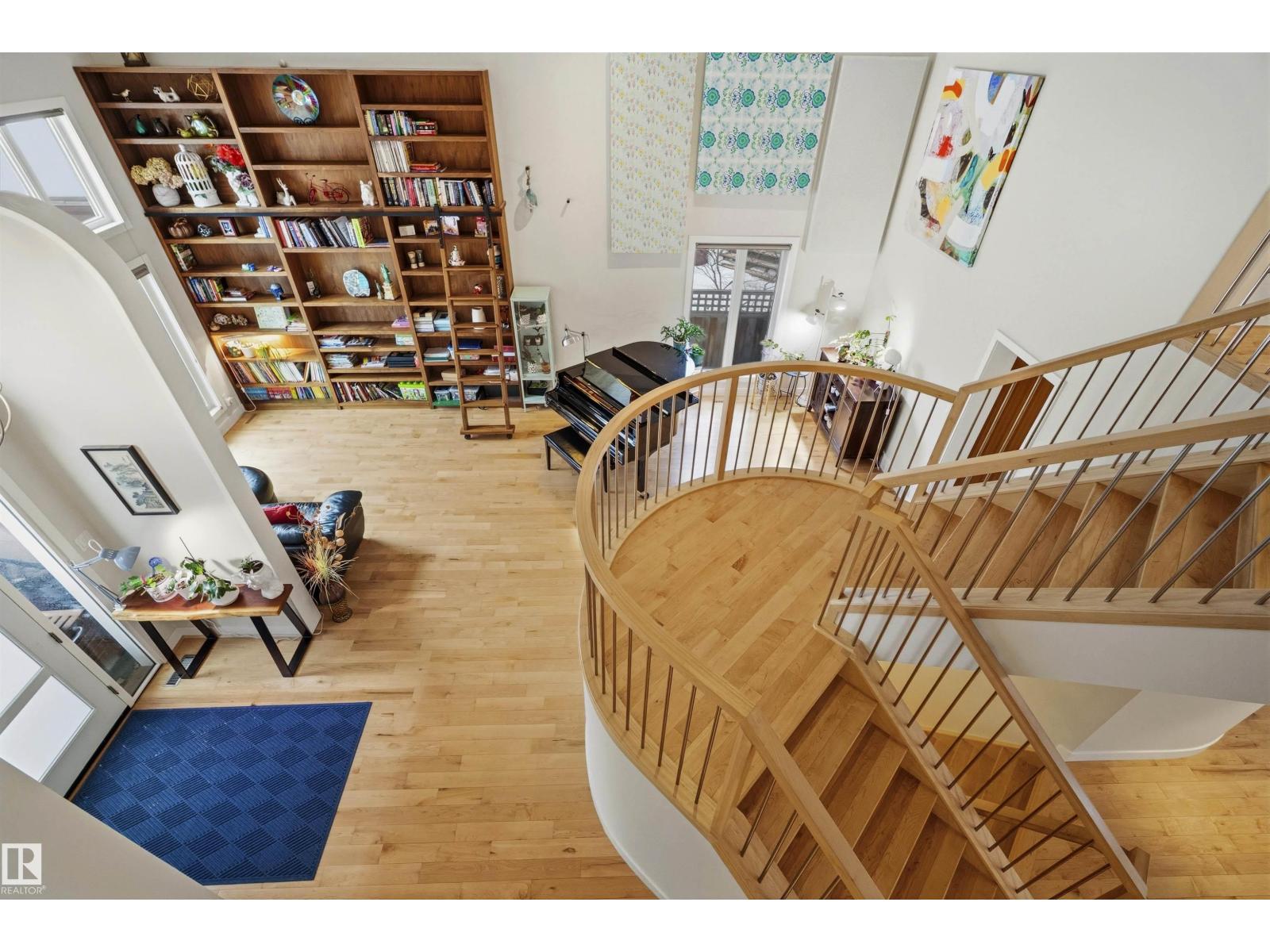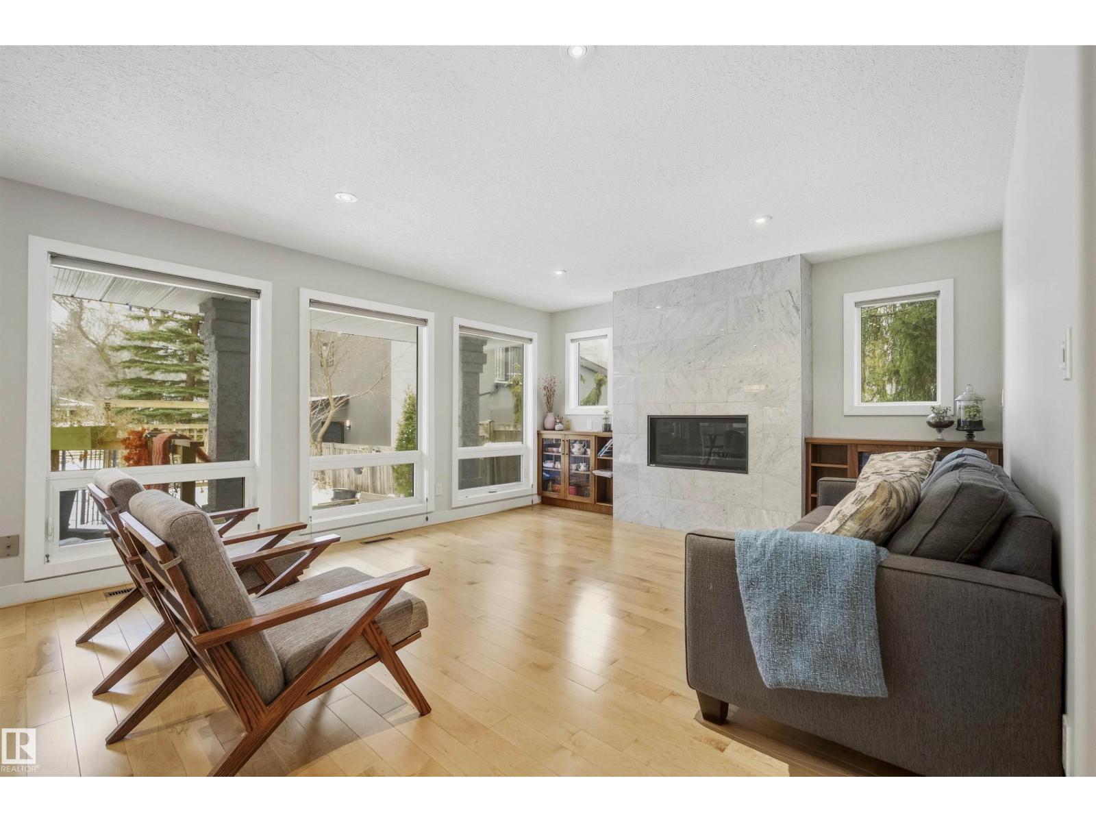 Modern traditional 2-storey in the heart of Bonnie Doon, steps to Mill Creek Ravine. Offering over 4,000 sq ft of living space, the warm hardwood floors and elevated modern finishes carry through every level. Soaring 20 ft ceilings, stacked windows, and open staircase create a dramatic first impression. The kitchen features quartz countertops, stainless steel appliances, and flat-panel cabinetry, flowing into the dining area with patio doors to a tree-lined yard and entertaining deck. A second living room wrapped in windows with a gas fireplace anchors the main floor, alongside an office and mudroom with access to the double attached garage. Upstairs, the primary retreat impresses with a spa-inspired ensuite and walk-in closet, joined by two additional bedrooms, a 5-piece bath, and laundry. The lower level has a family room with wet bar, gym space, 4th bedroom, full bath, and storage with garage access. Set on an expansive 50x185 lot — steps to schools, ravine trails, and the best of Bonnie Doon living. (id:51989)