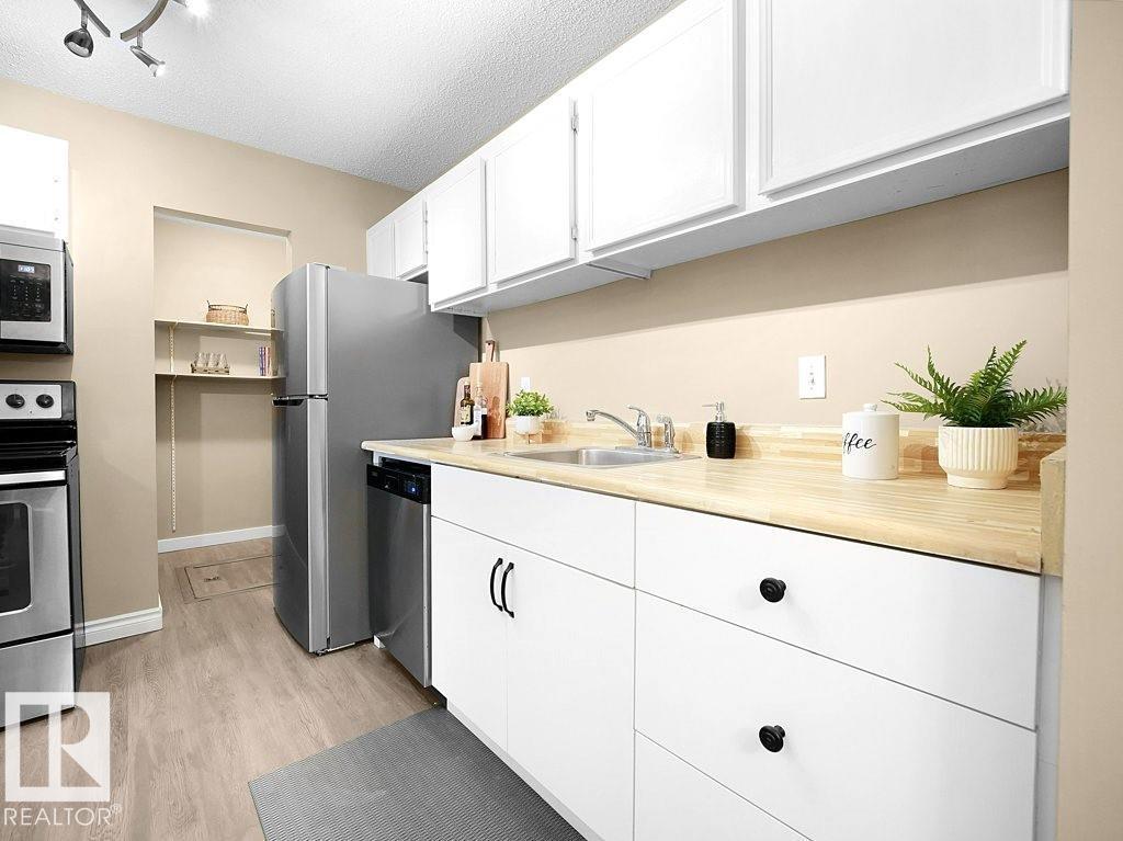 Bright Main Floor 2 Bedroom Condo. Prime West End Location - South-facing with Loads of Natural Light. *Primary Bedroom with Walk Through Closet, Leads to Completely Reno'd/Updated Bathroom with Ceramic Tile Surround & Chic Vanity. Second Bedroom with French Door Opening to Living Room - also Works as Den/Office. Stainless Steel Appliances, Large Walk-in Pantry & Dining Room. *Warm Neutral Tones, with Newer Paint & Vinyl Plank Flooring Throughout. Wood Burning Fireplace in Living Room. *Large Personal Storage Room & Visitor Parking Only Steps Away. Walking Distance to West Edmonton Mall, Shopping, Transit & Park. Enjoy. (id:51989)