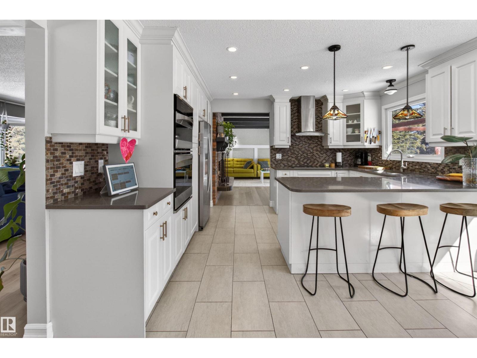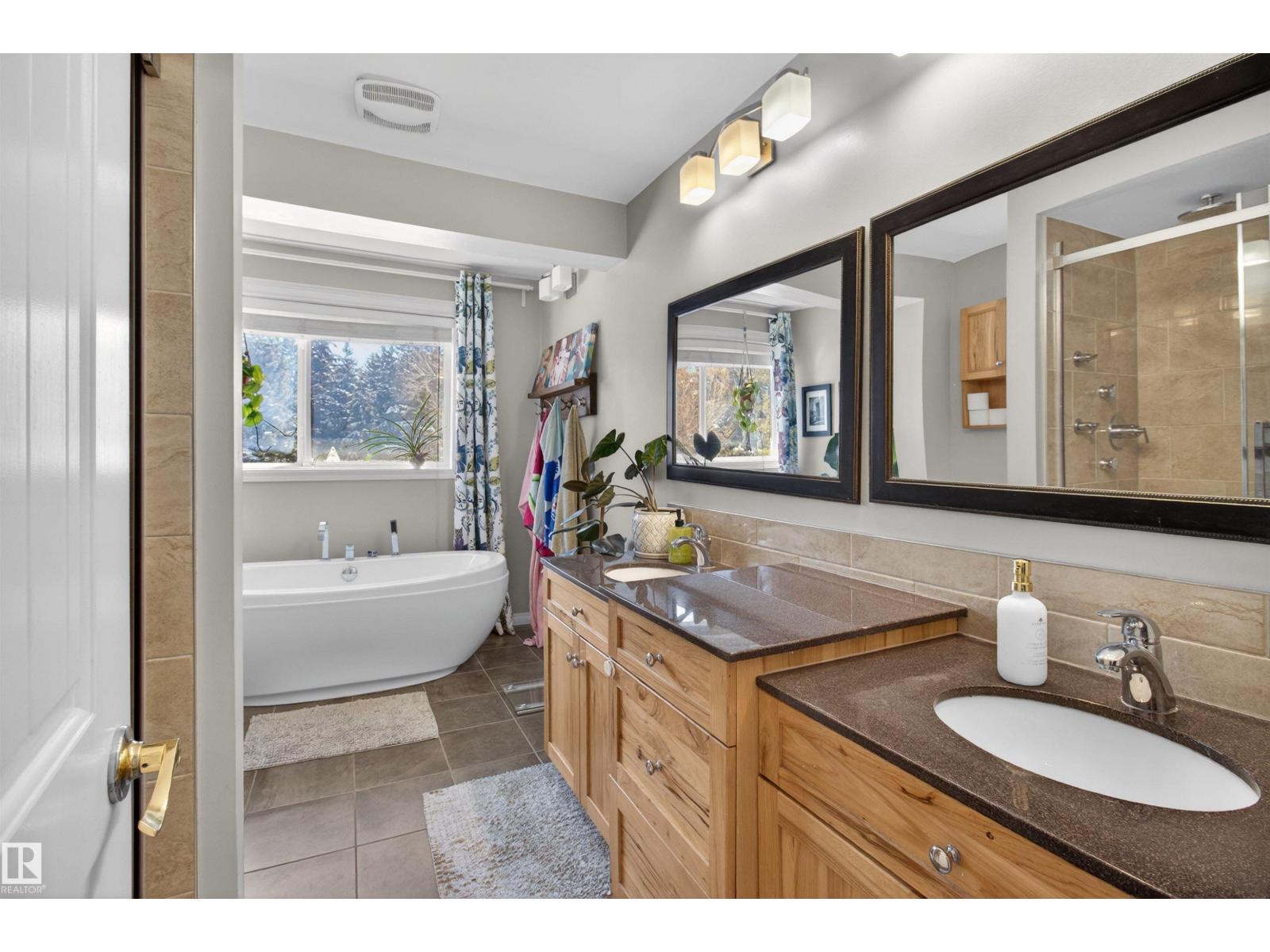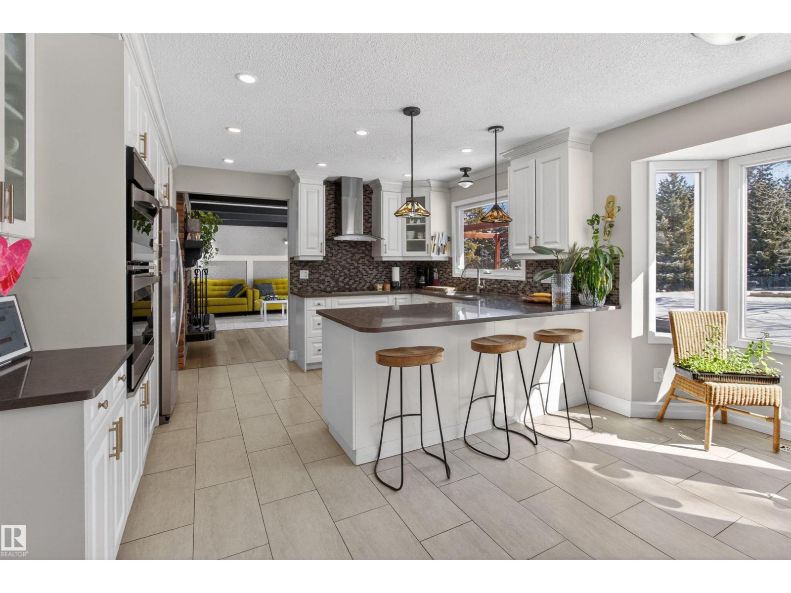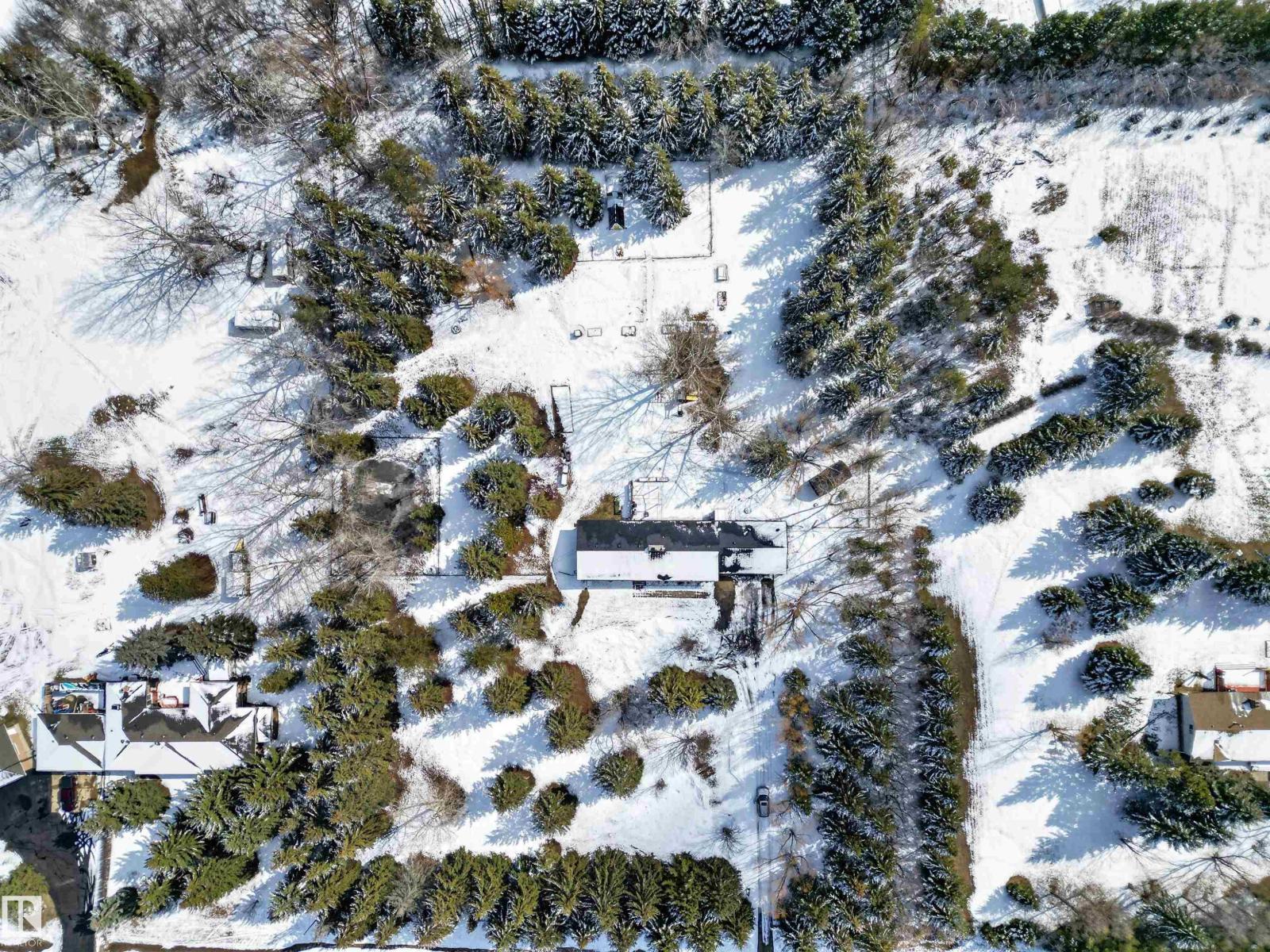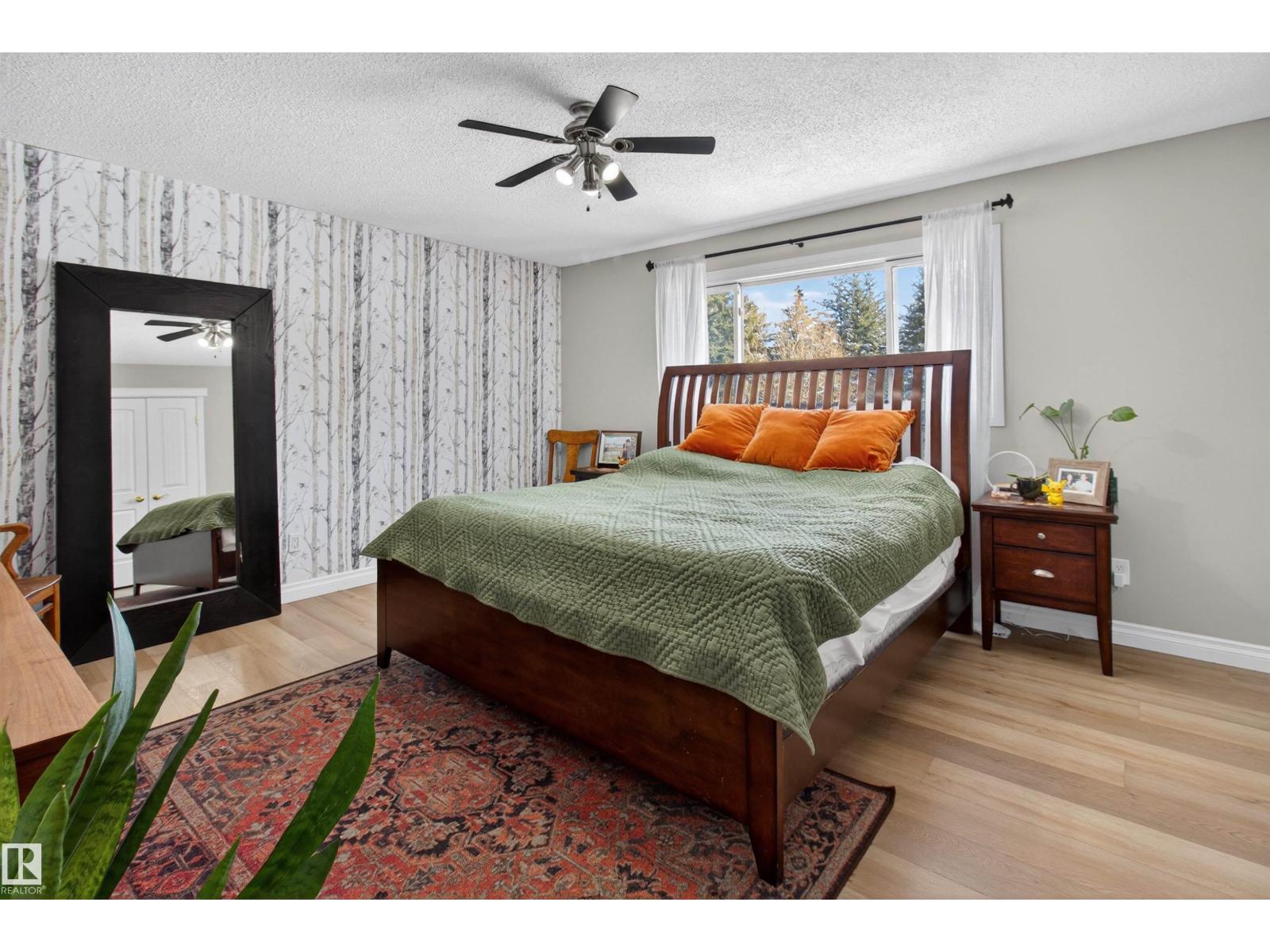 RANCH-STYLE BUNGALOW IN SUN HILL ESTATES! Less than 5 minutes to Sherwood Park! MUNICIPAL WATER! Enjoy this private retreat situated on 2.99 ACRES, surrounded by mature spruce trees. Fabulous open floor plan with over 4000 SQ FT of total living space! Bursting with natural light! Newer luxury vinyl plank flooring. Large entry way and a spacious living room with wood-burning fireplace. Huge dining area with built-in cabinetry. You'll LOVE the STUNNING KITCHEN! Beautiful cabinetry, granite countertops & stainless steel appliances. 5 BEDROOMS! Huge Primary Bedroom & 3 closets! 5-piece bathroom with soaker tub. Main floor laundry, 2 bedrooms & a 2-piece bathroom. Fully finished basement with huge Rec room, wet bar, gas fireplace, 2 additional bedrooms and a 5-piece bathroom. Upgraded furnace, tankless hot water, some newer windows and central AIR-CONDITIONING too! Septic tank & field. OVERSIZED & HEATED GARAGE! Enjoy the beautiful park-like backyard with deck. An amazing home and location for acreage lovers! (id:51989)