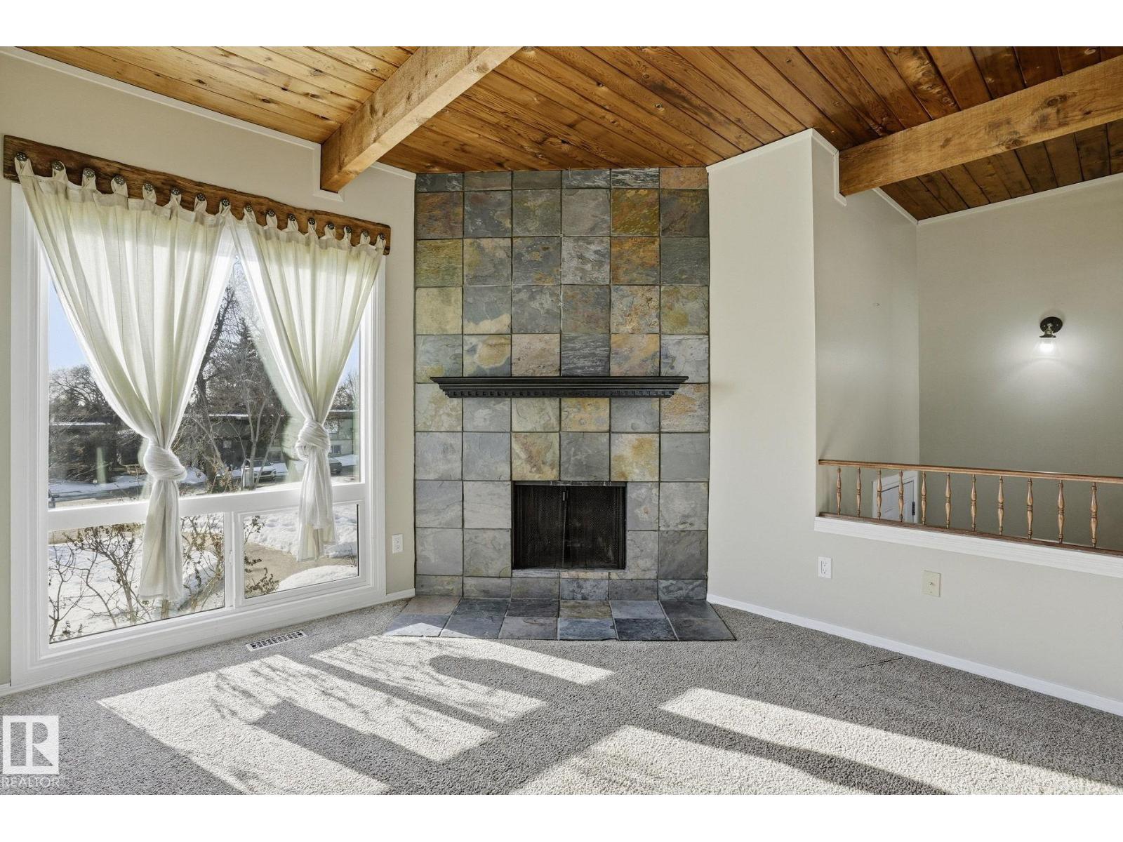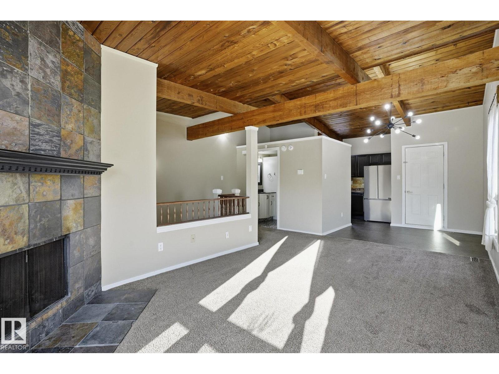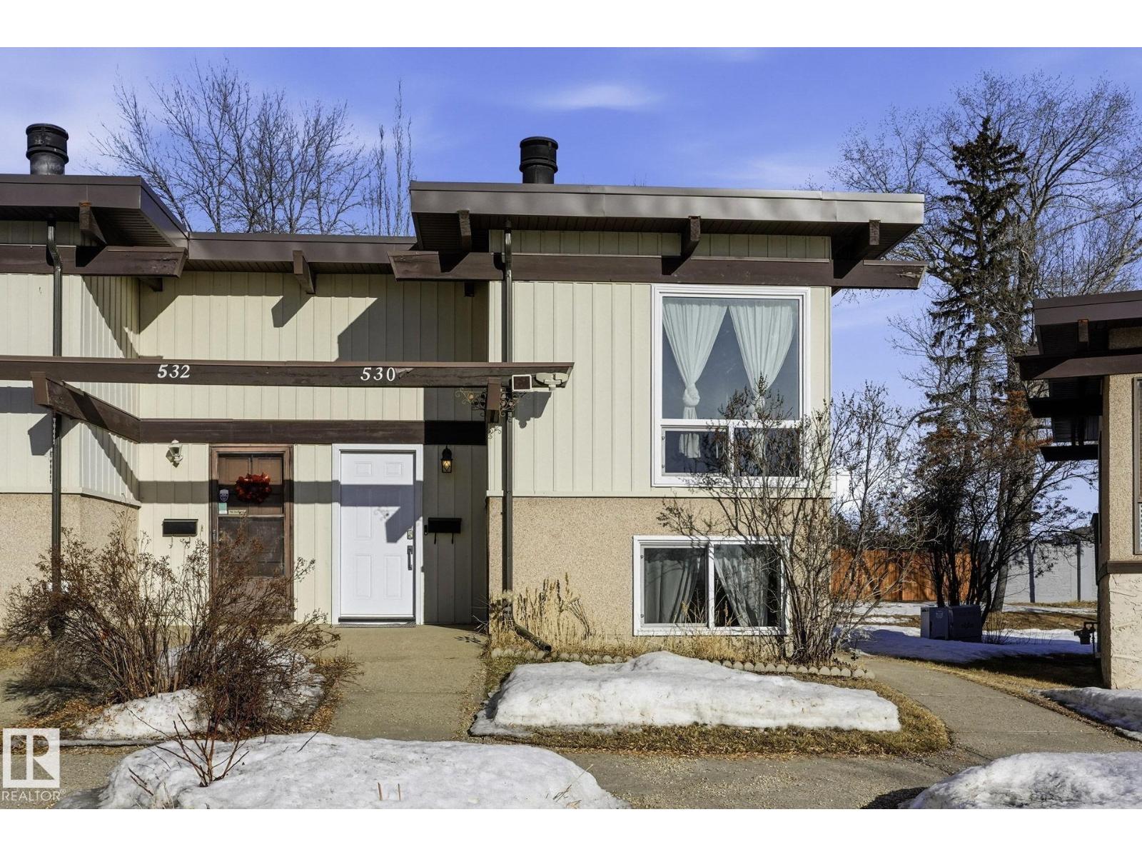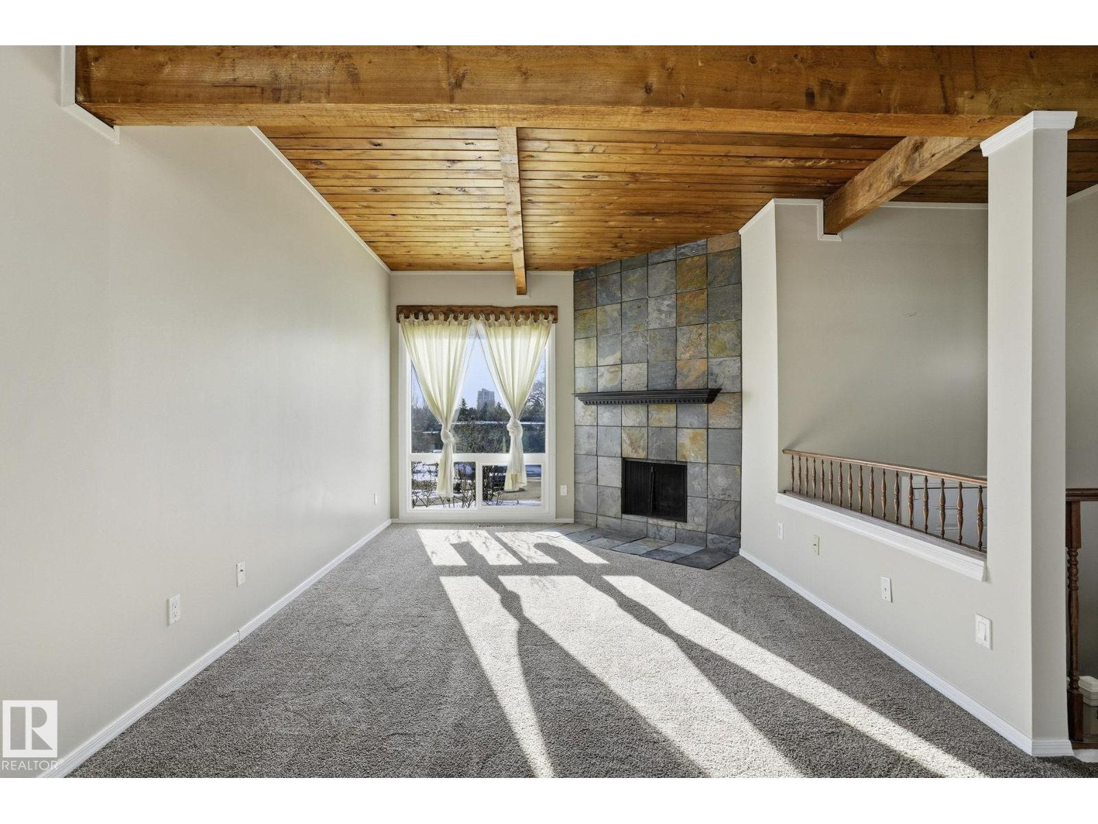 Welcome home ! cozy upgraded home with vaulted open beam cedar ceilings , rustic touches , large newer bright windows and wood burning fireplace , recent upgrades include newer windows , front door , new fridge , new hot water tank , new furnace , tile in bathroom , an extensive maintenance list including replacing tub cartridges , seats and diverters , clean and paint furnace room floor, recalk tub , etc. etc., Very peaceful location , backing onto a greenbelt with large trees in a quite neighborhood, steps away from new LRT, shopping malls , schools , parks and playgrounds , your new home awaits (id:51989)