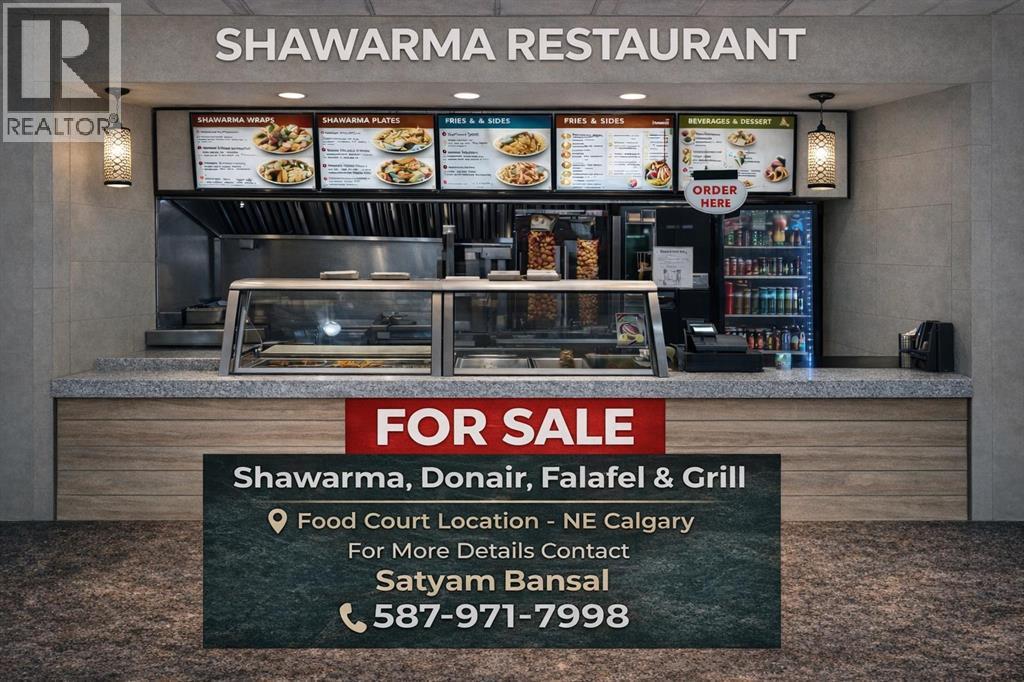 Excellent opportunity to acquire a well-established shawarma restaurant located in a busy mall food court in NE Calgary. This 470 sq. ft. turnkey operation is fully built-out and ready for a new owner to take over with minimal downtime.The business offers a popular menu including shawarma, donair, falafel, and grill items, serving both dine-in and takeout customers. The location benefits from consistent foot traffic within the mall, providing steady exposure and customer flow.Current lease includes 4 years remaining with an option to renew, offering long-term stability.This opportunity is ideal for an owner-operator or investor, with flexibility to bring your own brand and concept or continue operating as is in a proven location.Confidential listing – further details available upon request. (id:51989)